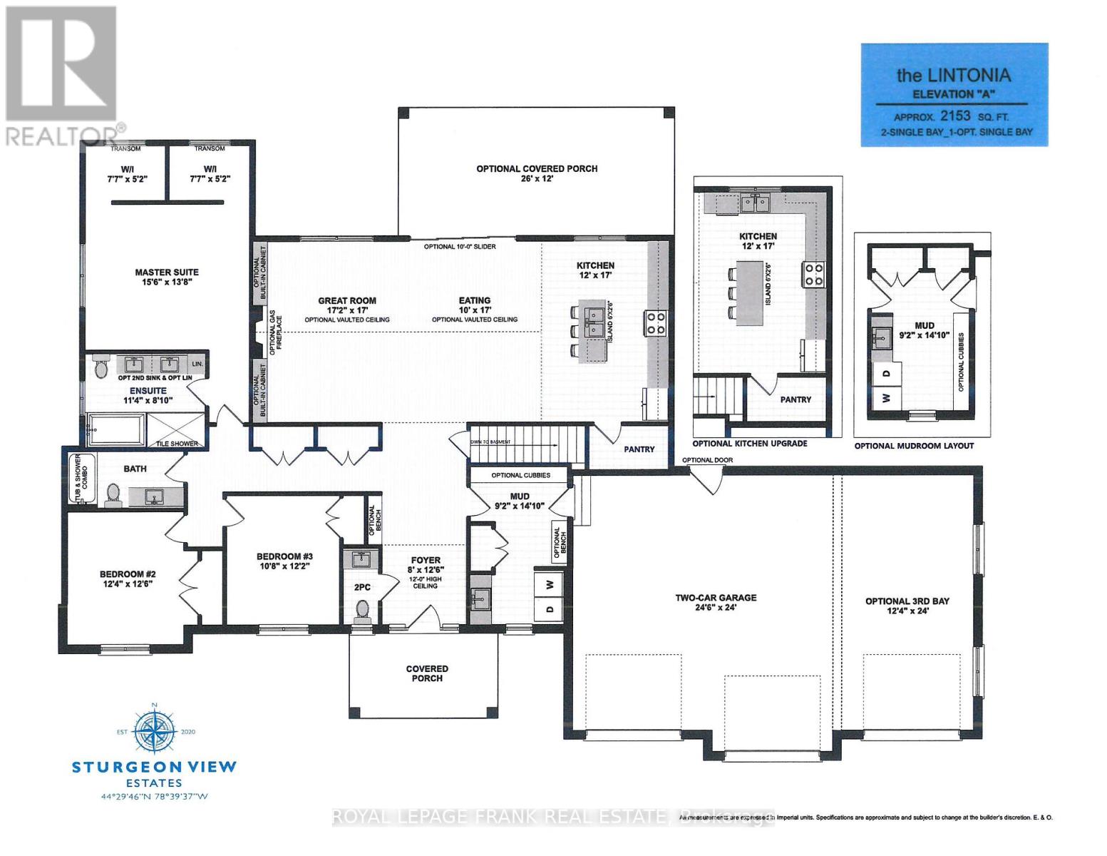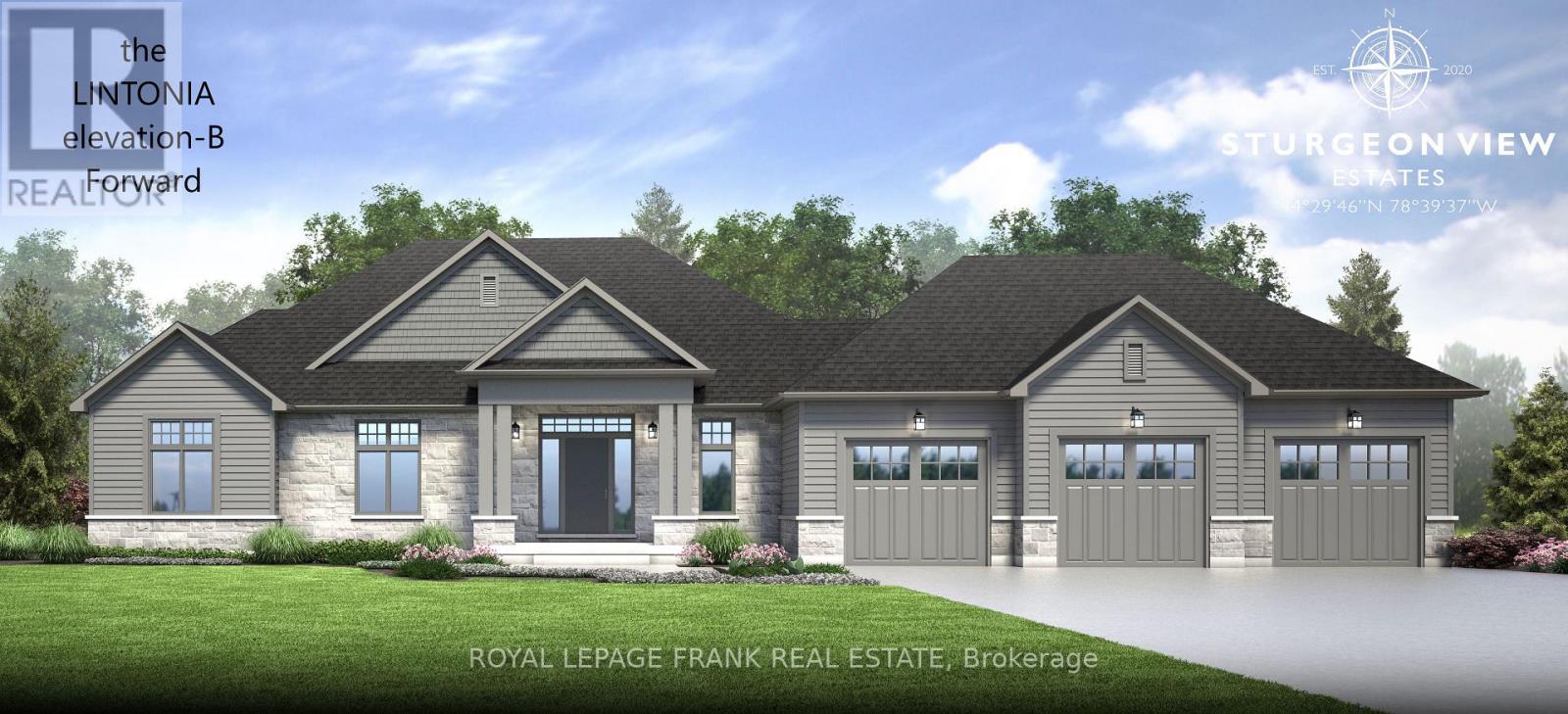 The Lintonia a masterpiece offering 2153 sq.ft. Elevation A, forward facing, double car garage. Exterior options of stone and brick and triple car garage are available as an option. Several Elevations to choose from. Open concept Great Rm. and Dining area featuring gleaming hardwood floors. Kitchen features quartz countertops, with Breakfast Island and walk in pantry. 3Bedrooms, 2-4piece baths, and a Powder Room with a conveniently located mud room, Laundry off of garage entrance. Very private lot located at end of cul de sac lined with trees on one side, and forest view out front of home! Sturgeon View Estates offers a community dock that is 160'tied to the block of land known as 27 Avalon. This block is under POTL, projected monthly fee$66.50. All homes are Freehold and on a municipal road leading through site. We have several Models and lots available, and several Models occupied and enjoying the community of Sturgeon View Estates. Located between Bobcaygeon and Fenelon Falls, enjoy all the Trent Severn has to offer. 5 minutes from Golf and Spa. Book your tour of the site and plan for your dream home. The picture is The Lintonia Elevation B double car side garage. The Model offered is Elevation A, forward facing, double car garage. (id:64974)