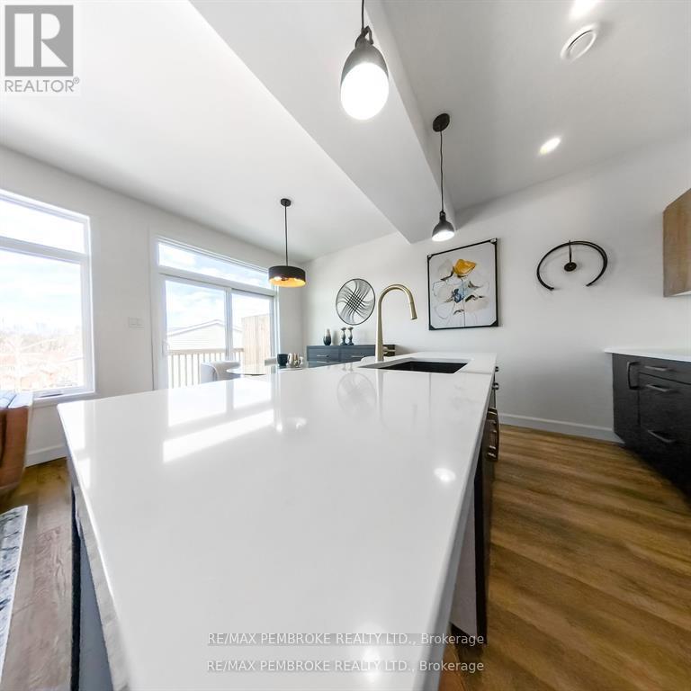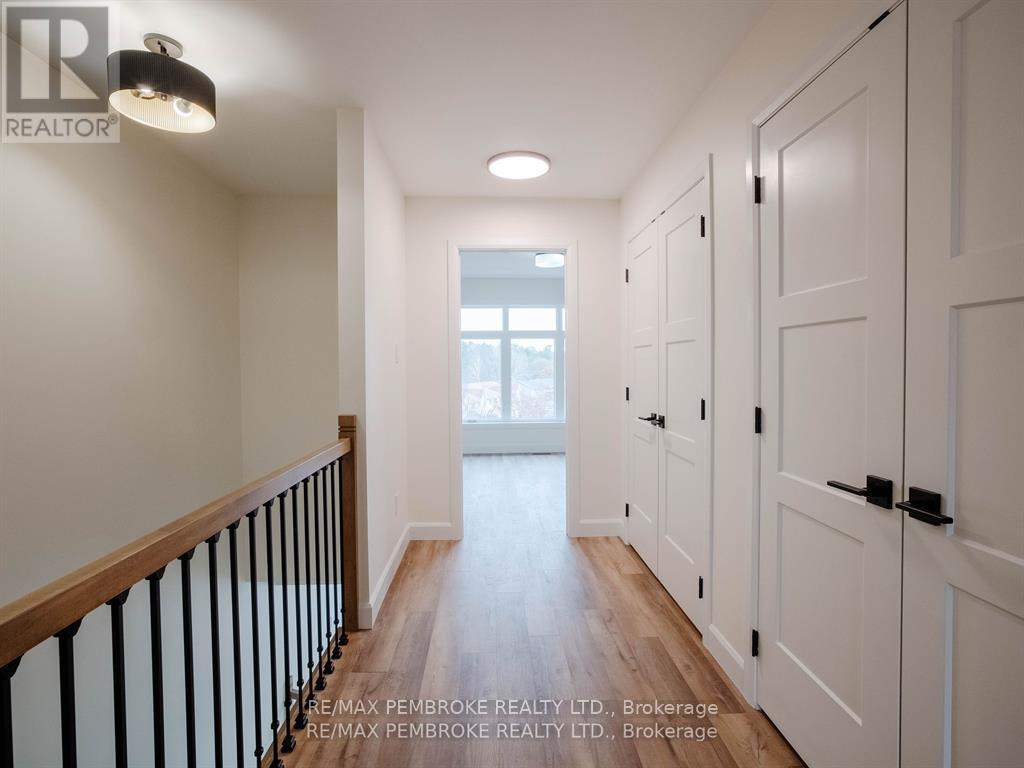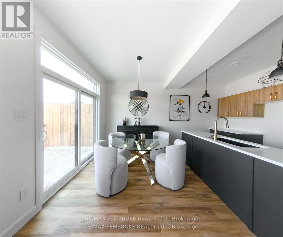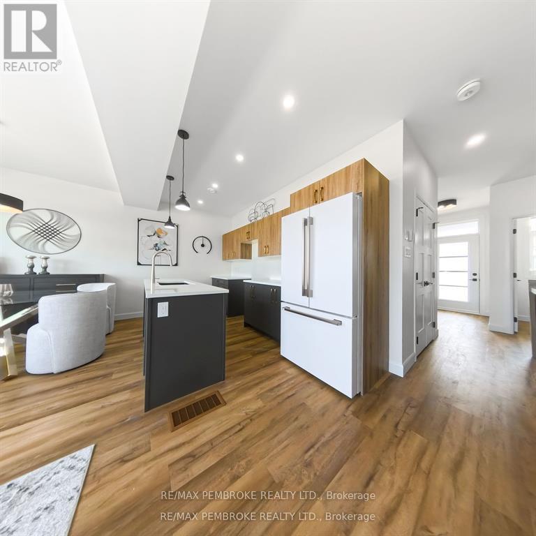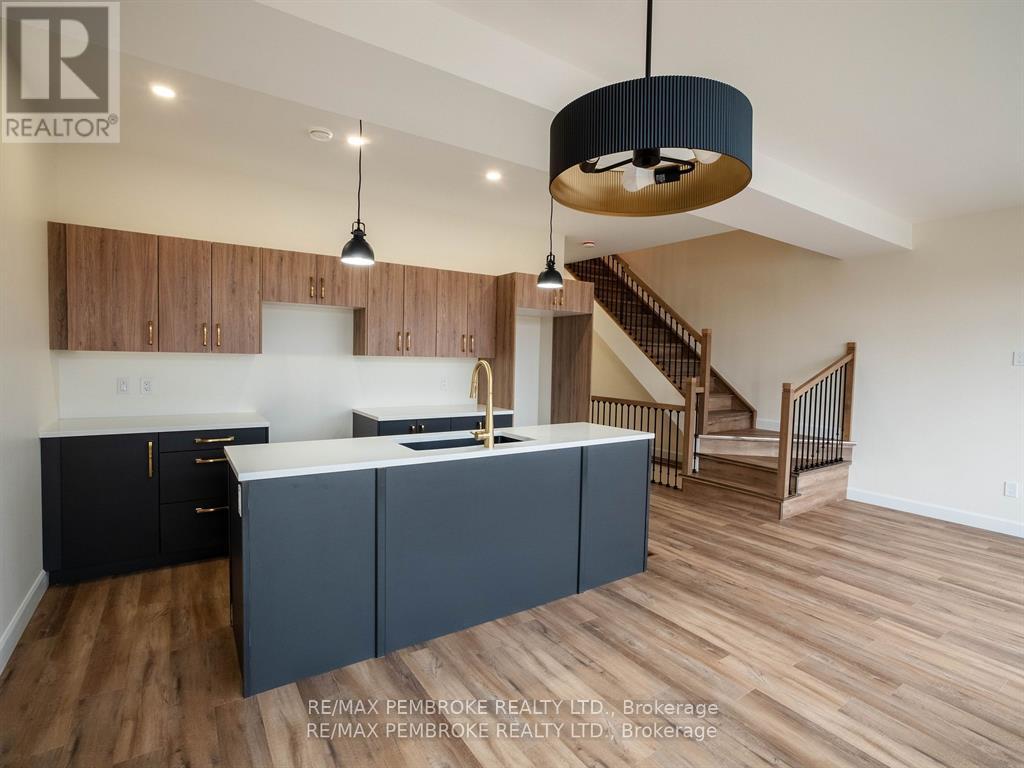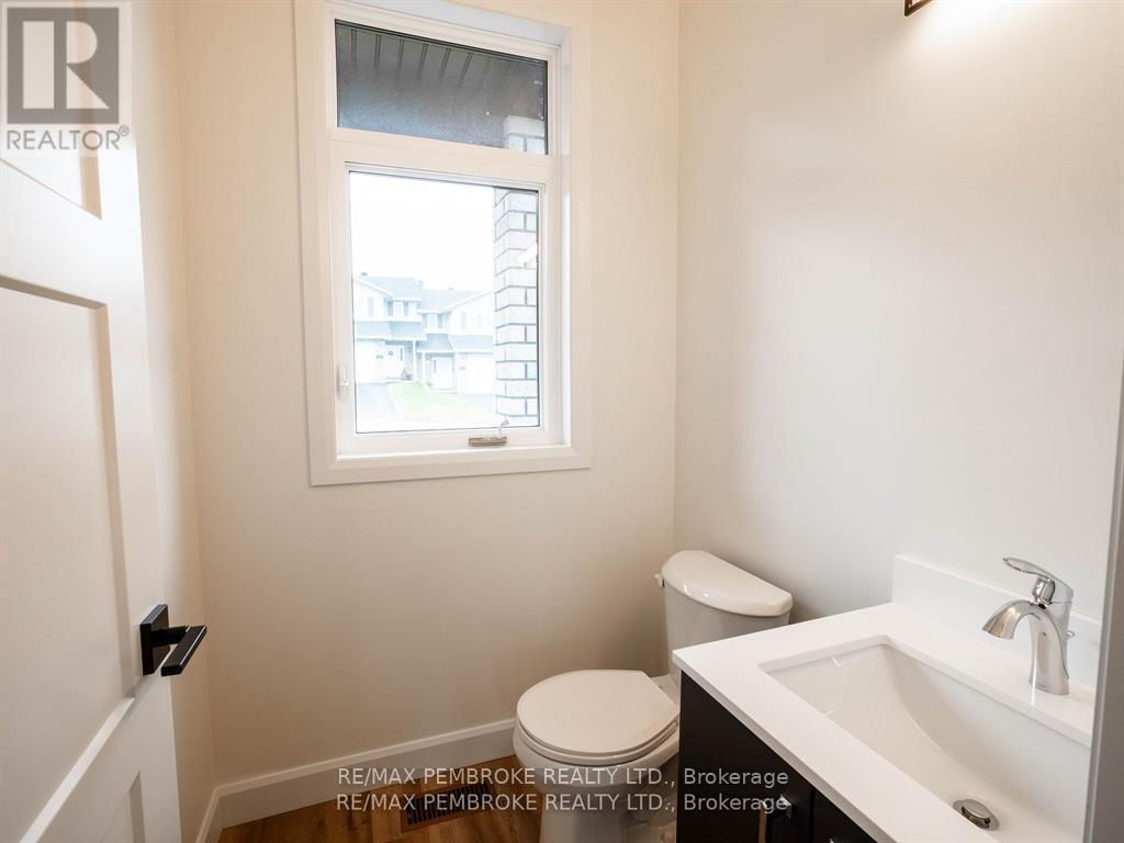 This newly constructed walk out basement 3 Bedroom with 4 bathroom two-story executive style townhouse with a fenced backyard in Petawawa offers modern chic living at its best. The main level features a bright open-concept kitchen, living, and dining area, with sleek quartz countertops, ample kitchen storage, and a lovely deck off the living space, perfect for outdoor relaxation. Upstairs, the spacious primary bedroom includes a walk-in closet with shelving and a private ensuite, while two additional bedrooms, a full family bathroom, and a convenient laundry room complete the floor. The lower level boasts a finished walkout basement with a spacious family room, and a powder room with stylish cabinetry. With modern finishes, matching vinyl flooring throughout and thoughtful design, this brand new home offers everything you need for comfortable, simple, low maintenance and stylish living. Walking distance to trails, Petawawa point, catwalk and shopping. EXTRAS: fenced yard,Quartz in kitchen and bathrooms, vinyl floor stair case, vinyl bedrooms metal railings, finished basement, eavestroughs, brick pillar, garage door opener, upgraded garage door, bathroom counters, brick on front, deck, closet shelving, HWT owned. Appliance allowance can be added to price. Purchase price includes HST with rebates signed back to the Builder. Full Tarion Warranty (id:64974)