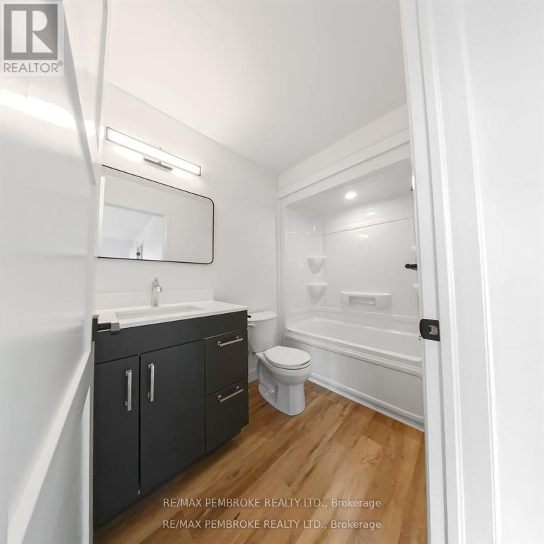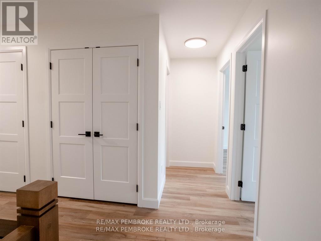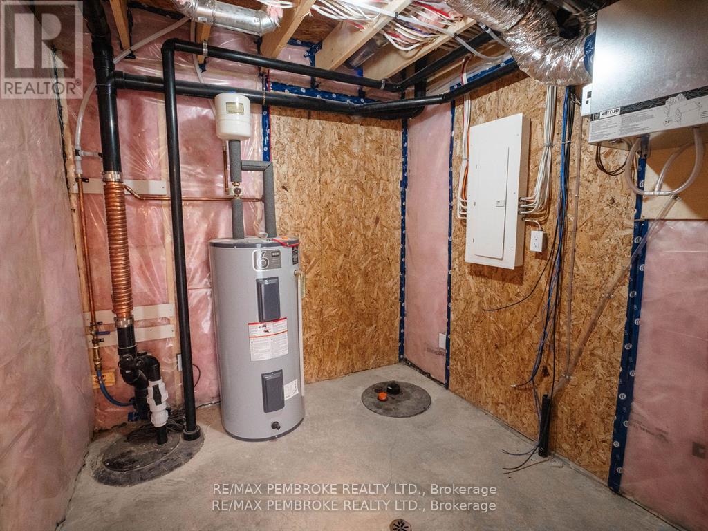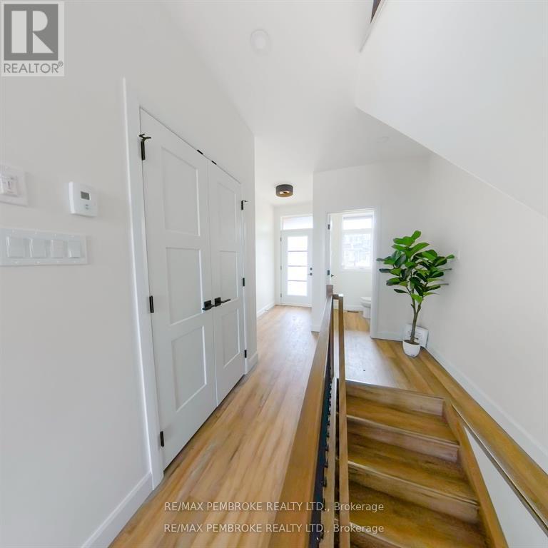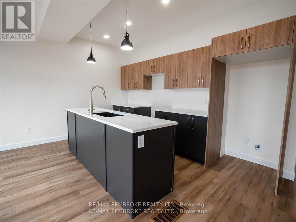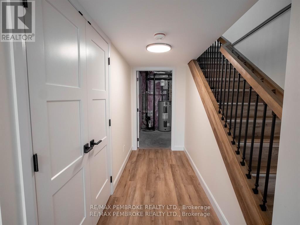 This newly constructed walk out basement 3 Bedroom with 4 bathroom two-story executive style townhouse with a fenced backyard in Petawawa offers modern chic living at its best. The main level features a bright open-concept kitchen, living, and dining area, with sleek quartz countertops, ample kitchen storage, and a lovely deck off the living space, perfect for outdoor relaxation. Upstairs, the spacious primary bedroom includes a walk-in closet with shelving and a private ensuite, while two additional bedrooms, a full family bathroom, and a convenient laundry room complete the floor. The lower level boasts a finished walkout basement with a spacious family room, and a powder room with stylish cabinetry. With modern finishes, matching vinyl flooring throughout and thoughtful design, this brand new home offers everything you need for comfortable, simple, low maintenance and stylish living. Walking distance to trails, Petawawa point, catwalk and shopping. EXTRAS: fenced yard,Quartz in kitchen and bathrooms, vinyl floor stair case, vinyl bedrooms metal railings, finished basement, eavestroughs, brick pillar, garage door opener, upgraded garage door, bathroom counters, brick on front, deck, closet shelving, HWT owned. Appliance allowance can be added to price. Purchase price includes HST with rebates signed back to the Builder. Full Tarion Warranty (id:64974)