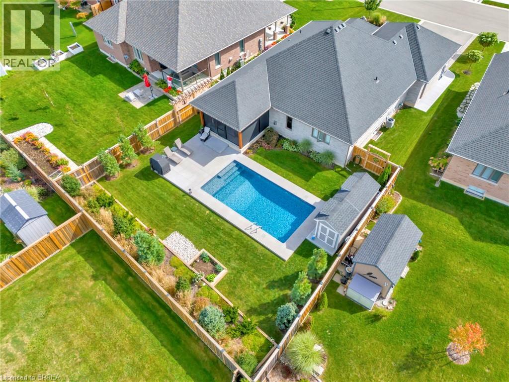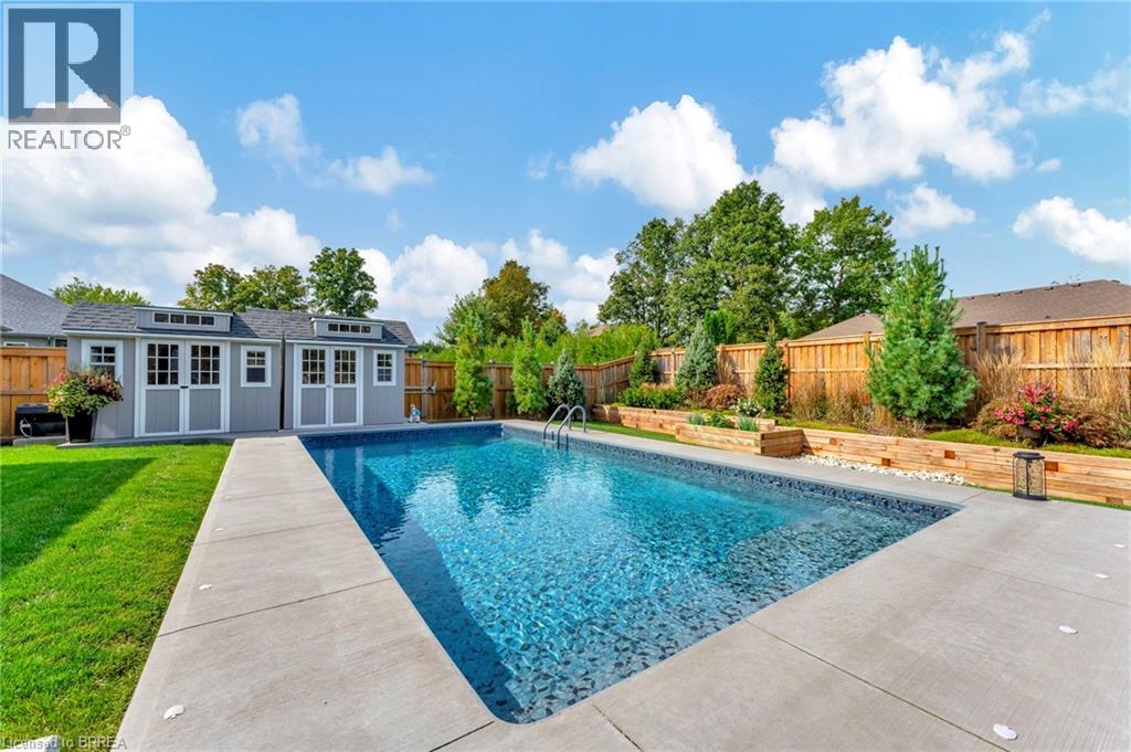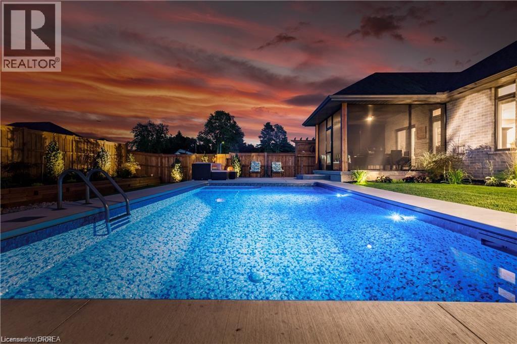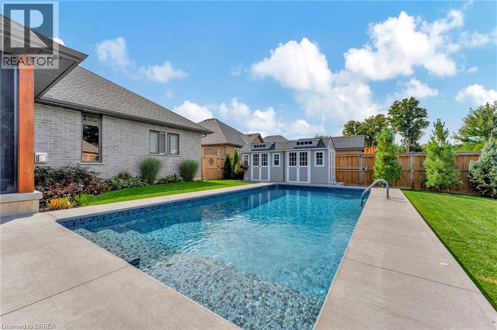 Welcome home to 11 Sycamore Dr., Port Dover. Executive bungalow with all the bells and whistles, including a heated salt water pool and screened in sunroom! Built in 2020 this 3+1 bed 3 bath home offers a seamless blend of luxury, comfort, and effortless living just minutes from the beach. Thoughtfully designed with over $222,000 in builder upgrades and more than $200,000 in additional homeowner enhancements, this home showcases impeccable attention to detail throughout. Recent upgrades include new concrete pad and sidewalk (from garage man door to driveway), additional storage shed, new winter pool cover (2025), and now municipal water is connected (2025). The bright, open-concept main floor features premium hardwood flooring, 9-foot California knockdown ceilings with elegant painted accents, and a modern, on-trend palette complemented by craftsman-style doors, trim, and baseboards. At the heart of the home is a stunning great room, complete with a gourmet kitchen boasting a large centre island, deBoer cabinetry, and Frigidaire Gallery appliances, flowing into a spacious living area anchored by a cozy gas fireplace. The primary suite offers a peaceful retreat with a walk-in closet and a luxurious ensuite featuring a custom double vanity and glass shower, while a second bedroom, versatile office or third bedroom, full bath, and convenient laundry with garage access complete the main level. The finished lower level expands your living space with a generous family room and home theatre area, a fourth bedroom, and an additional full bath, plus ample unfinished space ready for your personal touches—ideal for a gym, workshop, or wine cellar. Outdoors, enjoy a beautifully landscaped backyard oasis highlighted by a heated saltwater pool and a covered, screened-in porch perfect for year-round entertaining and relaxation—delivering the ultimate cottage-style lifestyle without ever leaving home. (id:64974)