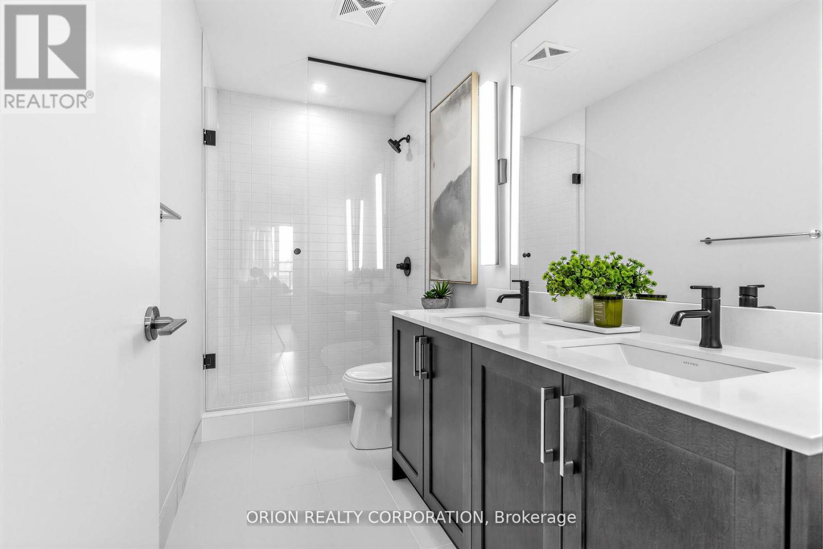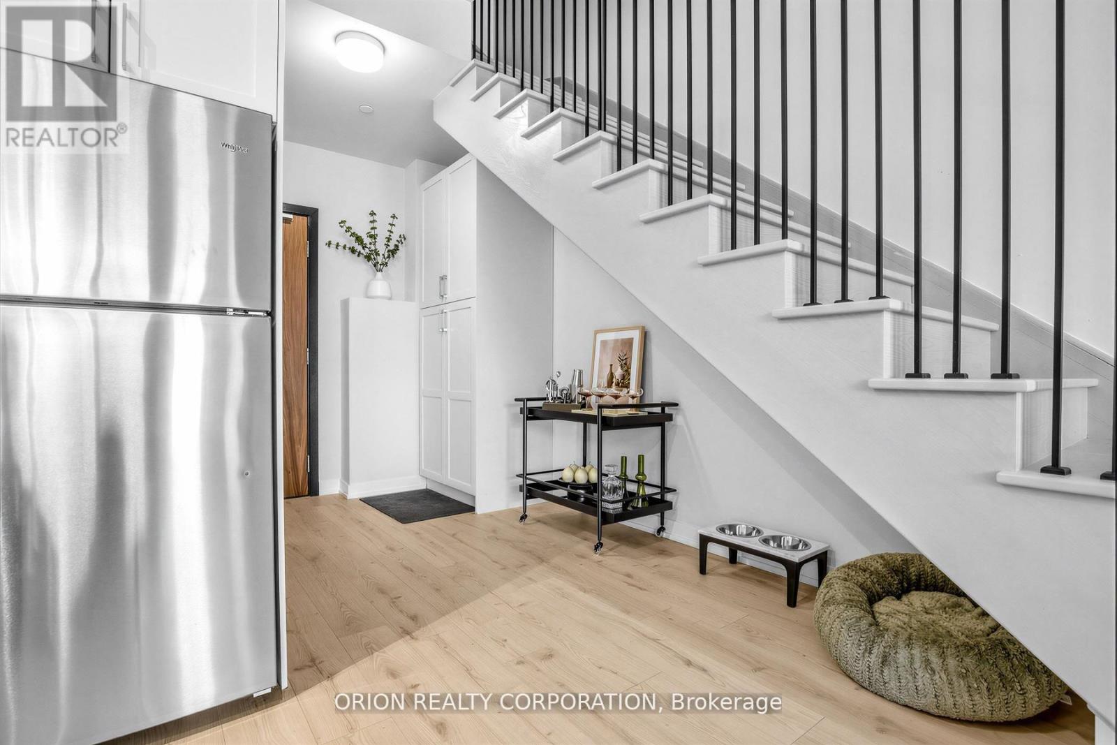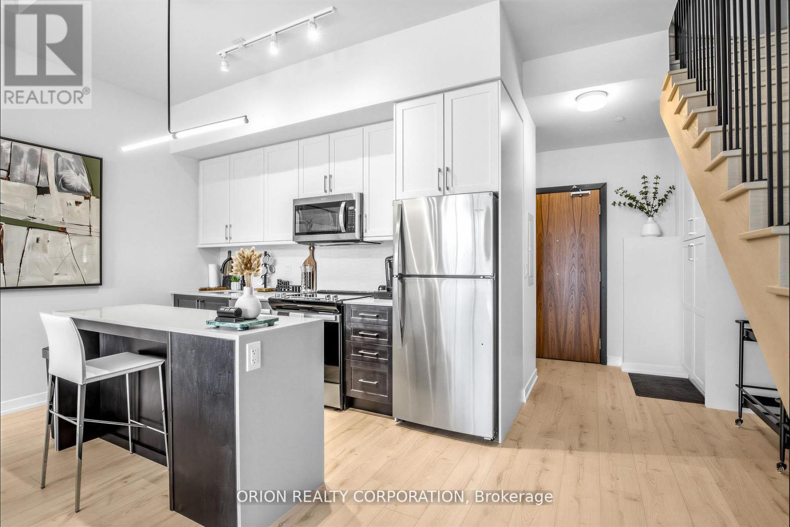 Welcome to Station No 3. Modern living in the heart of historic downtown Whitby. Brand new boutique building by award winning builder Brookfield Residential. Take advantage of hundreds of thousands in savings from original price!!!Please speak with sales representative regarding the new HST rebate. The "King" is a gorgeous, 2-storey townhome at 1383 sq. ft. with soaring approximate 11' ceilings. Floor to ceiling windows allow natural light to flow through the space. Enjoy the main floor's open concept layout with walk-out to terrace, additional pantry storage & powder room for guests. The oak staircase leads you to the upper floor's spacious den, primary bedroom with 4 piece en-suite washroom & double sinks, second bedroom with walk-out to balcony, an additional 4 piece washroom & in-suite storage with laundry area. Enjoy lovely finishes including kitchen island with waterfall edge, quartz countertops, soft close cabinetry, ceramic backsplash, black Delta faucets, wide-plank laminate flooring,& Smart Home System. This suites includes approximately $22,000 in upgrades. Easy access to highways 401, 407 & 412. Minutes to Whitby Go Station, Lake Ontario & many parks. Steps to several restaurants, coffee shops & boutique shopping .Immediate or flexible closings available. 1 parking & 1 locker included. Station 3 is fully constructed & registered. State of the art building amenities include, gym, yoga studio, 5th floor party room with outdoor terrace with BBQ's & fire pit, 3rd floor south facing courtyard with additional BBQ's, co-work space, pet spa, concierge & guest suite. (id:64974)