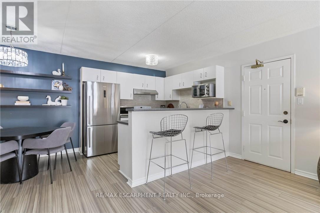 Thoughtfully designed and ideally located in the sought-after Tansley Woods neighbourhood of Burlington, this 1-bedroom open-concept condo offers comfort and convenience in equal measure. The modern kitchen with stylish backsplash and peninsula seating flows into a bright, spacious living area, extending to an expansive covered balcony. Features include a generous bedroom with walk-in closet, a beautifully finished 4-piece bath, in-suite laundry, storage locker, and one underground parking space. Enjoy a highly walkable setting near shopping, dining, parks including Tansley Woods Park, and quick access to major highways and Appleby GO Station. Are fined, move-in-ready opportunity in one of Burlington's most established communities. (id:64974)