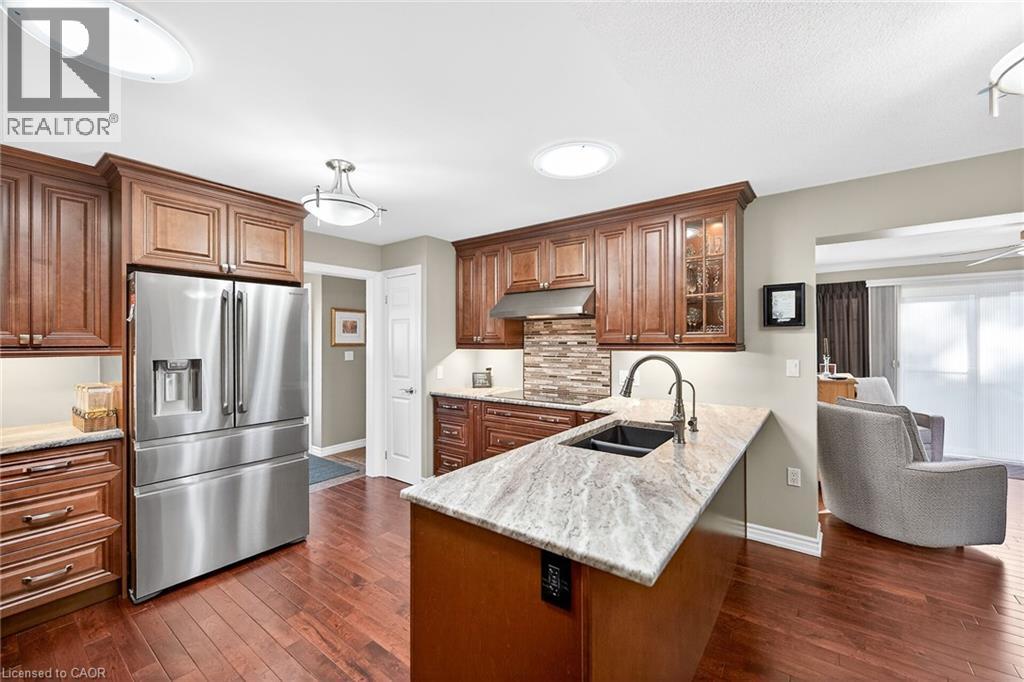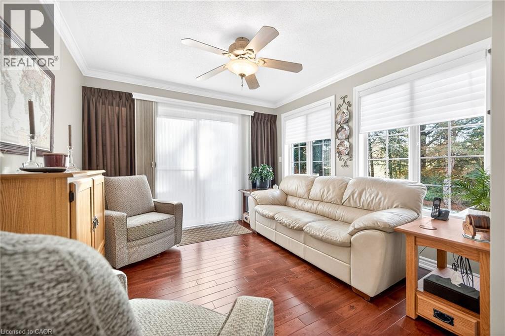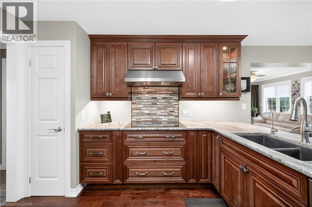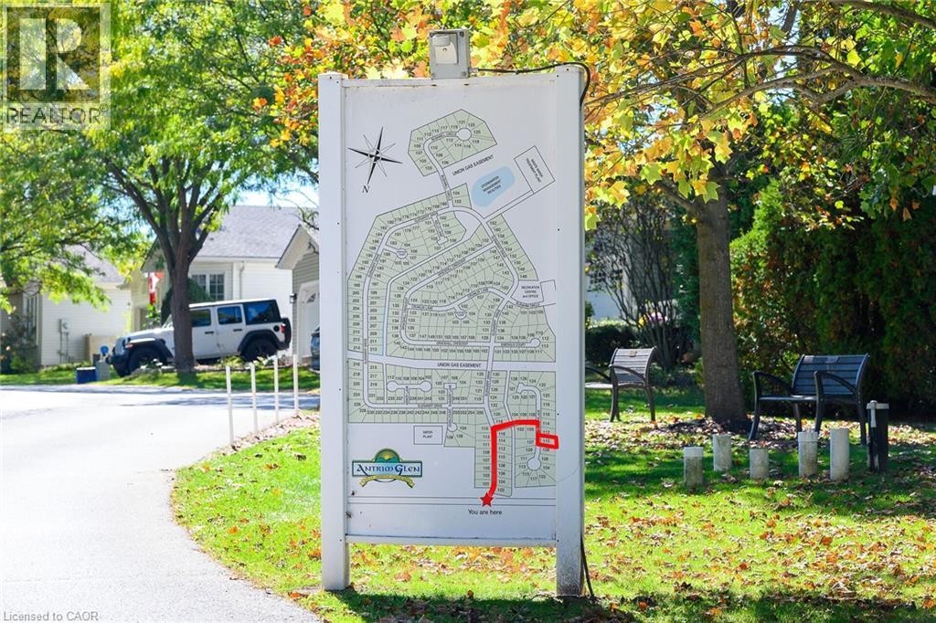 Welcome to the Gem of Antrim Glen! This exquisitely finished bungalow with a double car garage is set on a desirable private lot backing onto tranquil green-space. Impeccably maintained & tastefully updated, the home offers 3,100 sq. ft. of total living space. The main level showcases a grand living room with gas fireplace, flowing effortlessly into the dining area, an ideal setting for hosting friends & family. The chef inspired kitchen is a true highlight, featuring custom cherrywood cabinetry, leather-finish granite counters, a solar light, breakfast nook, & professional-series stainless steel appliances, including a built-in induction cooktop & wall oven with a convection microwave oven. The kitchen opens to a spacious family room filled with natural light & providing a walk-out to the spectacular yard. Two generous bedrooms & two full bathrooms complete the main floor, including a primary retreat with a spa-like walk-in jetted soaker tub & integrated sound system. The fully finished lower level continues to impress, offering an additional bedroom, home office, fitness area, expansive rec room with electric fireplace, bathroom with a shower, workshop, & abundant storage. The exterior of the property is exceptional with custom stone double driveway, front & rear stone patios, professionally landscaped gardens, wireless in-ground sprinkler system, & serene views of mature trees. Additional features include hardwood, main-floor laundry, insulated double garage with inside entry, brand-new furnace & A/C, leaf-filter eaves, central vac, water filtration system, & water softener. A complete list of updates & upgrades is available. Antrim Glen provides a vibrant lifestyle community with a range of amenities, including heated saltwater pool, sauna, BBQ area, residents' lounge & kitchen for gatherings, billiards, shuffleboard, library, craft room, horseshoes, vegetable garden plots, & scenic trails. Move in ready, simply unpack & enjoy! Monthly Land Lease: $1210.16. (id:64974)