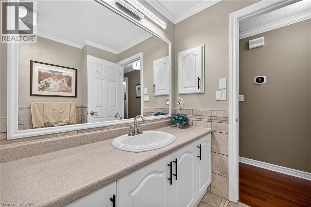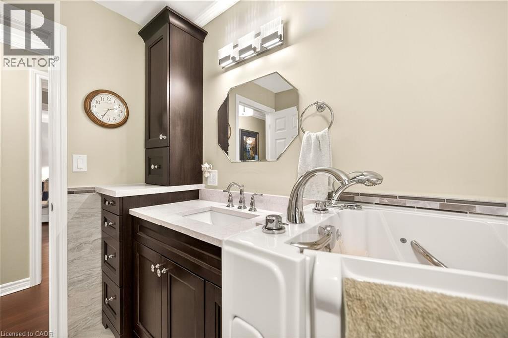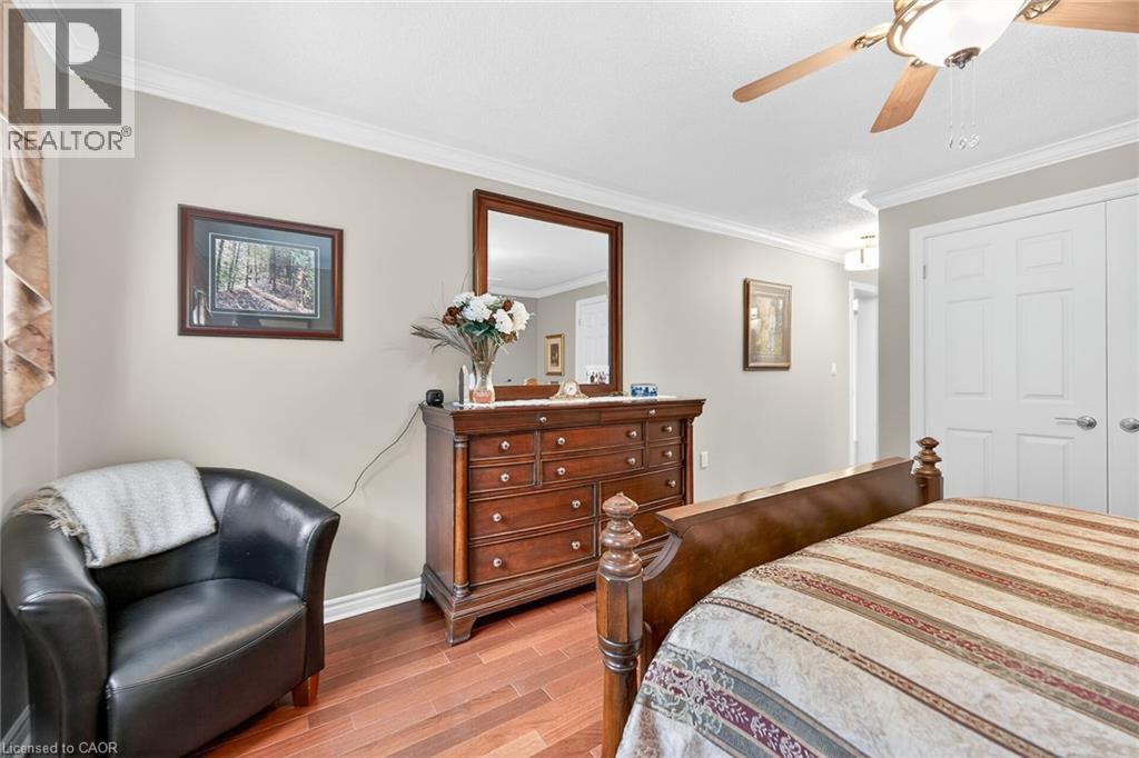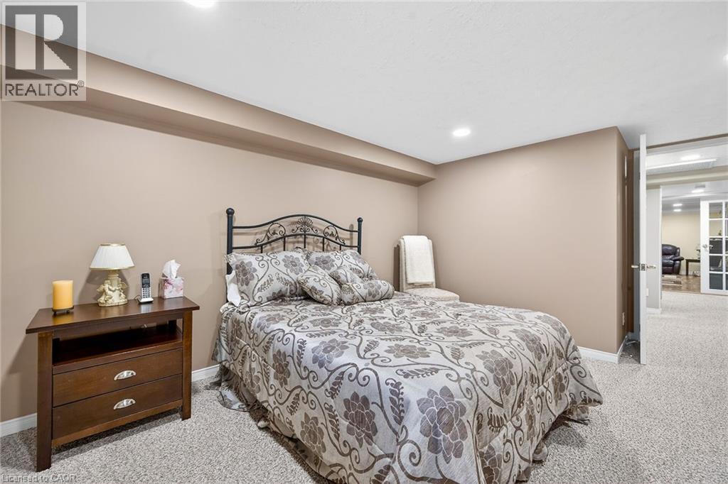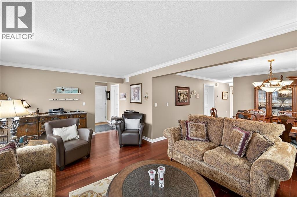 Welcome to the Gem of Antrim Glen! This exquisitely finished bungalow with a double car garage is set on a desirable private lot backing onto tranquil green-space. Impeccably maintained & tastefully updated, the home offers 3,100 sq. ft. of total living space. The main level showcases a grand living room with gas fireplace, flowing effortlessly into the dining area, an ideal setting for hosting friends & family. The chef inspired kitchen is a true highlight, featuring custom cherrywood cabinetry, leather-finish granite counters, a solar light, breakfast nook, & professional-series stainless steel appliances, including a built-in induction cooktop & wall oven with a convection microwave oven. The kitchen opens to a spacious family room filled with natural light & providing a walk-out to the spectacular yard. Two generous bedrooms & two full bathrooms complete the main floor, including a primary retreat with a spa-like walk-in jetted soaker tub & integrated sound system. The fully finished lower level continues to impress, offering an additional bedroom, home office, fitness area, expansive rec room with electric fireplace, bathroom with a shower, workshop, & abundant storage. The exterior of the property is exceptional with custom stone double driveway, front & rear stone patios, professionally landscaped gardens, wireless in-ground sprinkler system, & serene views of mature trees. Additional features include hardwood, main-floor laundry, insulated double garage with inside entry, brand-new furnace & A/C, leaf-filter eaves, central vac, water filtration system, & water softener. A complete list of updates & upgrades is available. Antrim Glen provides a vibrant lifestyle community with a range of amenities, including heated saltwater pool, sauna, BBQ area, residents' lounge & kitchen for gatherings, billiards, shuffleboard, library, craft room, horseshoes, vegetable garden plots, & scenic trails. Move in ready, simply unpack & enjoy! Monthly Land Lease: $1210.16. (id:64974)