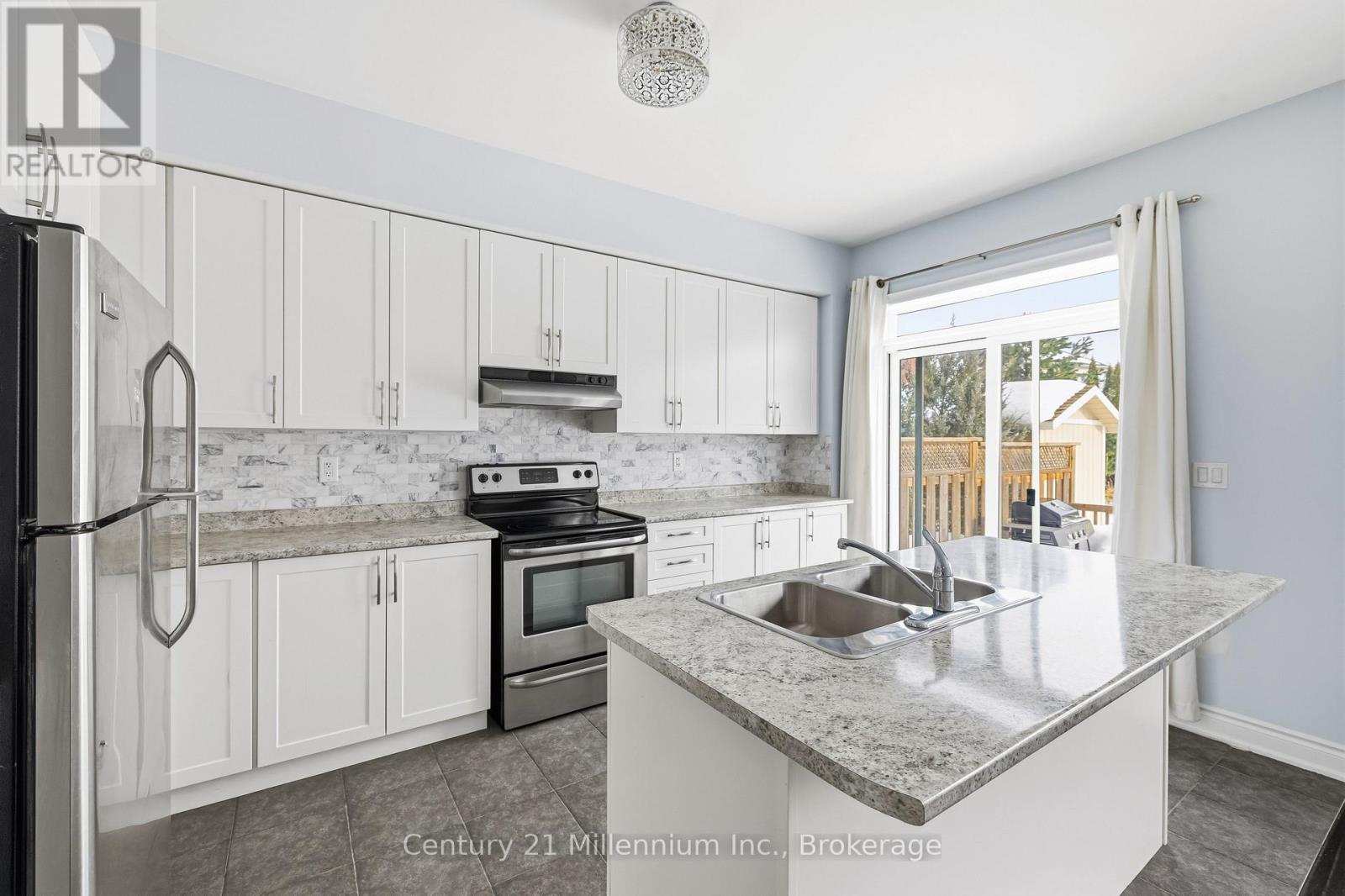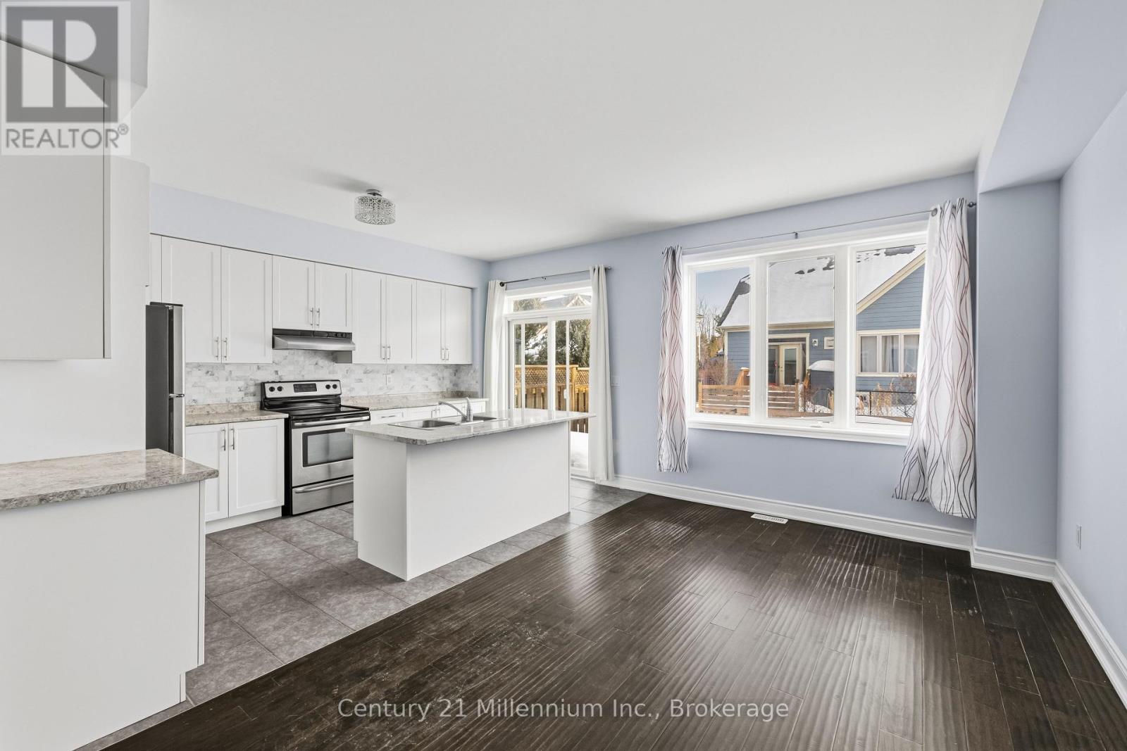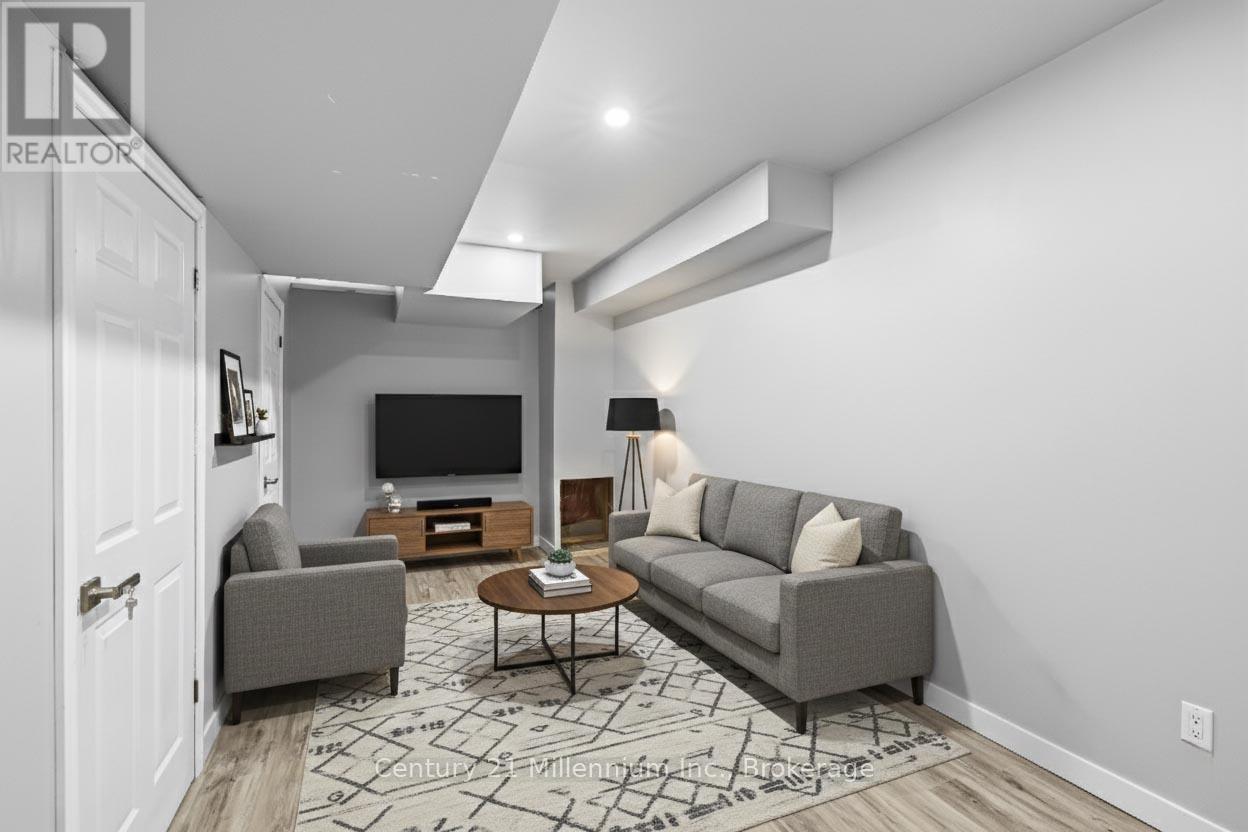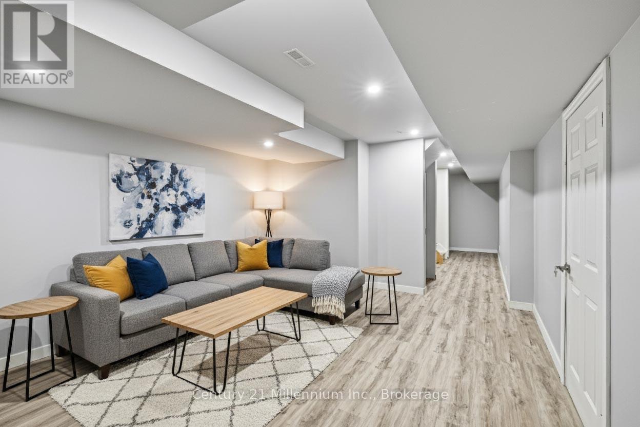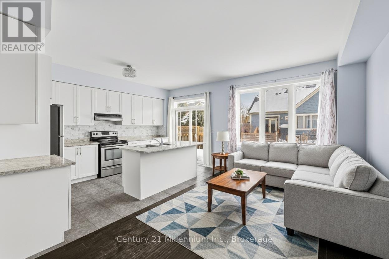 Welcome to Stonebridge! Quality built freehold townhome in active community close to BEACH andshopping.3 bedrooms, 1 1/2 bath....walkout from kitchen to fenced yard. Upgrades include hardwood flooring, oak stairs and walkout from 2nd bedroom to covered balcony. Basement almost completed with r/i bath....just needs finishing touches. Enjoy the lifestyle of Stonebridge with heated community pool and clubhouse. Fees are 110.63 per month which includes pool, clubhouse, snow removal, maintenance of common areas. (id:64974)