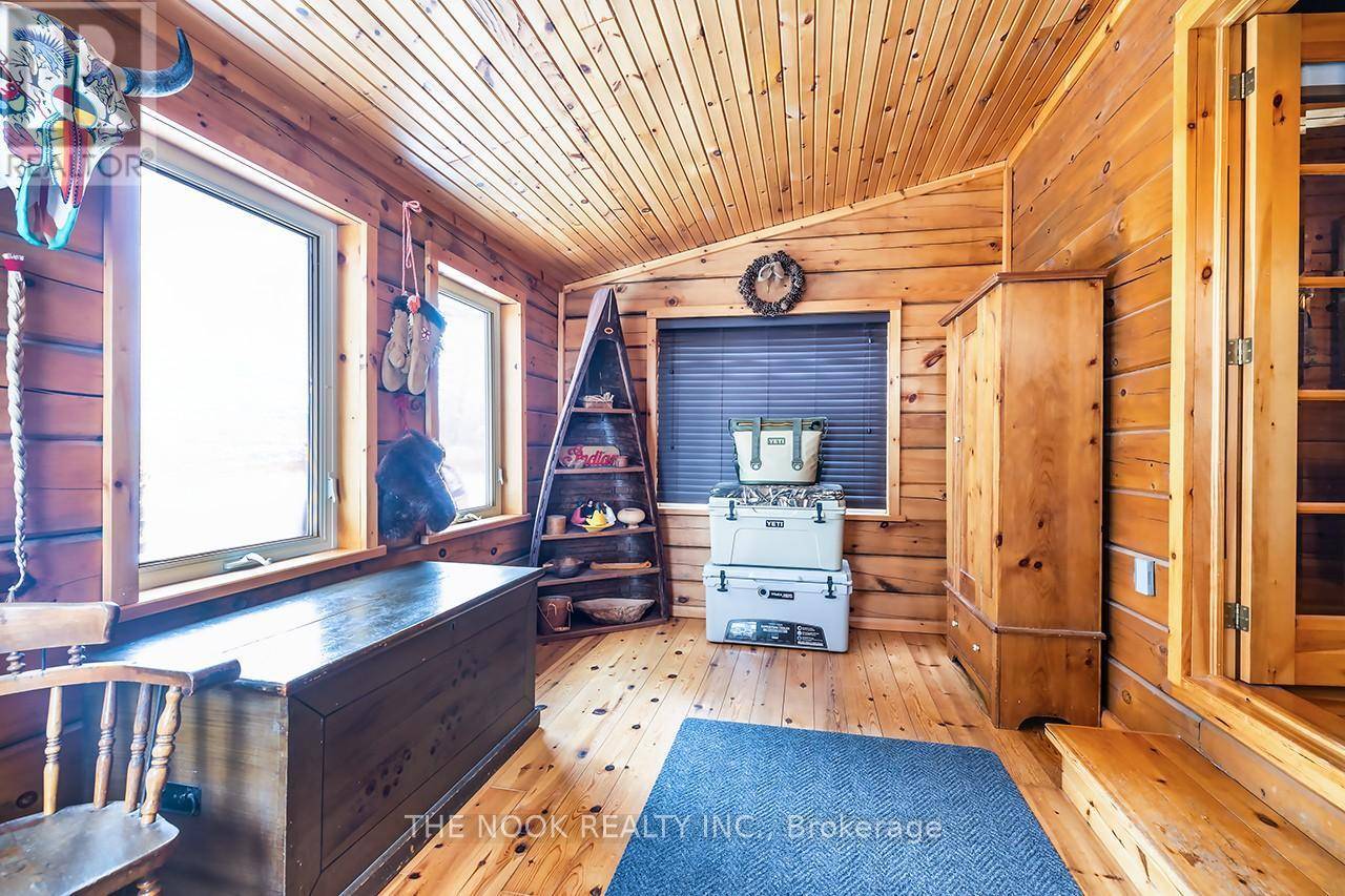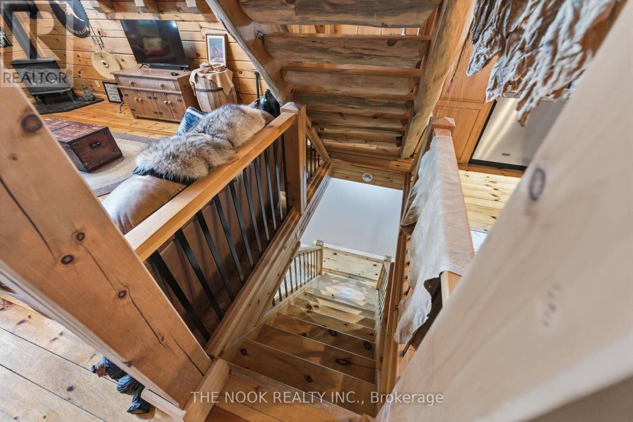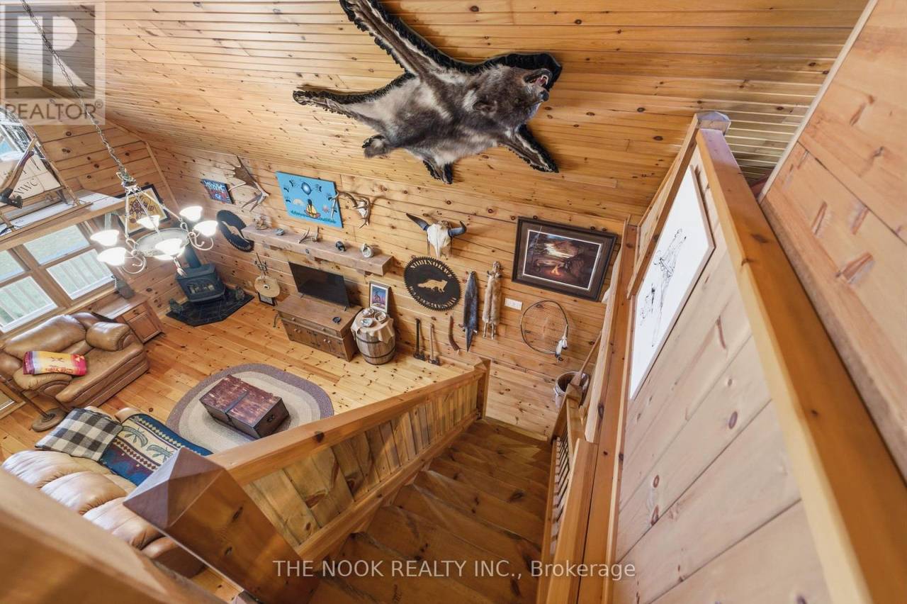 Experience the charm of this hand-crafted log bungaloft in the quiet "Glen" community with stunning lake views. Vaulted ceilings, exposed beams, and a cozy gas fireplace create a warm living space. The loft style primary bedroom overlooks the lake framed by vibrant maples. With a functional kitchen, walk-in pantry, bright mudroom, and heated workshop, this turnkey property is ready to enjoy from day one. Enjoy the many features, including forced air natural gas heating, whole-home Generac backup, a private treed lot, and boating and fishing access! (id:64974)