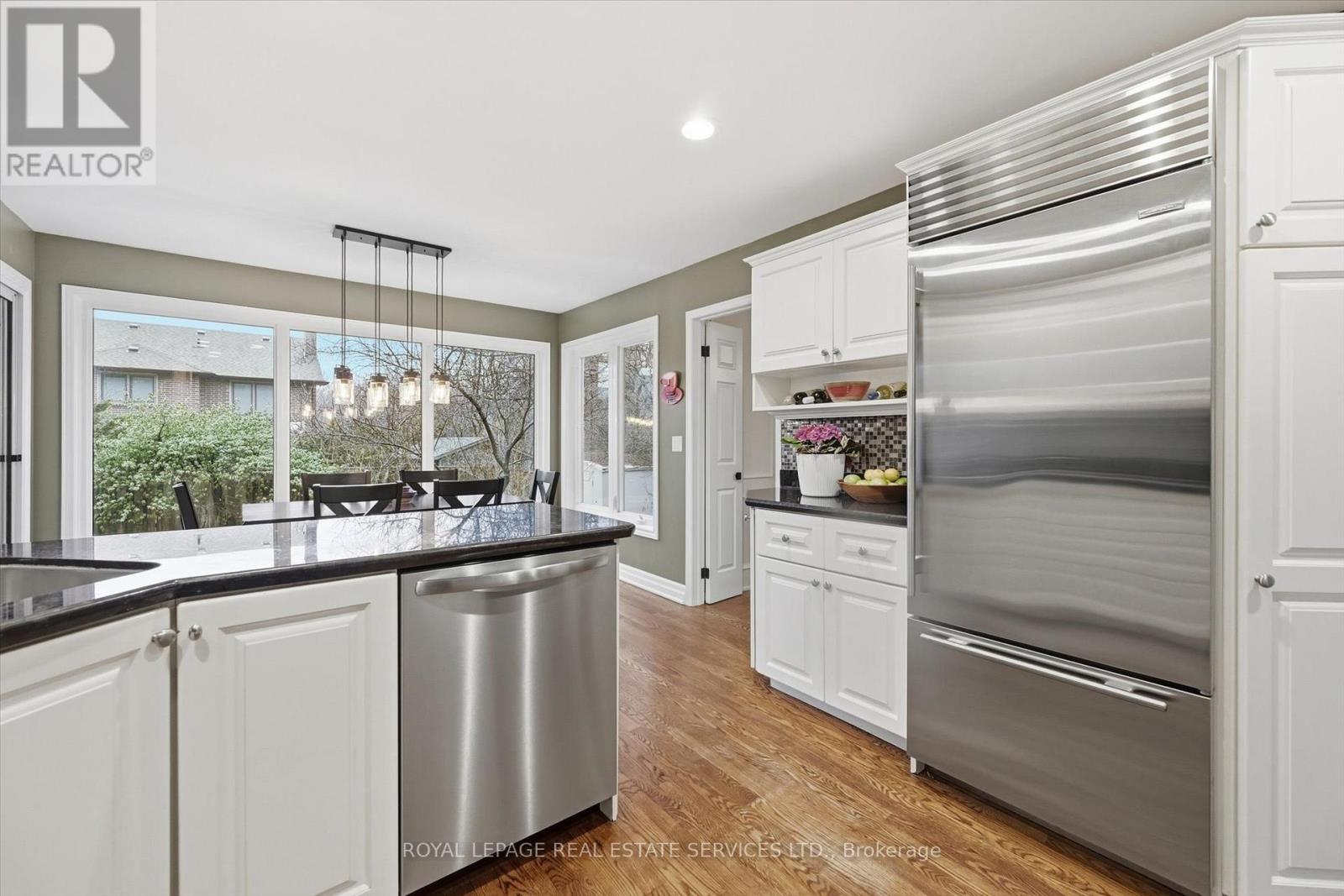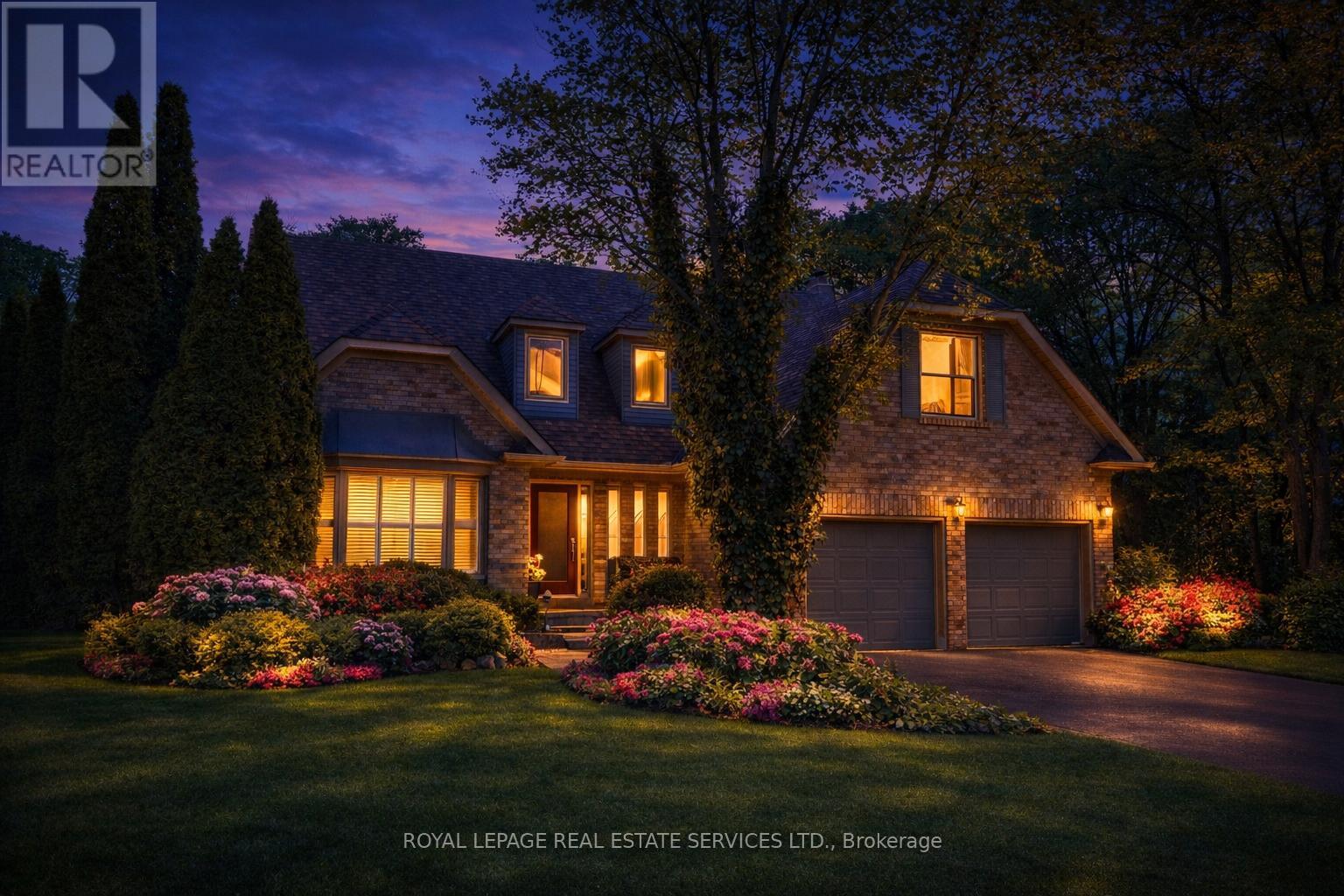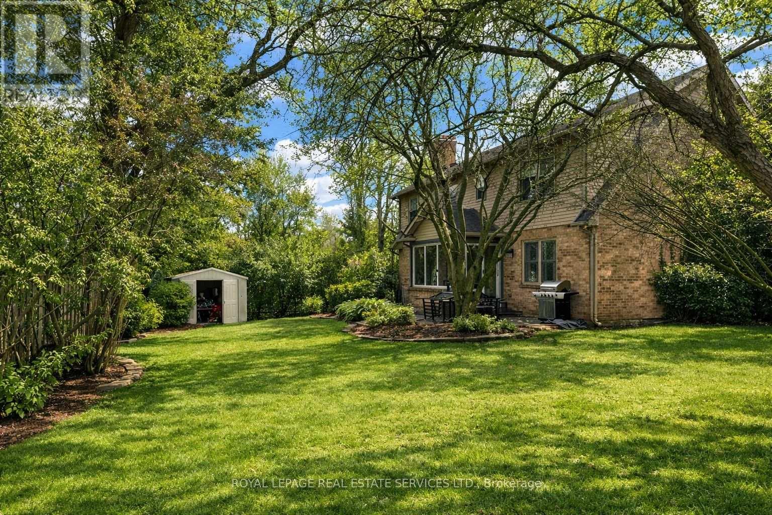 THE HEART OF GLEN ABBEY! OVERSIZED PIE-SHAPED LOT! QUIET CUL-DE-SAC OF ONLY 15 HOMES! Nestled on a quiet cul-de-sac of just 15 homes, this beautifully updated four-bedroom residence sits on an oversized pie-shaped lot siding onto a walking trail offering an unbeatable setting. Built by Arthur Blakely and designed for modern family living, the main level features rich hardwood flooring, elegant formal living and dining rooms, and a cozy family room with a woodburning fireplace and custom built-in cabinetry. The updated chef's kitchen is both stylish and functional, complete with granite countertops, designer backsplash, built-in appliances, a large pantry, and a bright breakfast area with walkout to the patio. Engineered hardwood flooring flows seamlessly throughout the upper level. The primary bedroom offers a walk-in closet and a spa-inspired five-piece ensuite with double sinks and a skylight. Three additional bedrooms and a well-appointed five-piece bath complete the upper level. The finished basement adds exceptional living space with new laminate flooring, large recreation/games area with custom bar, an office with custom cabinetry and bookshelves, three-piece bath, and ample storage. Additional highlights include a grand two-storey foyer, updated kitchen and bathrooms, California shutters, wainscoting, convenient main floor laundry room with side yard access, hardwood staircase with carpet runner, and replaced garage doors. Step outside to a private backyard featuring a stunning stone patio, mature trees, and professionally landscaped gardens - a perfect setting for relaxing or entertaining. Ideally located within walking distance of parks, trails, and Monastery Bakery, and close to top-rated schools including Abbey Park High School, shopping, dining, hospital, major highways, and GO Train. A perfect family home in one of Glen Abbey's most sought-after locations! (certain exterior images have been digitally enhanced) (id:64974)