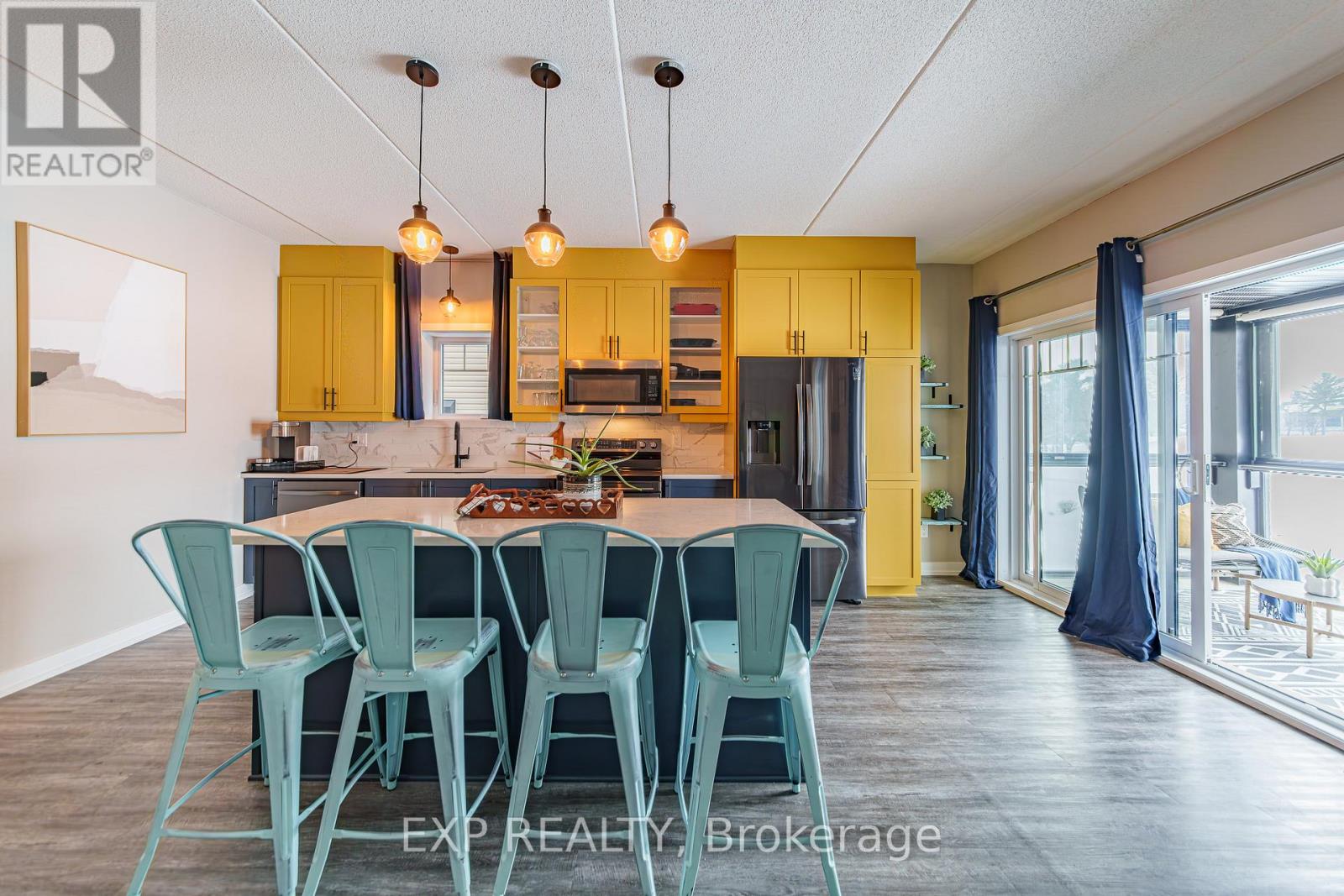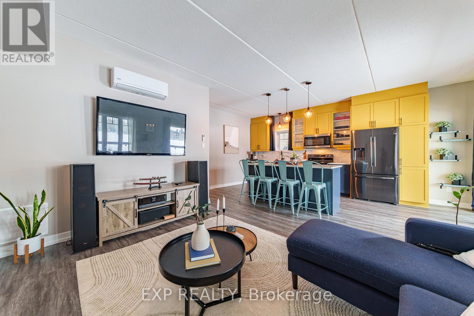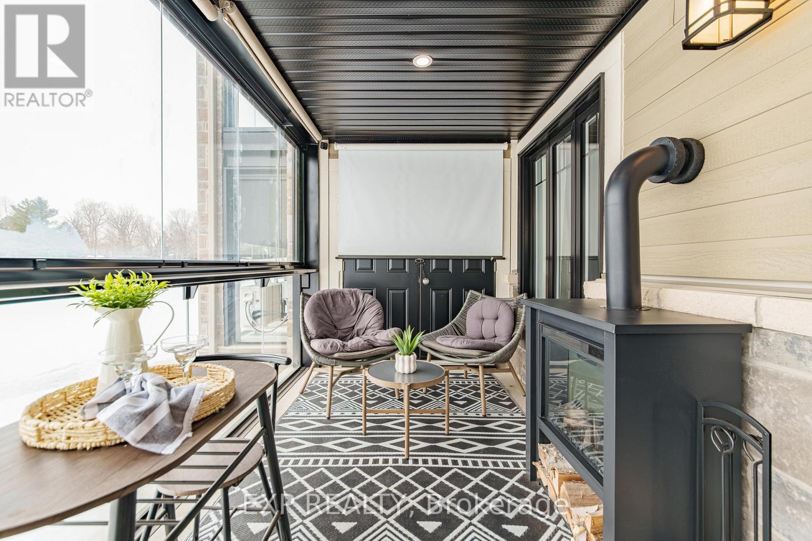 This 2021 built condo offers the perfect balance of comfort, style, and peaceful surroundings, located about 40 minutes from downtown Ottawa and just minutes from Rockland. This 9 foot ceiling unit features 2 bedrooms and 1.5 bathrooms, radiant floor heating, with one bedroom easily convertible into a home office for those working remotely. Large windows fill the space with natural light, highlighting the beautiful modern finishes throughout, including quartz countertops, soft close drawers, and sleek black titanium steel appliances. The living room is equipped with a heat pump that provides both air conditioning and heat, along with an integrated sound system for added comfort and entertainment. One of the standout features is the impressive 200 sq ft glass enclosed sunroom overlooking the golf course, complete with an electric fireplace and a pull down projector that creates the perfect space for relaxing or enjoying a cozy movie night. The balcony also includes additional storage for convenience. If you are looking to escape the busyness of downtown and enjoy a lifestyle that feels like a vacation every day, this condo is a must see. (id:64974)