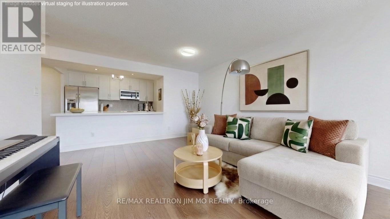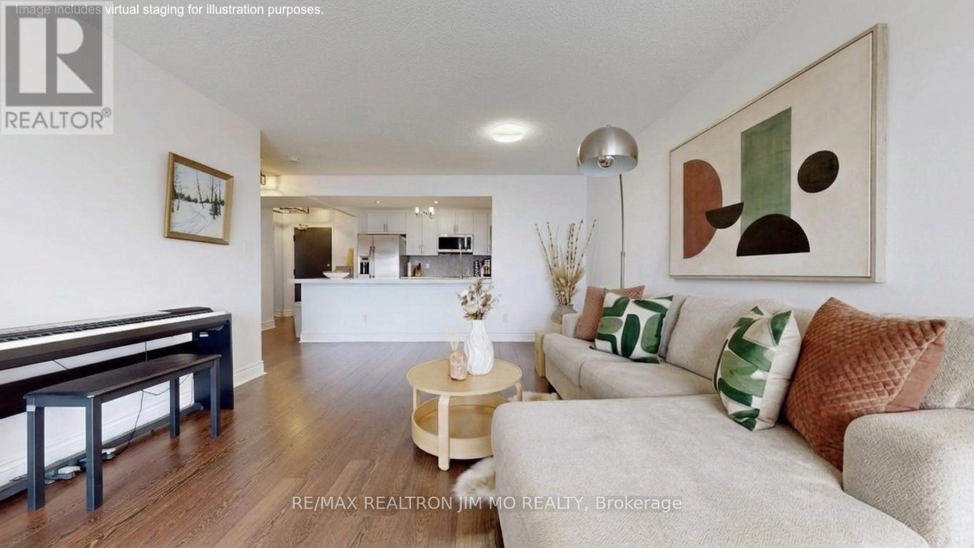Spacious west facing 1 bedroom suite with unobstructed views, an exceptional layout, and over 750 sqft of living area. Featuring a large modern kitchen with stainless steel appliances, expansive countertops, and a generous breakfast bar perfect for dining and entertaining. The open-concept living area is bright and inviting with large windows and plenty of natural light. The oversized bedroom easily accommodates a King bed, includes a large closet with built-in shelving, and a custom built-in makeup area with wardrobe, display shelving, and desk. Enjoy a stylish bathroom with large glass shower and ample counter space. Conveniently located close to restaurants, supermarkets, Eglinton GO, TTC, Kennedy Station, New Eglinton Crosstown LRT, STC. Includes 1 parking space and 1 locker for added convenience. A great opportunity for first-time buyers, small families, or down-sizers. Don't miss this chance to call it your home! (id:64974)