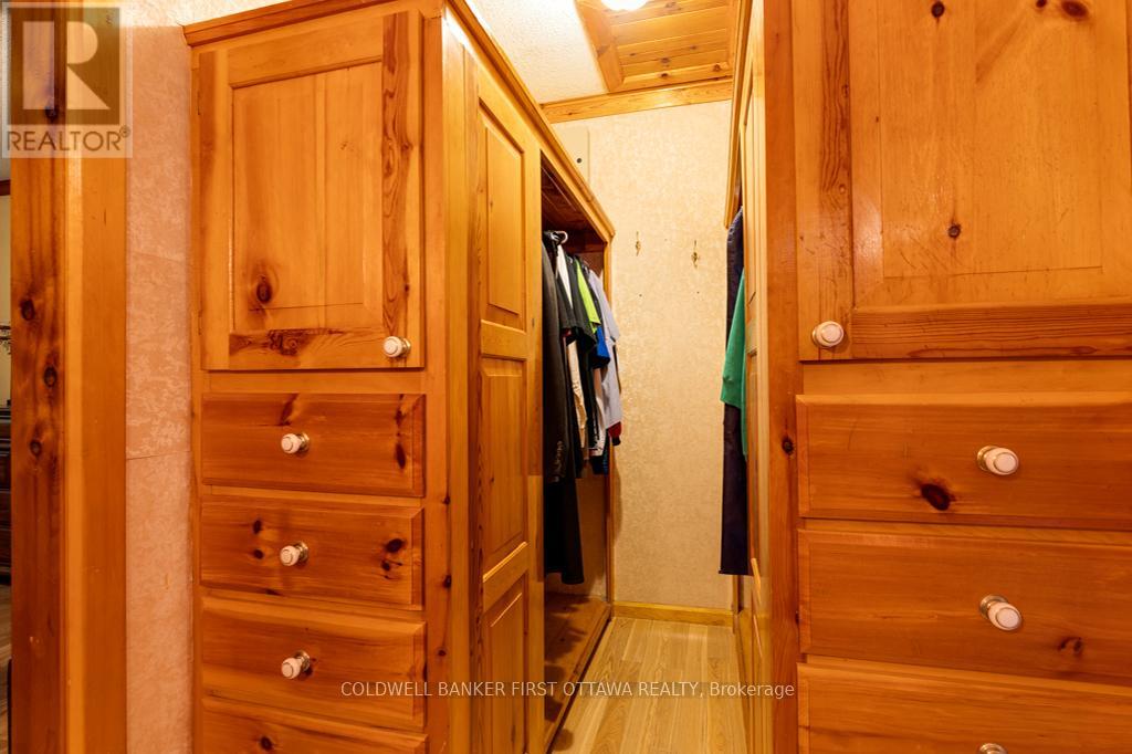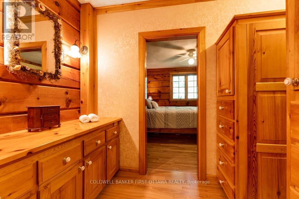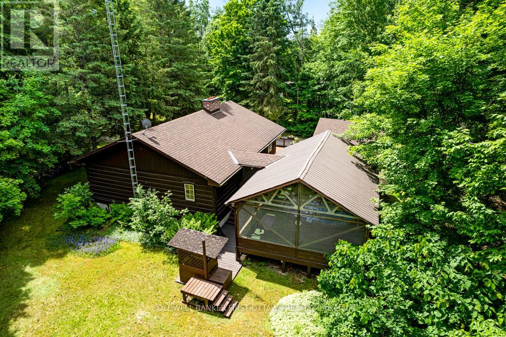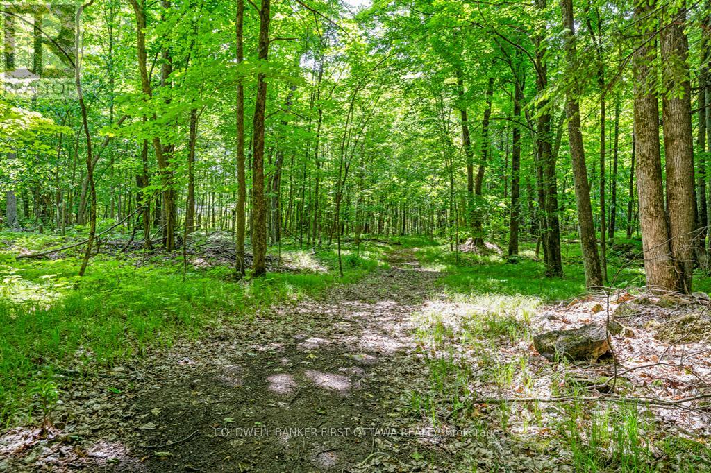 On picturesque 8 woodland acres, charming Pan Abode log home that's a sanctuary for nature lovers. Surrounded by peace and quiet, warmly welcoming home blends into its natural environment. The family artist, carpenter and hobbyist will especially appreciate the detached studio with woodstove plus, the detached insulated garage-workshop with woodstove and loft. Both the studio and garage-workshop have hydro. Large spacious 3 bedroom, 2 full bathroom home offers rich wood detailing, ash hardwood flooring and endless views of the tranquil outdoors. Front entrance features hand-made lovely stained glass panels. Living room showcases one of two amazing custom Georgian Bay fieldstone fireplaces; fieldstones are all hand selected. Formal dining room has Tiffany light and exquisite hand-crafted French oak wall unit. Sun-filled kitchen features walls of cupboard storage, extra prep areas and another Tiffany light. Primary bedroom walk-in closet with custom fit-ins. Primary bedroom also has its own access to main floor bathroom, with two-person therapeutic soaker tub. Rear foyer leads to expansive wrap-around deck that has wonderful enclosed lounging area with heated pool - perfect for family fun, gatherings with friends and staycations. Lower level features wet bar off the family room with another Georgian Bay custom stone wood-burning fireplace. Lower level sunroom provides space for at-home office, with pellet stove. Lower level also includes sitting area with woodstove, two comfortable bedrooms and 3-pc bathroom. Here too is the laundry station, cold storage and doors to outside. Surrounding woodlands have trails for summer hiking or winter snowshoeing. Located on township maintained paved road with mail delivery, garbage pickup and school bus route. Hi-speed and cell service. All this, conveniently situated between Perth and Carleton Place; 15 mins to Perth or 10 mins to Carleton Place. (id:64974)