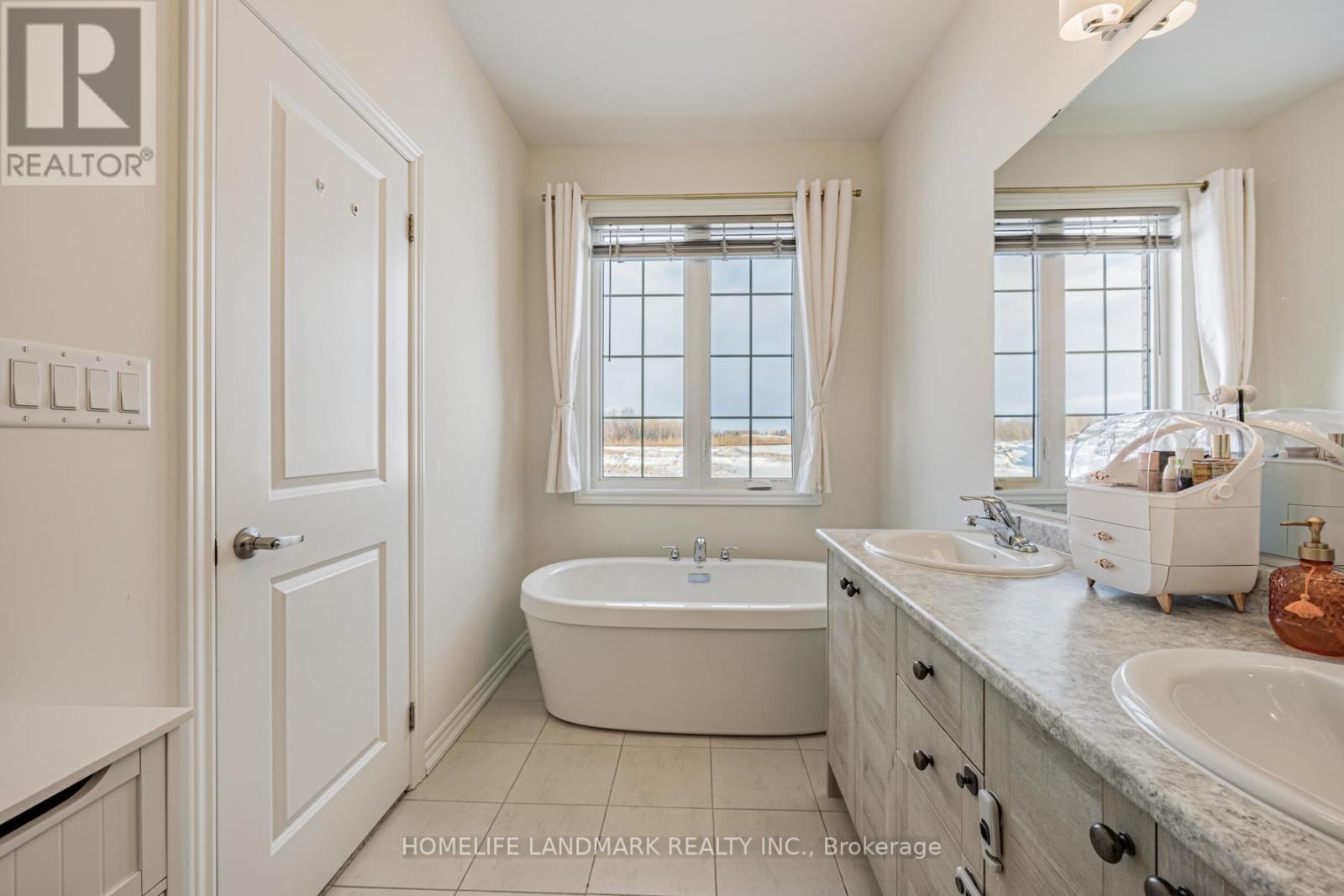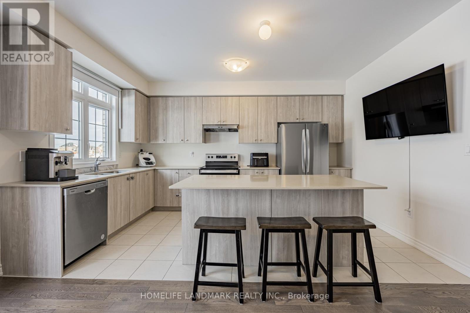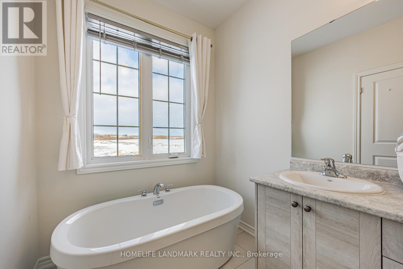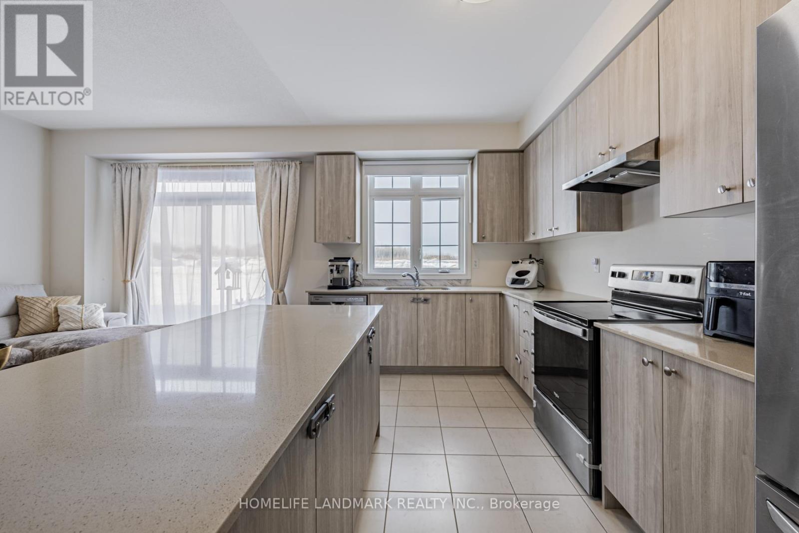 Stunning upgraded newer 2-storey semi-detached home featuring 3 bedrooms, 3 bathrooms and a single-car garage, located in a welcoming family-friendly neighbourhood in Greenwood, Pickering. Open-concept layout with 9-ft ceilings on all levels except the basement. The main floor offers a spacious Great Room combined with the Dining Room, highlighted by hardwood flooring throughout and an elegant staircase with iron pickets. Upgraded kitchen cabinetry with quartz countertops and stainless steel appliances. Legal side entrance provides excellent future potential. Primary bedroom features a luxurious ensuite with double sinks and a frameless glass shower. Convenient direct garage access plus an additional separate side entrance. Ideally located minutes to Hwy 407 & 401, GO Station, shopping, schools, parks, trails and other amenities-offering exceptional comfort and convenience. (id:64974)