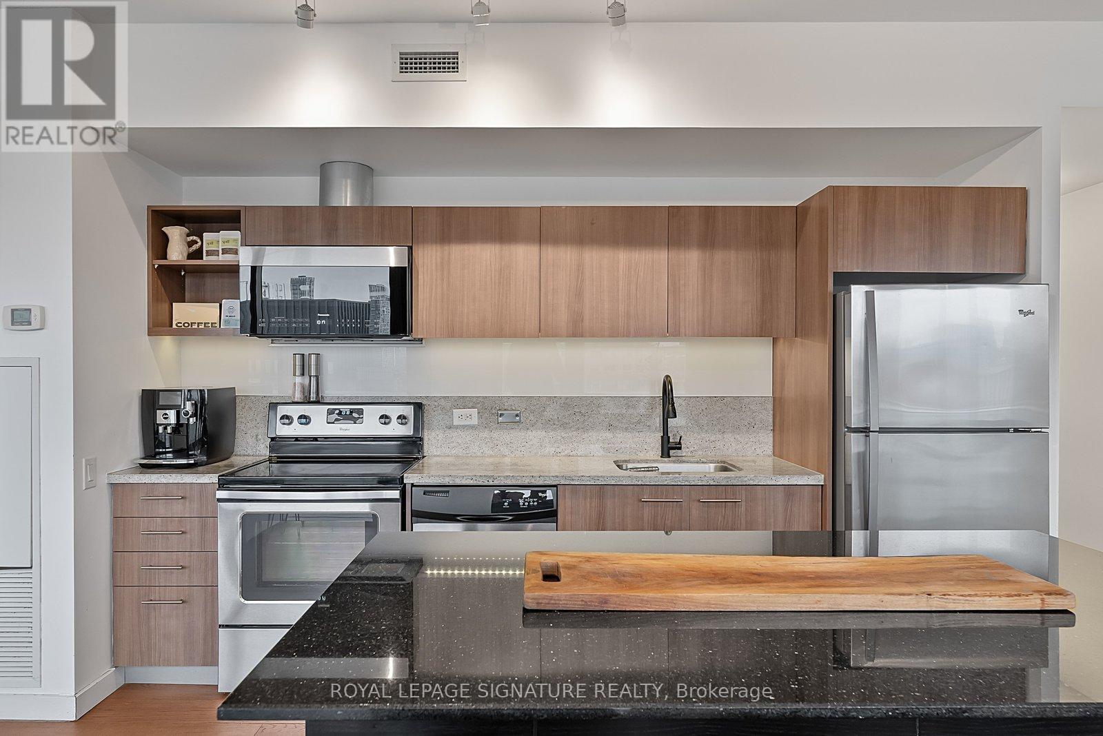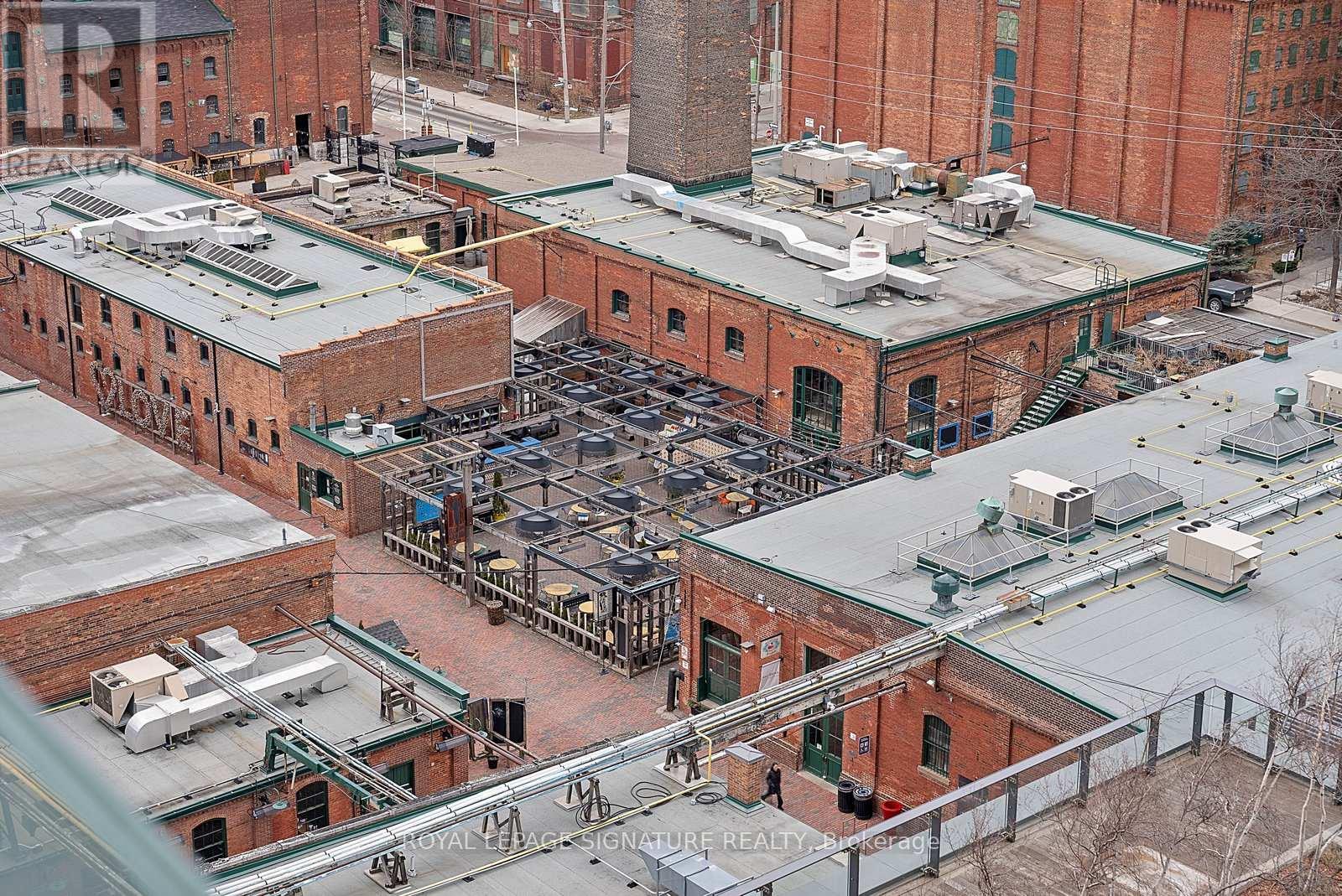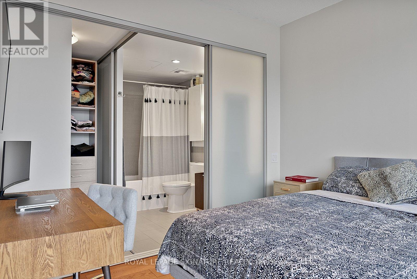 Welcome to suite #1103, a large corner unit in the heart of the Distillery District. The modern kitchen features stainless steel appliances and a breakfast island overlooking the combined living and dining space. Floor-to-ceiling windows featuring custom blinds throughout bring in abundant natural light and open to a wraparound terrace with city views. A split-bedroom layout places the bedrooms on opposite sides of the unit for added privacy. The primary bedroom includes a walk-in closet, blackout blinds, and a 4-piece ensuite. The second bedroom offers a closet and its own 3-piece ensuite. Wonderfully maintained, this suite offers over 800 sq ft of interior living space plus the expansive terrace. Located steps from shops, restaurants, and cafes in the Historical Distillery District, with easy access to public transit and parks. Includes parking and locker. (id:64974)