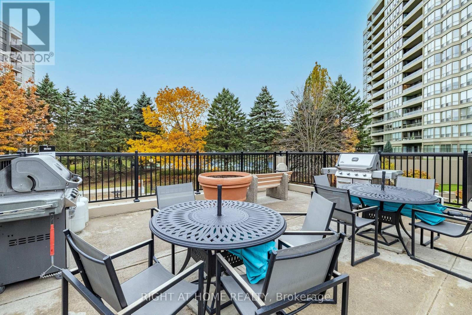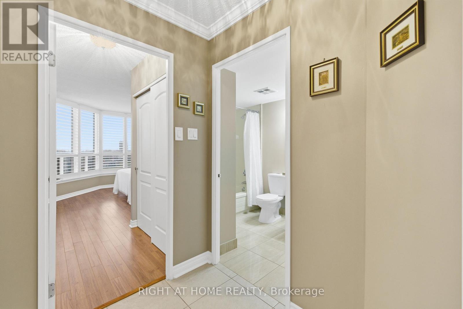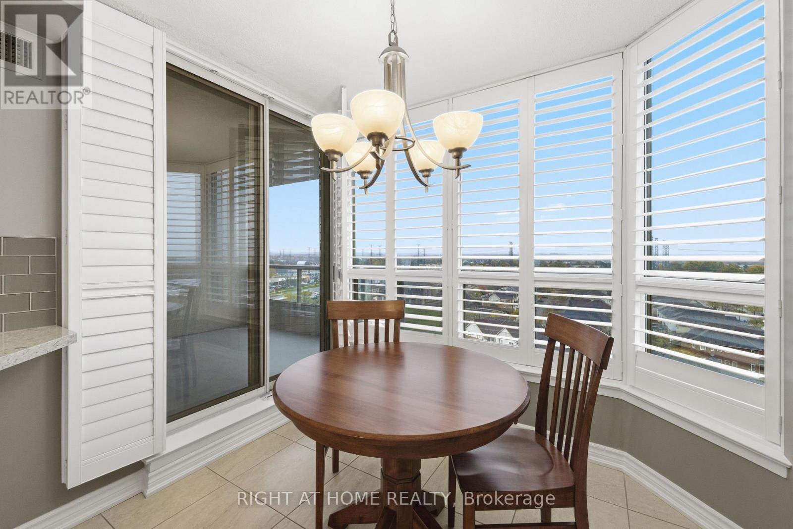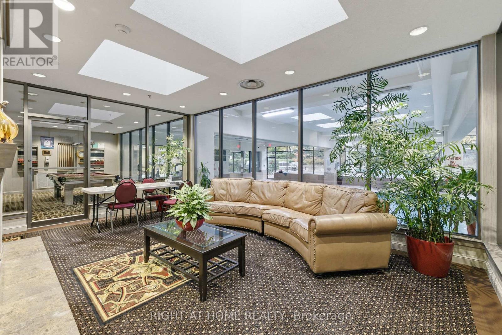 Step into the sought-after Cartier Model, an immaculate corner residence in Tridel's Discovery Place, showcasing nearly 1,500 sq. ft. of bright and well-designed living space. Sunlight pours in through the southeast-facing windows, highlighting the airy layout and offering seamless access to a private balcony-perfect for morning coffee or relaxing evenings. The suite features a spacious formal dining area within the living room, beautifully enhanced by crown moulding throughout, adding an elegant, refined touch to the main living space. The modern kitchen is ideal for everyday living, featuring an eat-in area and generous cabinetry for effortless organization. The entire suite is enhanced by California shutters, lending a bright, clean, uniform, and welcoming look. Both bathrooms are impressively sized and styled with contemporary finishes. For added convenience, the home includes oversized in-suite storage, an additional locker, and underground parking.Residents benefit from the exceptional lifestyle offered by this secure, resort-inspired community, complete with indoor and outdoor pools, hot tub, fully equipped fitness centre, tennis and squash courts, party rooms, guest suites, 24-hour security, and plenty of visitor parking. With all utilities included in the maintenance fees-water, heat, hydro, cable TV, and high-speed internet-daily living is simple and stress-free.Situated steps from Pickering Town Centre, the library, civic centre, parks, recreation facilities, and the GO Station, and minutes from Highway 401, this suite delivers the perfect blend of location, comfort, and convenience (id:64974)