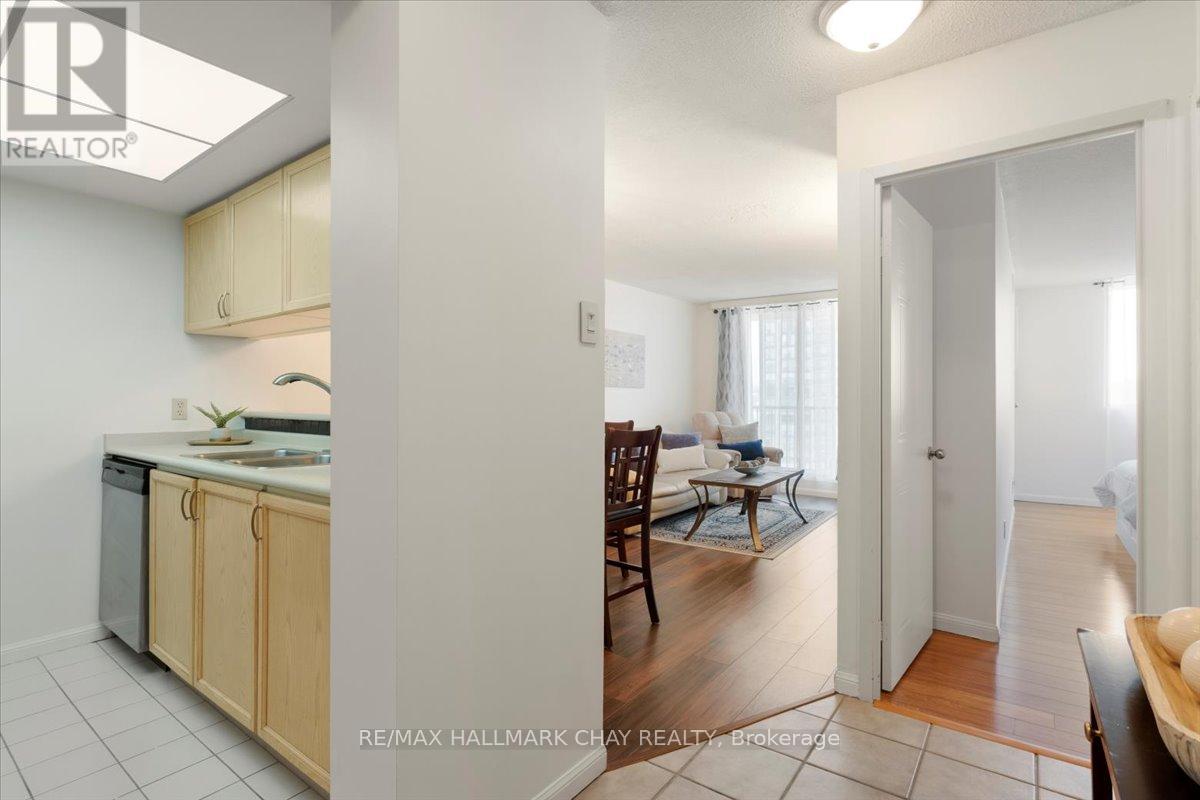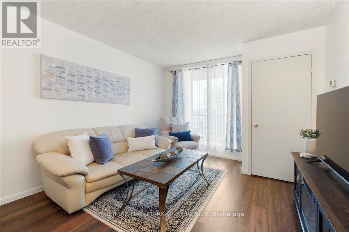 Welcome to the Regatta. Lovely 1 bedroom, 1 bathroom, 646 sq. ft. suite located on the 11th floor. Wake up to breathtaking views of Kempenfelt Bay and downtown Barrie. Your private balcony is a great place to enjoy the city's fireworks, waterfront festivals and activities. The kitchen features stainless steel appliances, ceramic flooring, and a stylish backsplash, seamlessly connecting to the open-concept living and dining area with floor-to-ceiling lake views. The spacious bedroom offers a second walk out to the balcony, and a large walk-through closet leading through to the semi-ensuite bath, complemented by the convenience of in-suite laundry. Warm laminate flooring throughout, move in ready condition. Regatta residents enjoy fantastic shared amenities including an indoor pool, sauna, hot tub, fitness room, party room, games room, and underground parking. Located just steps from the waterfront trails, parks, and local attractions, this pet-friendly building offers an active social atmosphere and a welcoming community-ideal for first-time buyers, downsizers, or investors alike. (id:64974)