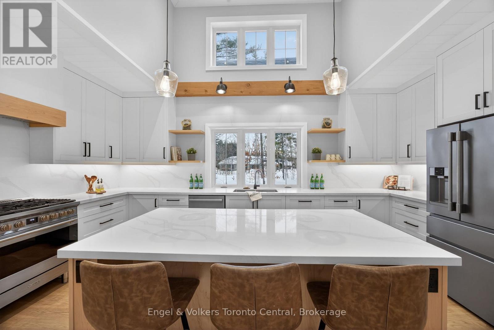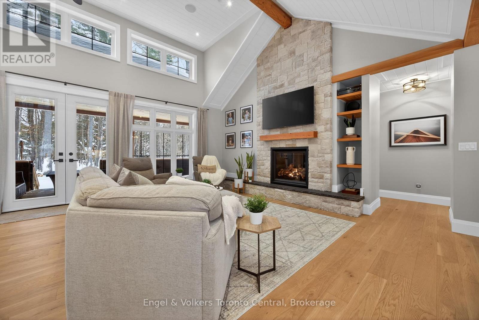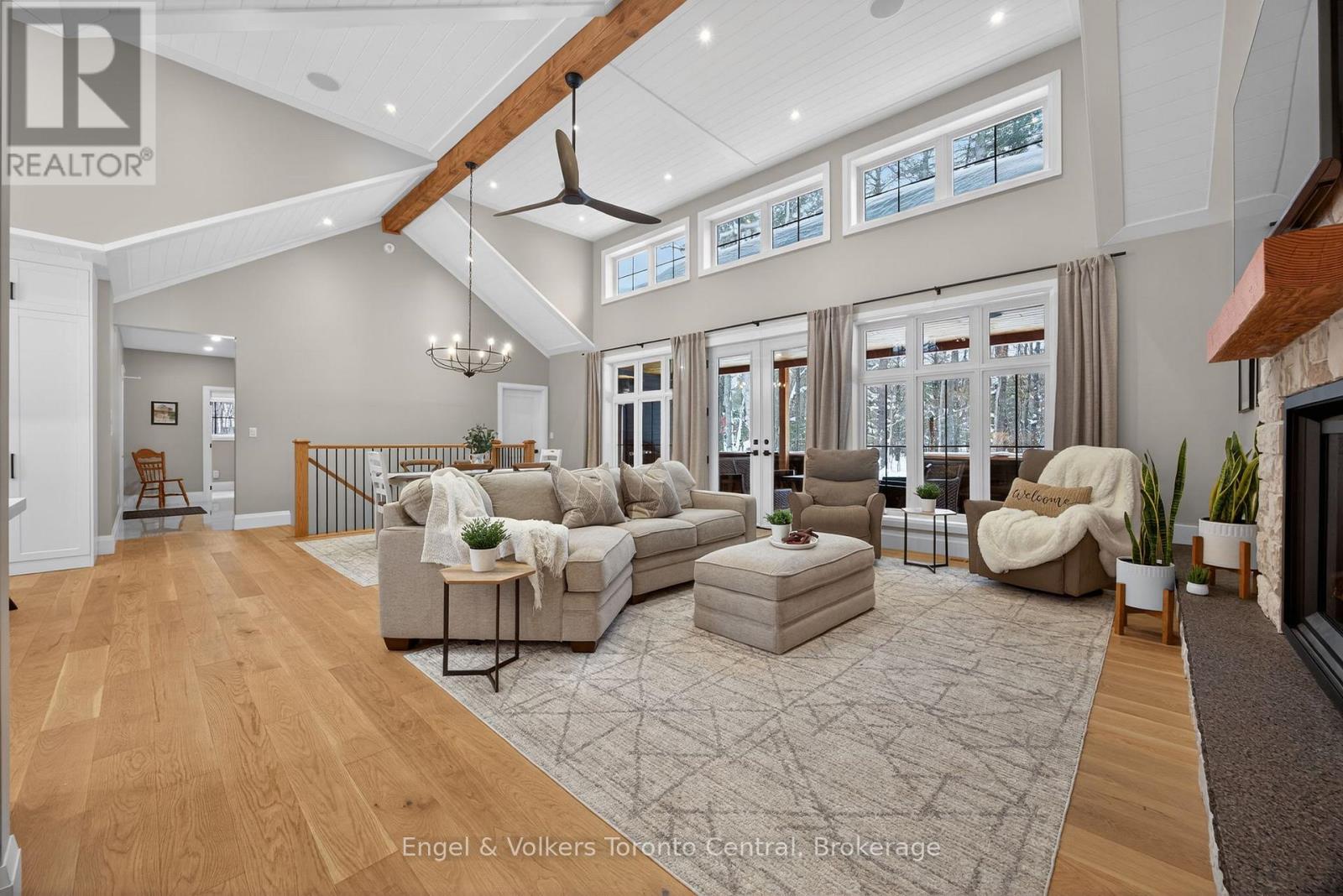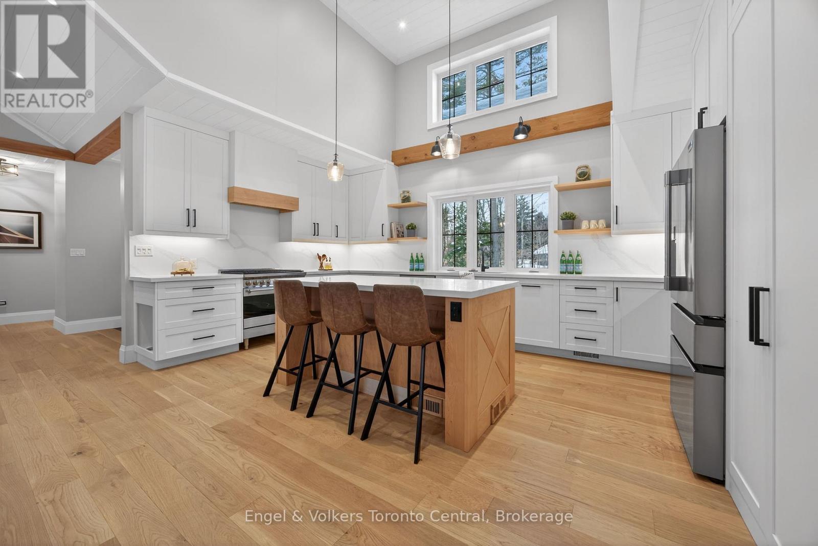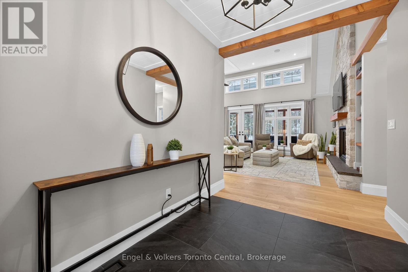 Executive country living just 7 minutes south of Gravenhurst and moments to Hwy 11 - offering seamless access to the GTA while enjoying complete privacy on a wooded 1-acre lot. Recently completed, this custom 5-bedroom residence blends refined Muskoka design with modern efficiency and exceptional build quality - ideal for professionals seeking space without sacrificing convenience. The open-concept main level features wide-plank white oak floors, vaulted v-groove ceilings with exposed beams, and expansive dormers that flood the home with natural light. A 42" gas fireplace anchors the living space, with walkout to a covered rear porch and hot tub for effortless year-round enjoyment. The custom kitchen is designed for both entertaining and everyday ease, showcasing quartz surfaces, premium appliances including a 36" gas range, generous island seating, wine storage and a hidden walk-in pantry with additional refrigerator. The primary suite offers vaulted ceilings, walk-in closet, and spa-inspired ensuite with heated floors and oversized glass shower. Two additional main-floor bedrooms provide flexible space for family or guests. The fully finished lower level with 9.5' ceilings adds 2 large bedrooms, recreation space, gym and full bath. Built for longevity and performance: ICF foundation, insulated slab, ZIP system sheathing, R-60 insulation, high-efficiency mechanicals, HRV, generator transfer switch and water filtration system. Oversized heated 2-car garage with car-lift potential plus a fully serviced detached shop with 100-amp service, washroom and in-floor heat - ideal for collectors, entrepreneurs, or home-based professionals. Private, polished, and purposefully designed - executive Muskoka living at its finest. (id:64974)