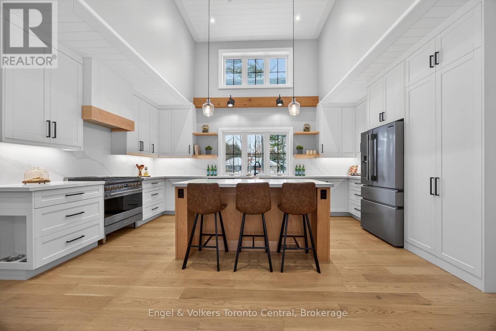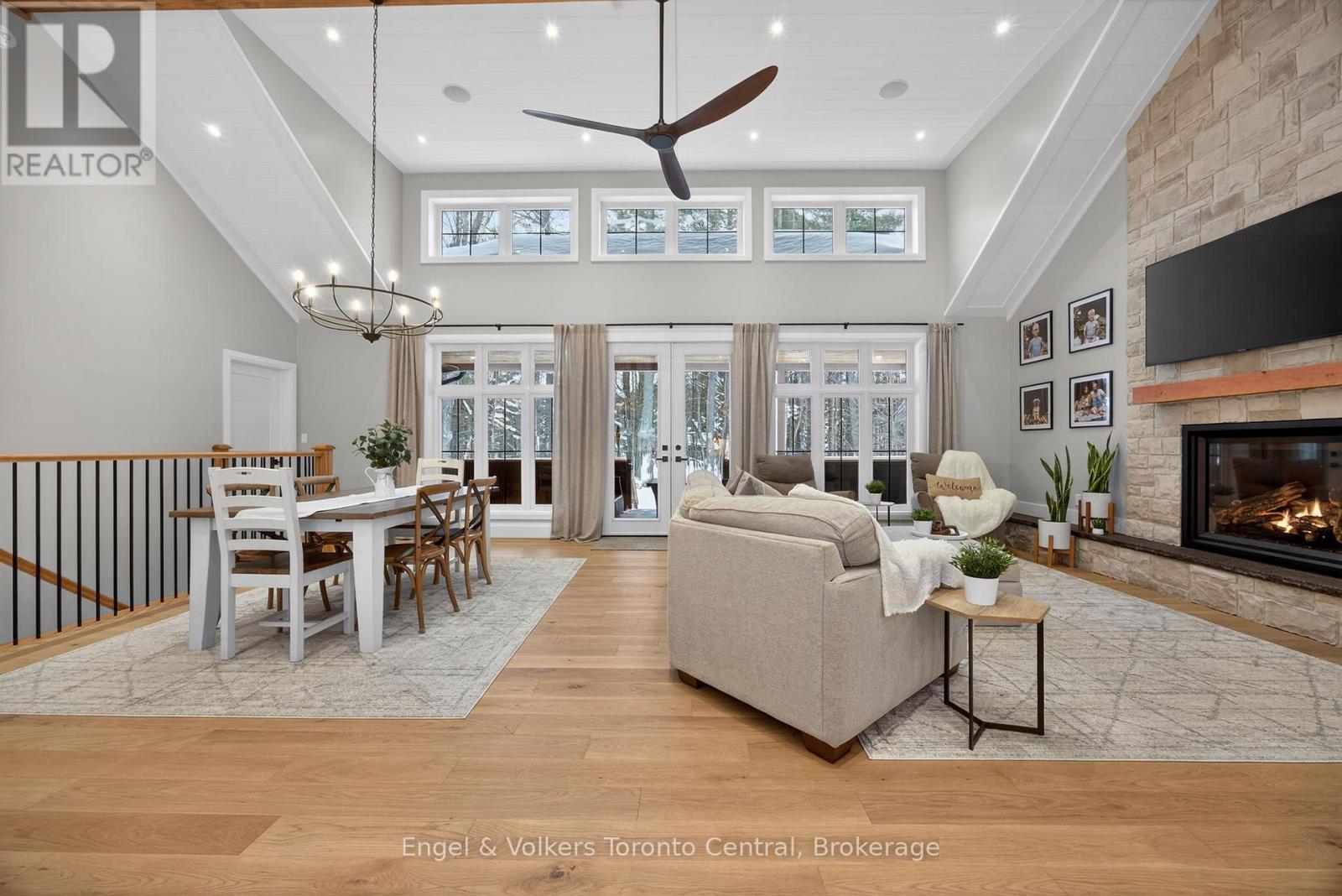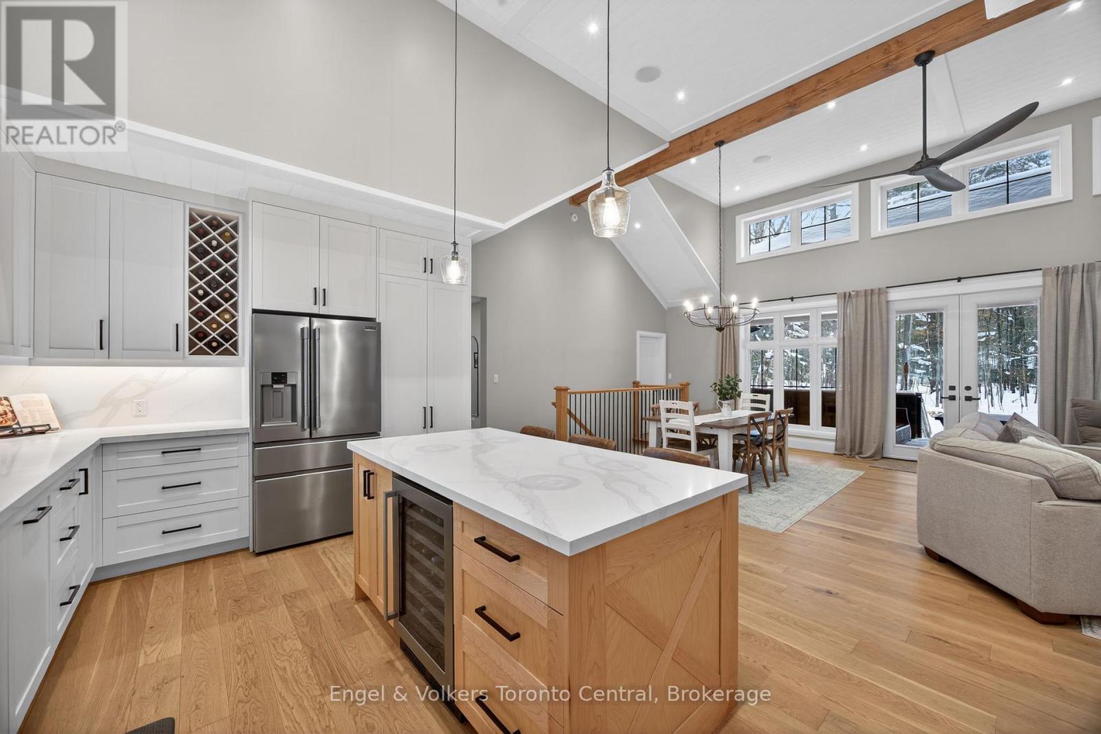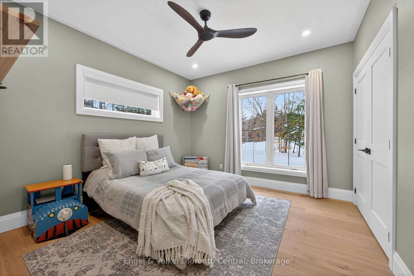 Executive country living just 7 minutes south of Gravenhurst and moments to Hwy 11 - offering seamless access to the GTA while enjoying complete privacy on a wooded 1-acre lot. Recently completed, this custom 5-bedroom residence blends refined Muskoka design with modern efficiency and exceptional build quality - ideal for professionals seeking space without sacrificing convenience. The open-concept main level features wide-plank white oak floors, vaulted v-groove ceilings with exposed beams, and expansive dormers that flood the home with natural light. A 42" gas fireplace anchors the living space, with walkout to a covered rear porch and hot tub for effortless year-round enjoyment. The custom kitchen is designed for both entertaining and everyday ease, showcasing quartz surfaces, premium appliances including a 36" gas range, generous island seating, wine storage and a hidden walk-in pantry with additional refrigerator. The primary suite offers vaulted ceilings, walk-in closet, and spa-inspired ensuite with heated floors and oversized glass shower. Two additional main-floor bedrooms provide flexible space for family or guests. The fully finished lower level with 9.5' ceilings adds 2 large bedrooms, recreation space, gym and full bath. Built for longevity and performance: ICF foundation, insulated slab, ZIP system sheathing, R-60 insulation, high-efficiency mechanicals, HRV, generator transfer switch and water filtration system. Oversized heated 2-car garage with car-lift potential plus a fully serviced detached shop with 100-amp service, washroom and in-floor heat - ideal for collectors, entrepreneurs, or home-based professionals. Private, polished, and purposefully designed - executive Muskoka living at its finest. (id:64974)