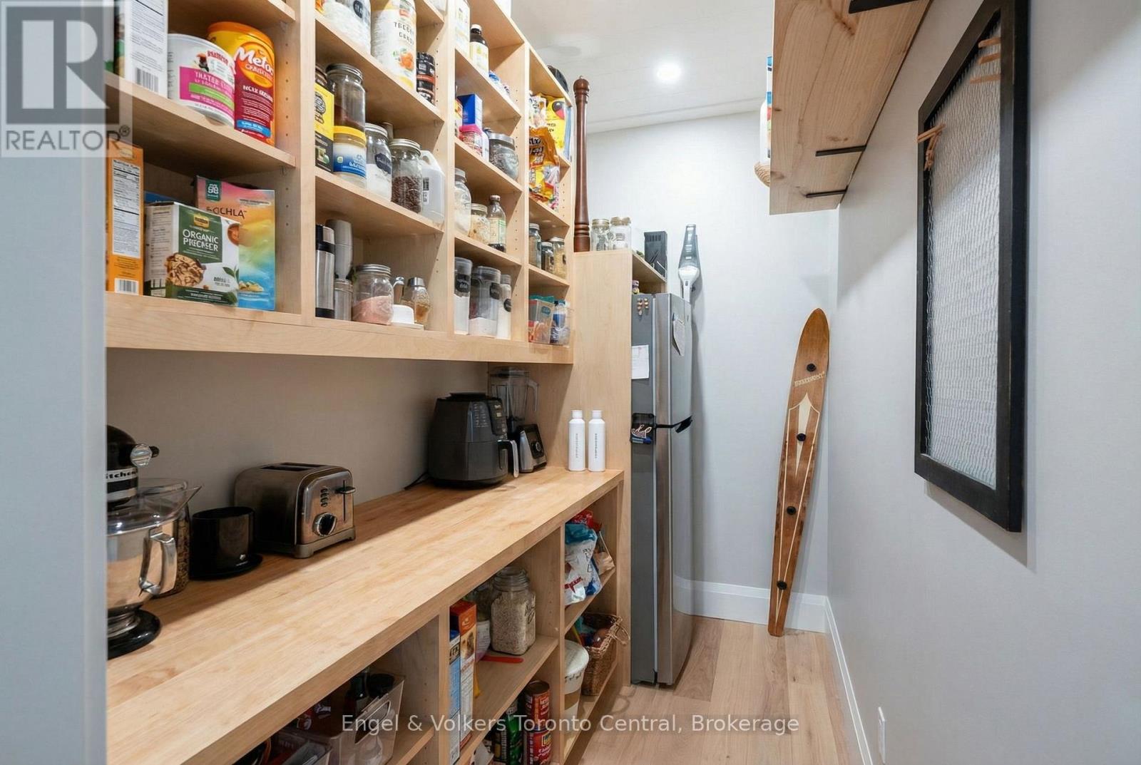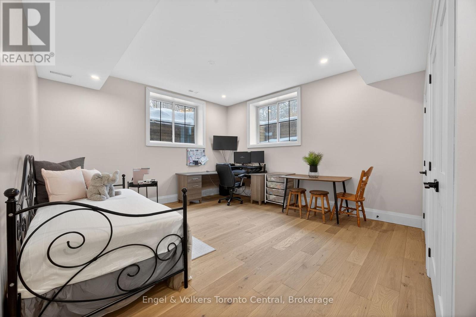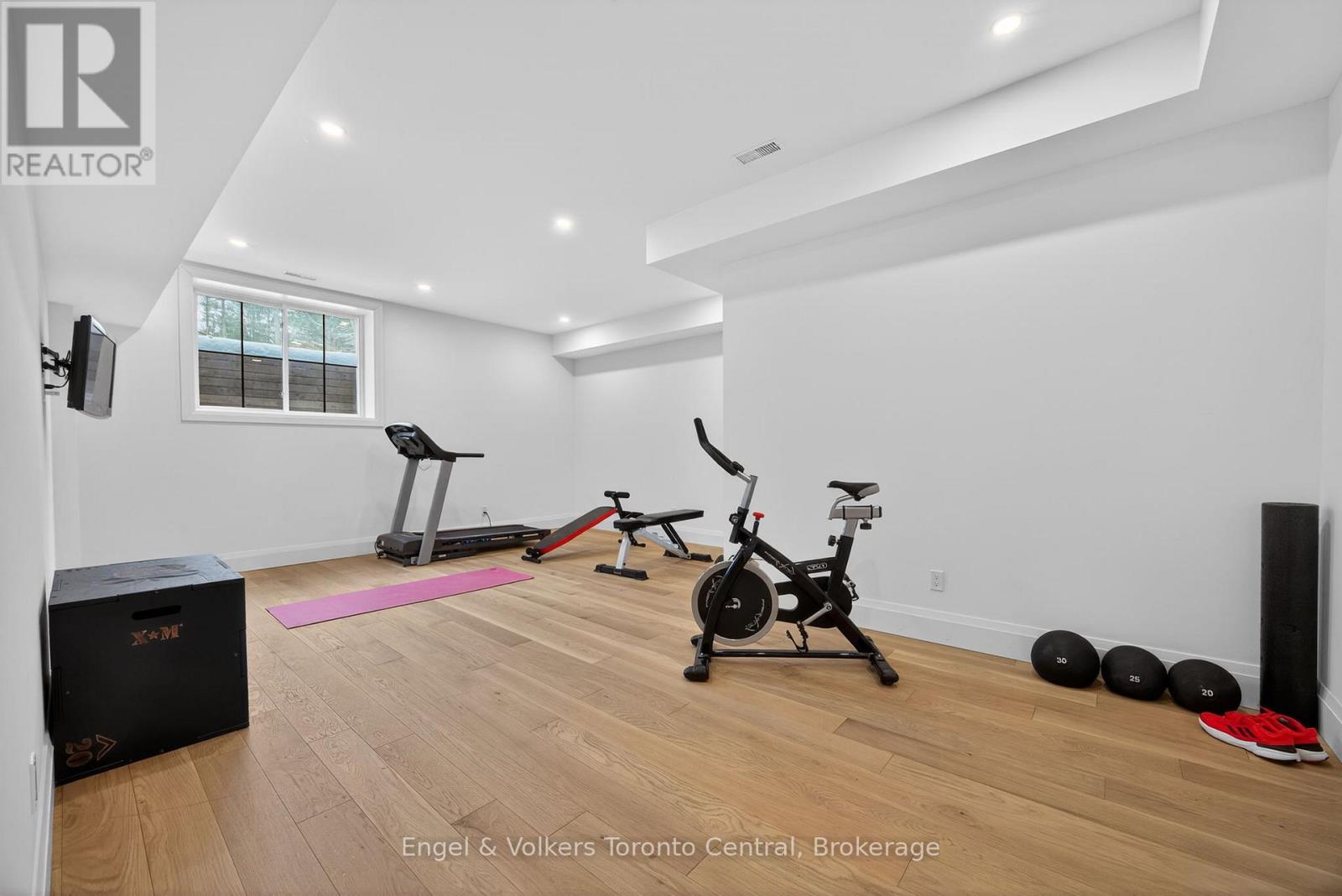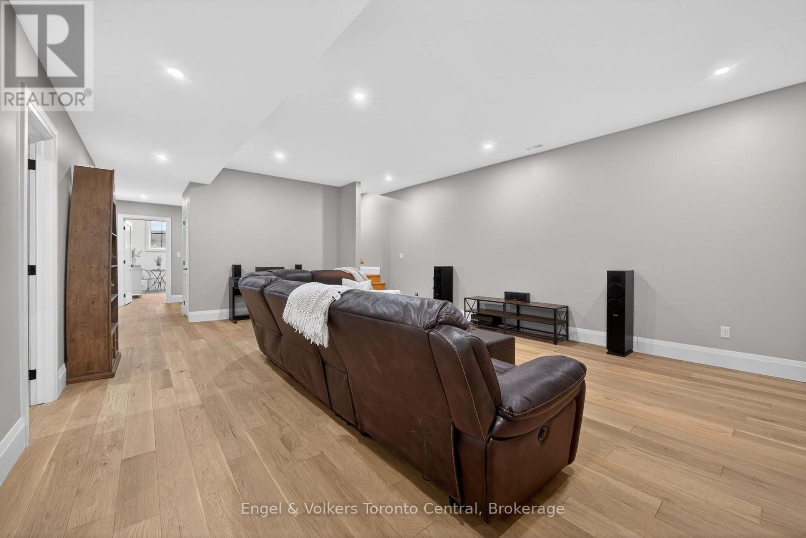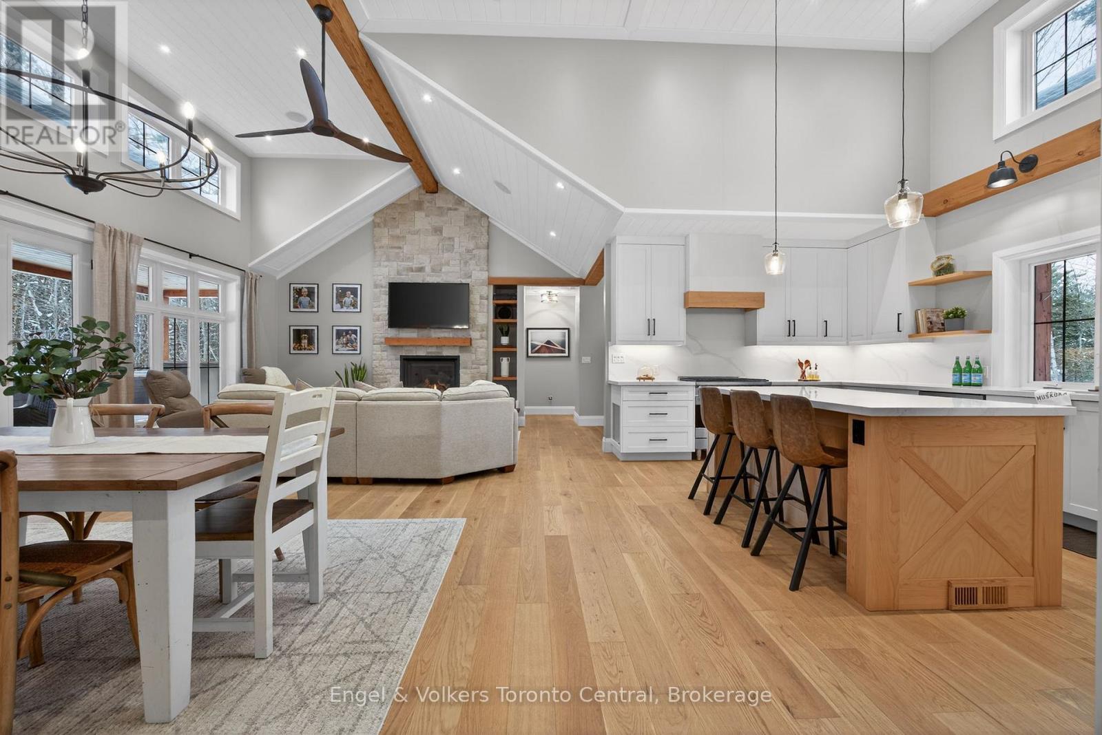 Executive country living just 7 minutes south of Gravenhurst and moments to Hwy 11 - offering seamless access to the GTA while enjoying complete privacy on a wooded 1-acre lot. Recently completed, this custom 5-bedroom residence blends refined Muskoka design with modern efficiency and exceptional build quality - ideal for professionals seeking space without sacrificing convenience. The open-concept main level features wide-plank white oak floors, vaulted v-groove ceilings with exposed beams, and expansive dormers that flood the home with natural light. A 42" gas fireplace anchors the living space, with walkout to a covered rear porch and hot tub for effortless year-round enjoyment. The custom kitchen is designed for both entertaining and everyday ease, showcasing quartz surfaces, premium appliances including a 36" gas range, generous island seating, wine storage and a hidden walk-in pantry with additional refrigerator. The primary suite offers vaulted ceilings, walk-in closet, and spa-inspired ensuite with heated floors and oversized glass shower. Two additional main-floor bedrooms provide flexible space for family or guests. The fully finished lower level with 9.5' ceilings adds 2 large bedrooms, recreation space, gym and full bath. Built for longevity and performance: ICF foundation, insulated slab, ZIP system sheathing, R-60 insulation, high-efficiency mechanicals, HRV, generator transfer switch and water filtration system. Oversized heated 2-car garage with car-lift potential plus a fully serviced detached shop with 100-amp service, washroom and in-floor heat - ideal for collectors, entrepreneurs, or home-based professionals. Private, polished, and purposefully designed - executive Muskoka living at its finest. (id:64974)