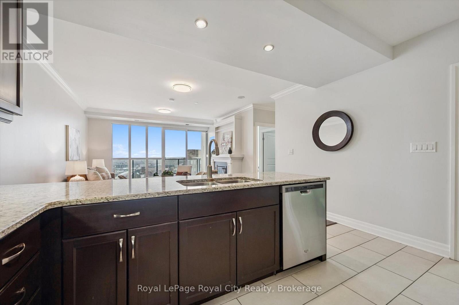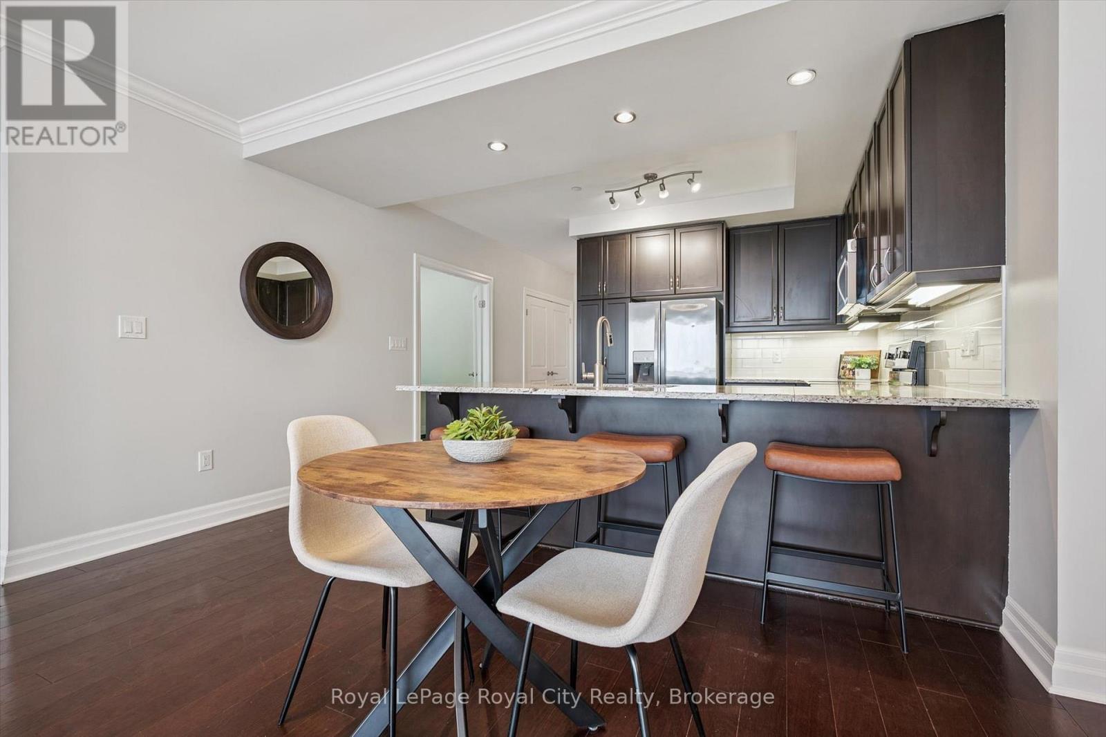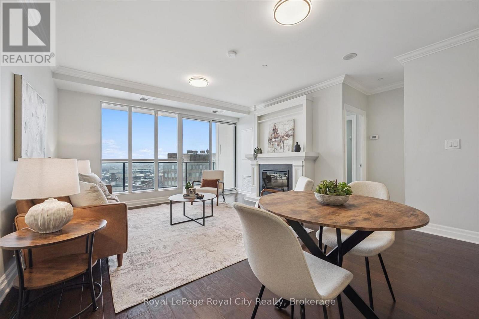 Welcome to Suite 1108 at The Riverhouse, one of Guelph's most sought-after condominium residences known for its quiet atmosphere, upscale feel, and exceptional management. Perfectly positioned in the heart of downtown, you're just steps from the GO Station, Sleeman Centre, River Run Centre, scenic walking trails, and Guelph's best restaurants, cafés, and shops - offering a truly walkable lifestyle. This spacious 1 bedroom plus den suite offers a highly functional and versatile layout. The large den with French doors is ideal as a second bedroom or work-from-home office. Rich hardwood flooring, granite countertops, modern lighting, and a cozy fireplace create a sophisticated living environment. The open-concept kitchen is designed for everyday living and entertaining, featuring full-size stainless steel appliances, ample cabinetry, and a peninsula with bar seating that flows into the generous living and dining area. Sliding doors lead to an oversized private balcony-perfect for enjoying sunset views over downtown. The bright primary bedroom boasts an oversized walk-in closet, with a spacious 4-piece bathroom offering abundant counter space (or easily convert to a dual vanity!). A welcoming foyer with double coat closet and a dedicated laundry/storage room with added cabinetry enhances everyday functionality. Residents enjoy exceptional amenities, including an incredible rooftop terrace with BBQs, elegant party room and lounge with kitchen, media room, library, fitness centre, and well-appointed guest suite. Recent updates include fresh paint, new bedroom carpeting, added laundry room cabinetry, modern lighting, new kitchen faucet, and new toilet. This unit also includes a well-located, owned parking space! Ideally suited for commuting professionals, modern couples, or downsizers seeking refined, low-maintenance living in an unbeatable location. *Most utilities are conveniently covered in the condo fees, and storage lockers are available to rent for $35 per month. (id:64974)
