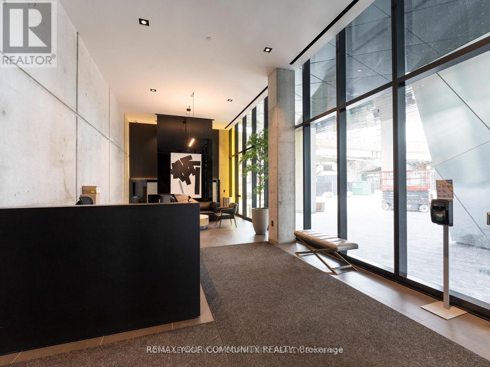 Welcome to Harris Square - a modern boutique loft-style corner unit boasting 608 sqft of contemporary living space plus an expansive 478 sqft terrace with breathtaking, unobstructed views of downtown. Conveniently located just steps from Leslieville, the Distillery District, St. Lawrence Market, and the Financial District. This modern loft features soaring 9-ft exposed concrete ceilings, stunning hardwood floors throughout, a sleek kitchen, and a spa-inspired bathroom. The loft is surrounded by floor to ceiling windows so you have a stunning view from every corner of the apartment. The most unique feature of this condo is the luxurious wraparound balcony with NE city views and a gas line for a barbecue perfect for hosting. Building amenities include an executive concierge, a fully-equipped gym, a serene yoga space, guest suite, party room, and a rooftop terrace with panoramic views. Additional perks include a kids' playroom, a library, and more. The unit comes complete with stainless steel appliances (fridge, stove, built-in dishwasher, and all-in-one washer/dryer), as well as a dedicated parking spot and locker. (id:64974)