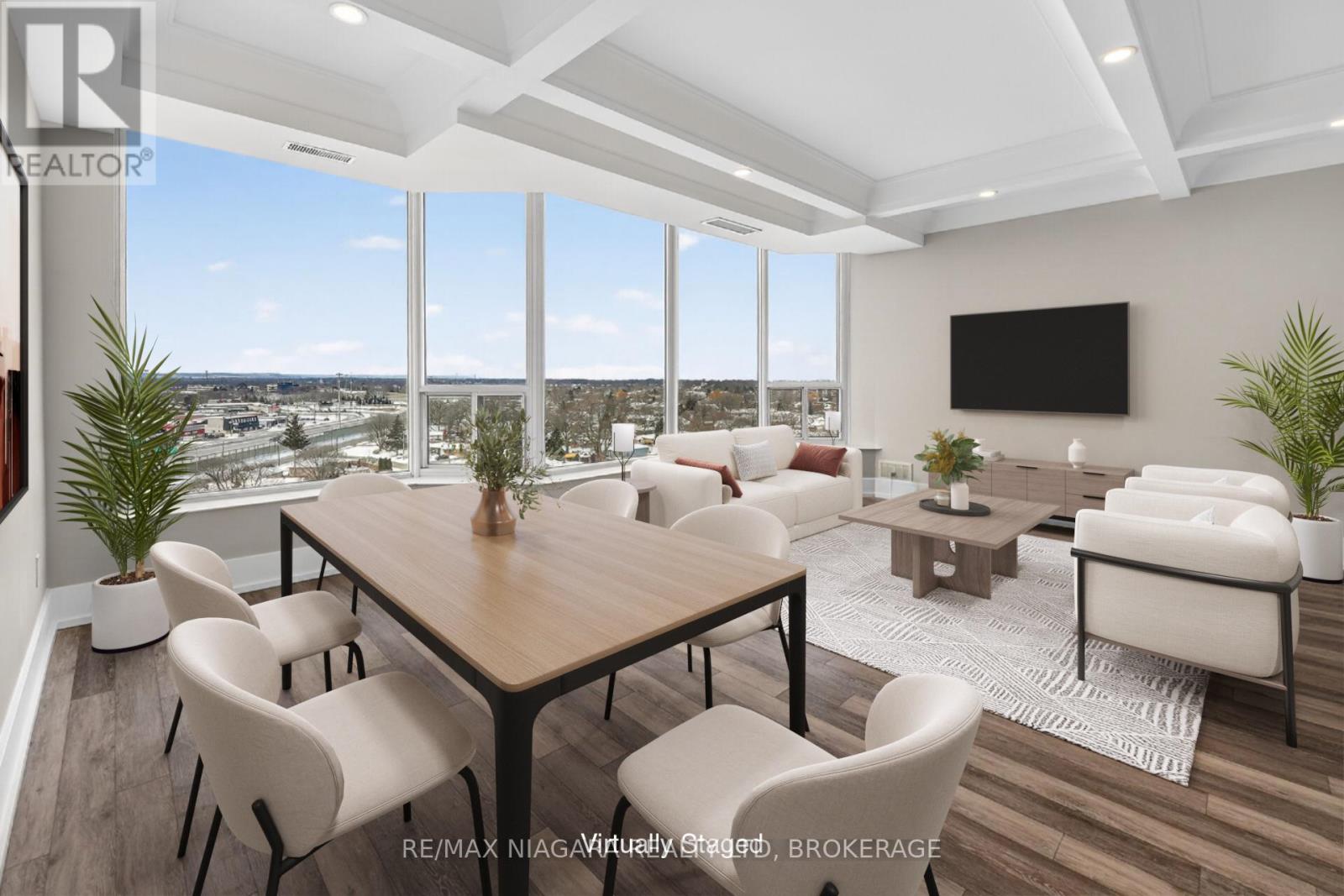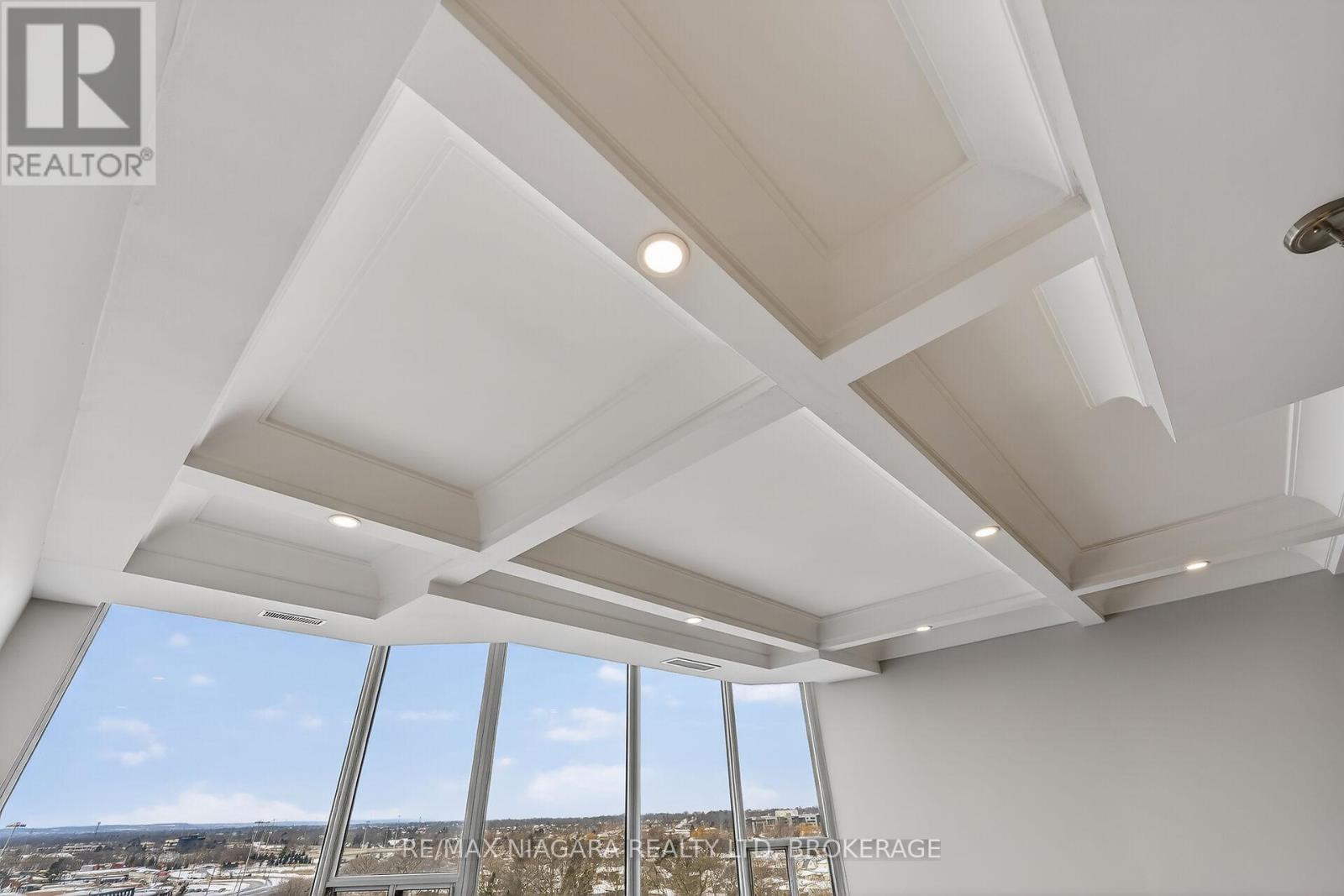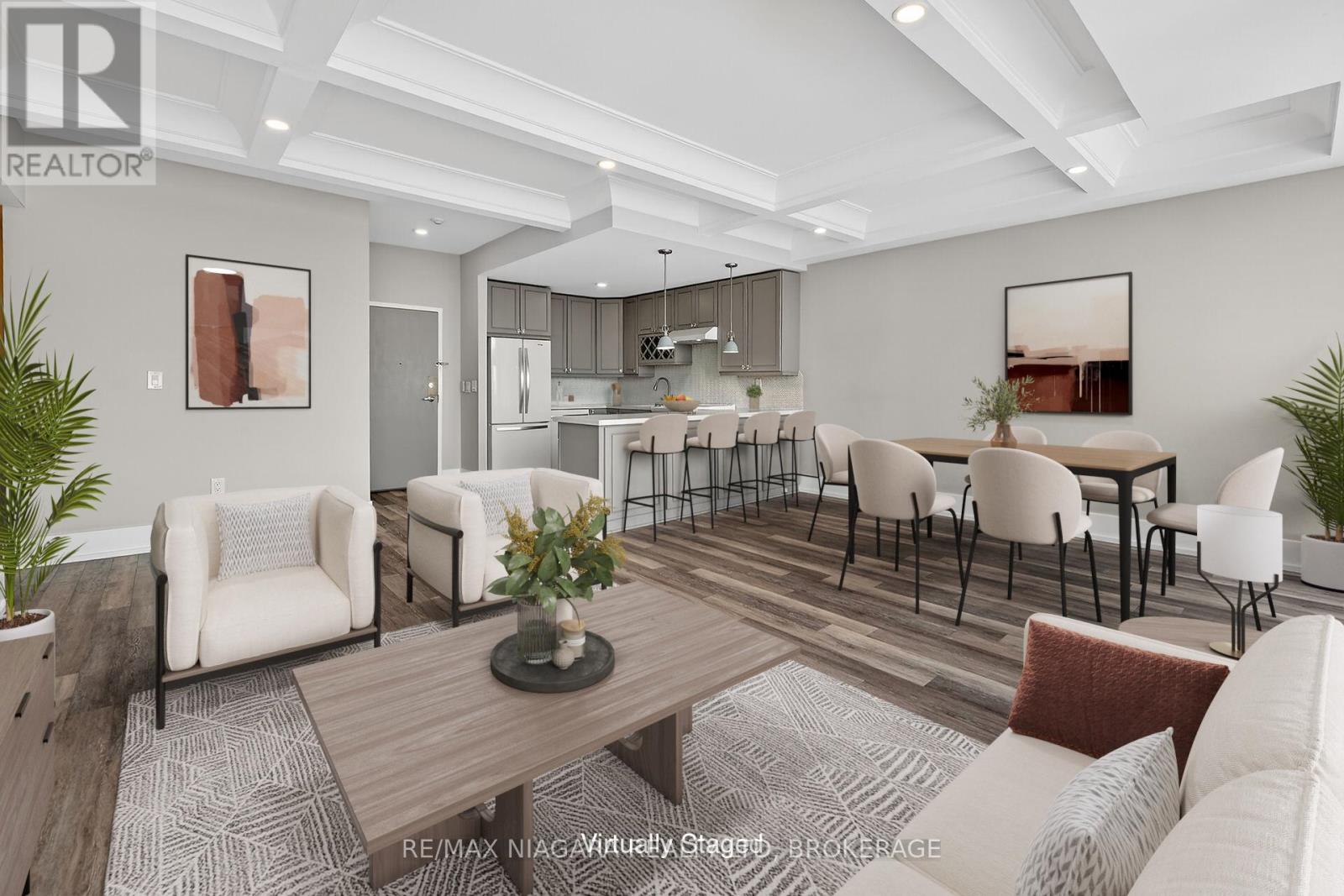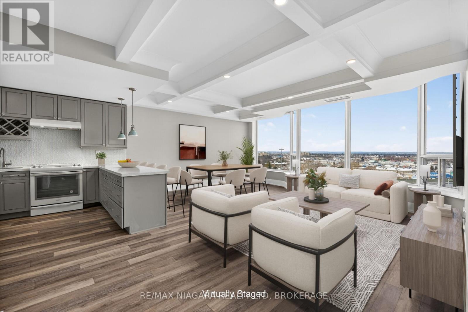Beautifully updated, modern luxury penthouse 1-bedroom + den condo with bright west exposure, offering stunning sunsets and panoramic city and lake views. Completely move-in ready-just bring your furniture and hang your clothes. Features include 9-foot coffered ceilings with pot lights in the living and dining areas, plank flooring throughout, and a spacious kitchen with quartz countertops and ample cupboard and drawer space. The updated bathroom offers a walk-in shower. The bedroom is generously sized, and the den provides extra living space with a bow-window sitting area. Includes in-suite laundry, central air, and remote-controlled roller blinds (except in the den).One underground parking space, a large in-suite storage room, and an additional storage locker are included. Extra parking is available. The building sits on approximately 3.3 acres of beautifully landscaped grounds and offers exceptional amenities: heated saltwater pool, BBQ areas, waterfall seating areas, car wash bay, guest suite, party room, billiards and exercise rooms, bicycle storage, ample visitor parking, and high-speed internet included in the condo fees. Walking distance to shops, transit, restaurants, and Fairview Mall, with easy access to the QEW. Ideal for retirees or busy professionals. Includes fridge, stove, dishwasher, washer, and dryer. Buy now at a great price and rent it out until you're ready to move in-an ideal opportunity for future planning. Please note: dogs and smoking are not permitted. (id:64974)