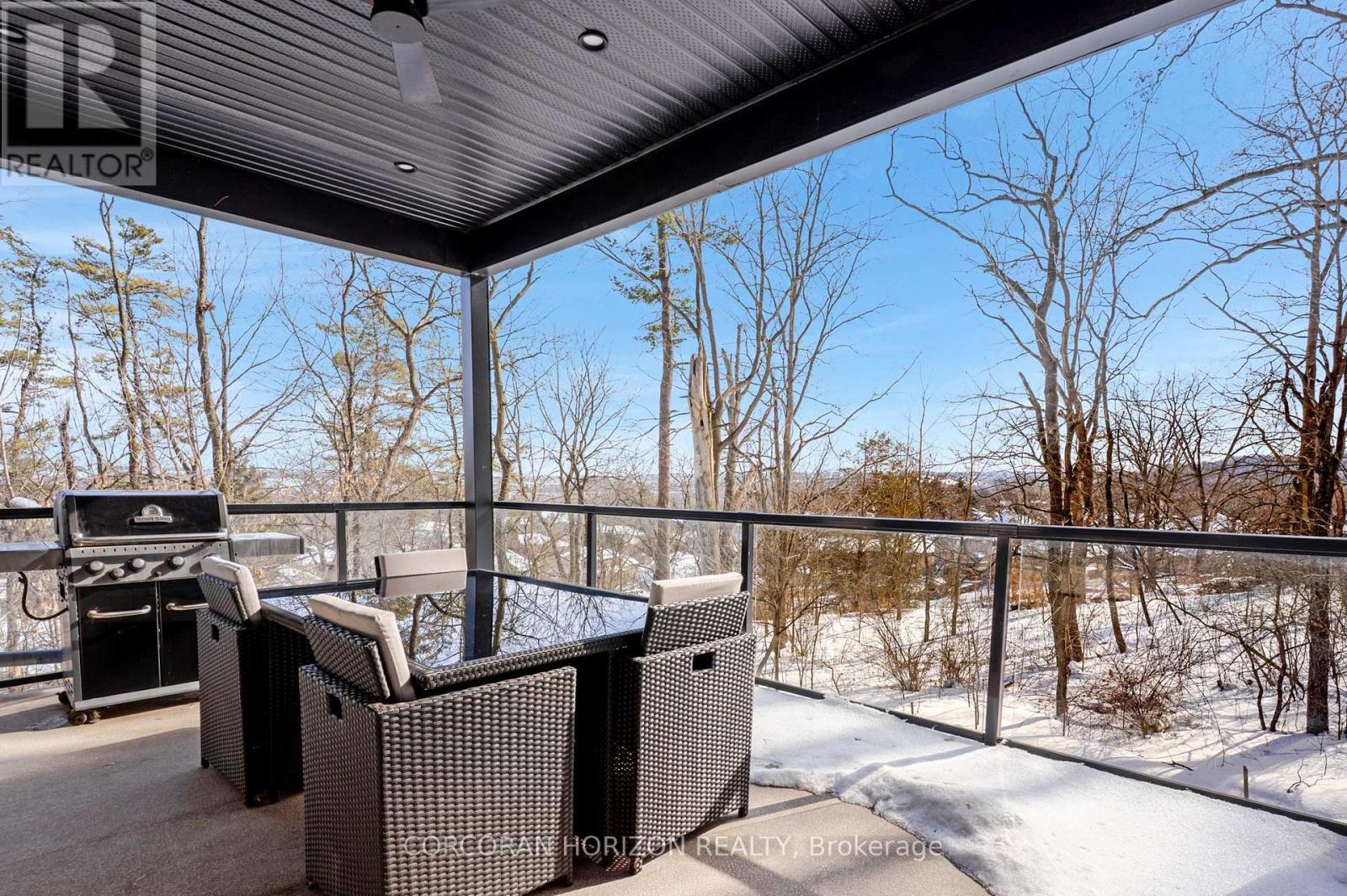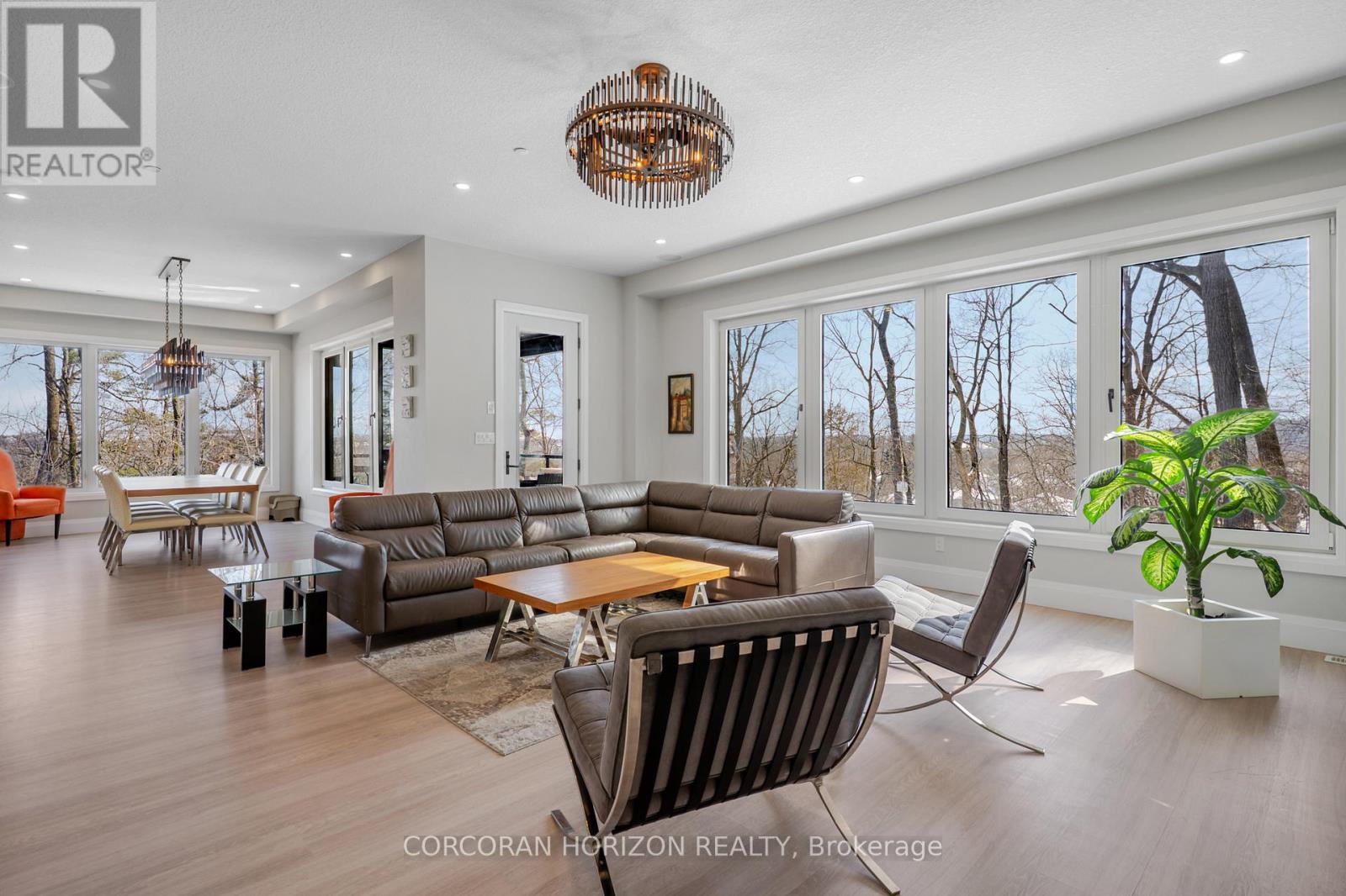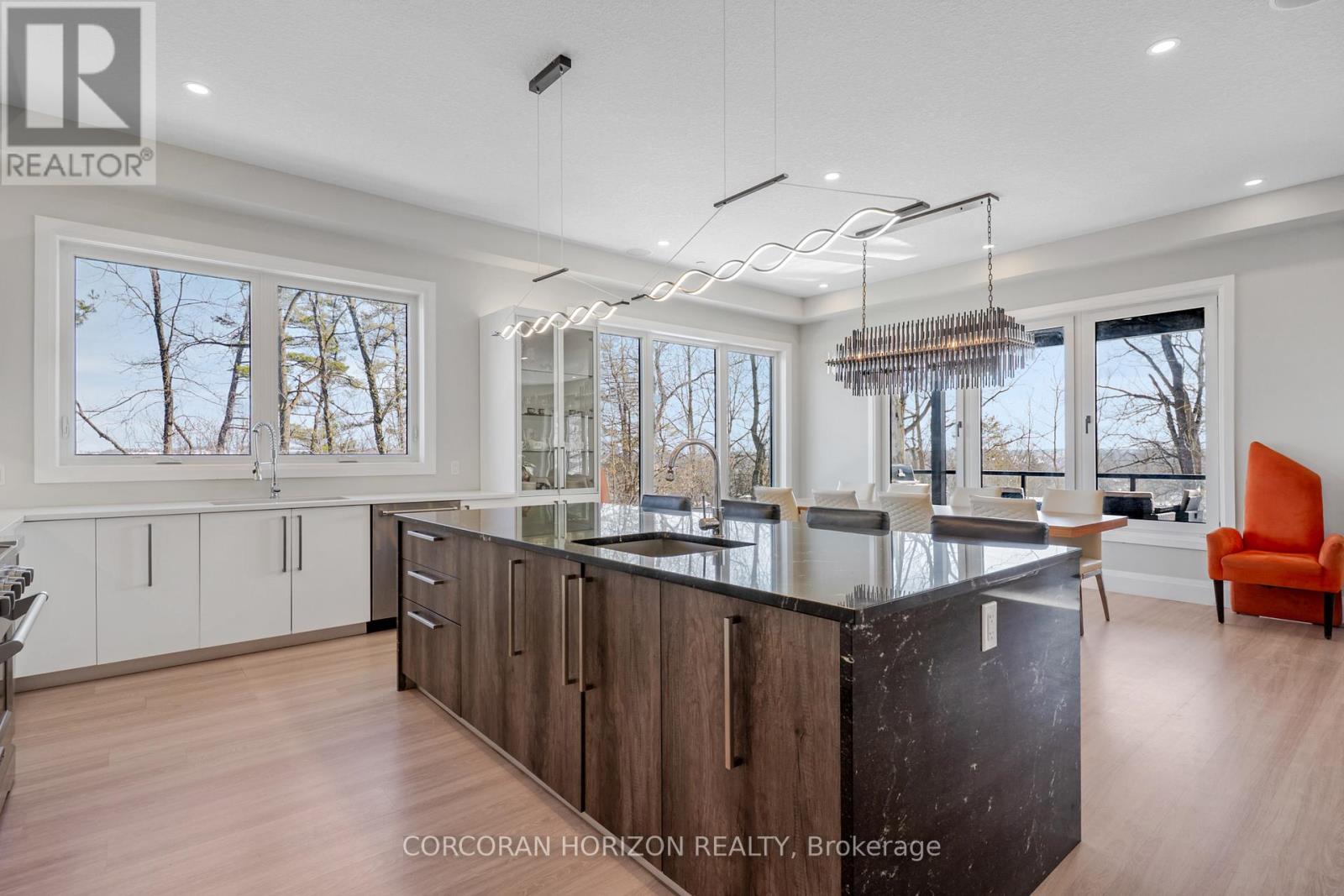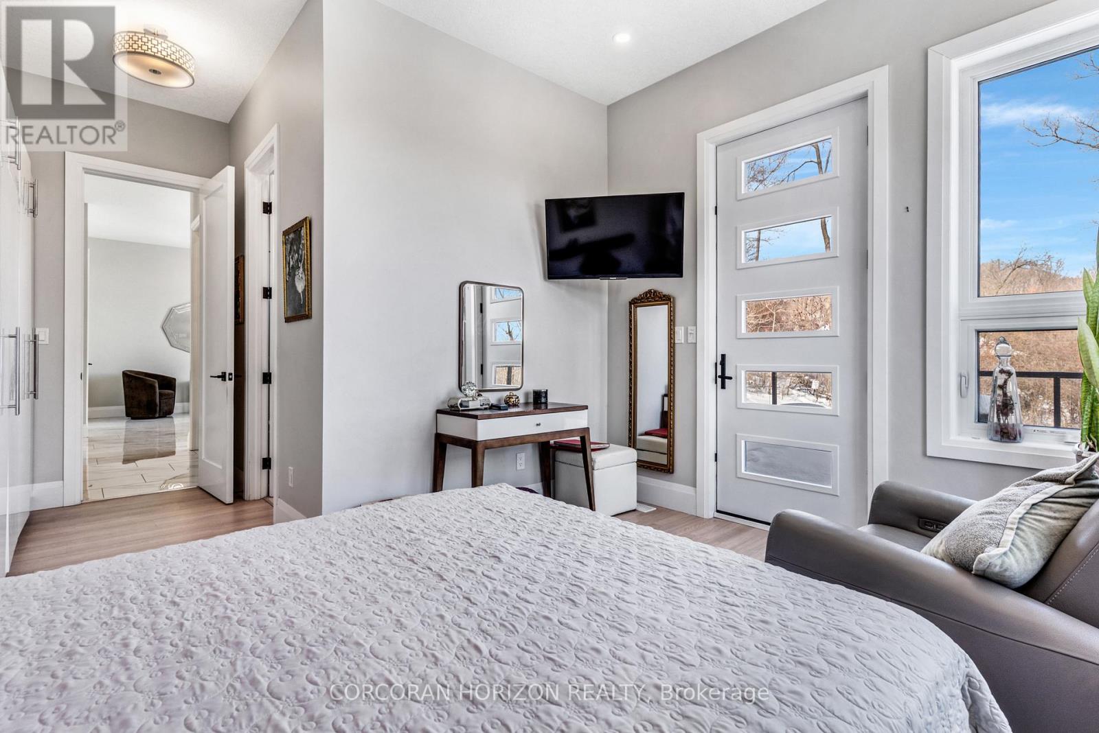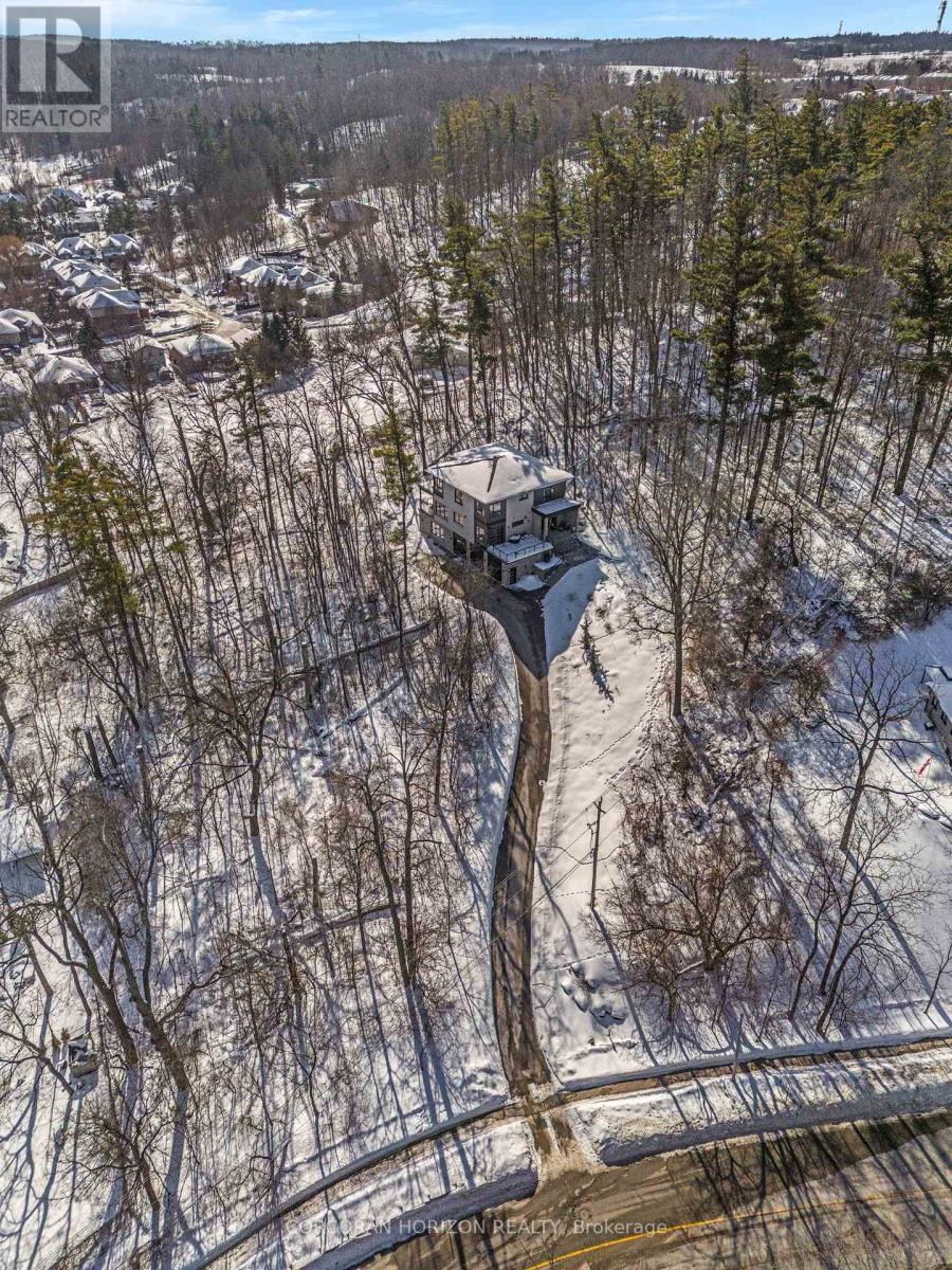 Welcome to 111 Grand Ridge Drive, an extraordinary 4,600 sq ft estate residence set on 3 acres of protected Carolinian forest, offering a rare combination of refined design and natural seclusion just minutes from the downtown core and highway access. This south-facing home is filled with natural light and elevated by 10-foot ceilings on every level, a fully carpet-free interior, and a private elevator providing effortless access throughout. The main level presents an elegant open concept layout designed for both grand entertaining and comfortable daily living. The chef inspired kitchen is a true focal point, featuring a striking granite waterfall island sourced via Latia Brazil, quartz surfaces, premium appliances, an expansive servery, and a generous butler's pantry. A private main floor bedroom with its own ensuite offers ideal accommodations for guests or extended family. Two large decks extend the principal living areas outdoors, creating a seamless connection to the surrounding forest. Upstairs, four spacious bedrooms include a luxurious primary retreat complete with European windows, a substantial walk-in closet, a spa-like ensuite bath, and a private deck overlooking the treed landscape. The fully finished walk-out lower level adds exceptional versatility with an additional bedroom, full bath, and recreation space anchored by an impressive 12-foot sliding door leading to the landscaped grounds. Constructed with attention to quality and performance, this home features full spray foam insulation, 400 amp service with generator rough-in, an owned hot water heater with recirculating pump, owned soft water system, interior sprinkler system, hard-wired interior and exterior speaker system, and soffit lighting on a timer. The approximately 1,000 sq ft triple car garage offers oversized 10 ft wide by 9 ft high doors, EV rough-in, and Wi-Fi enabled openers, ideal for collectors or hobby enthusiasts. (id:64974)