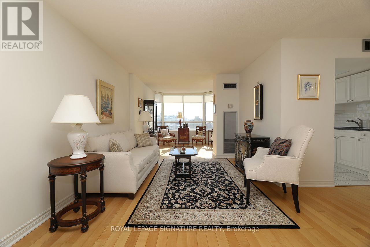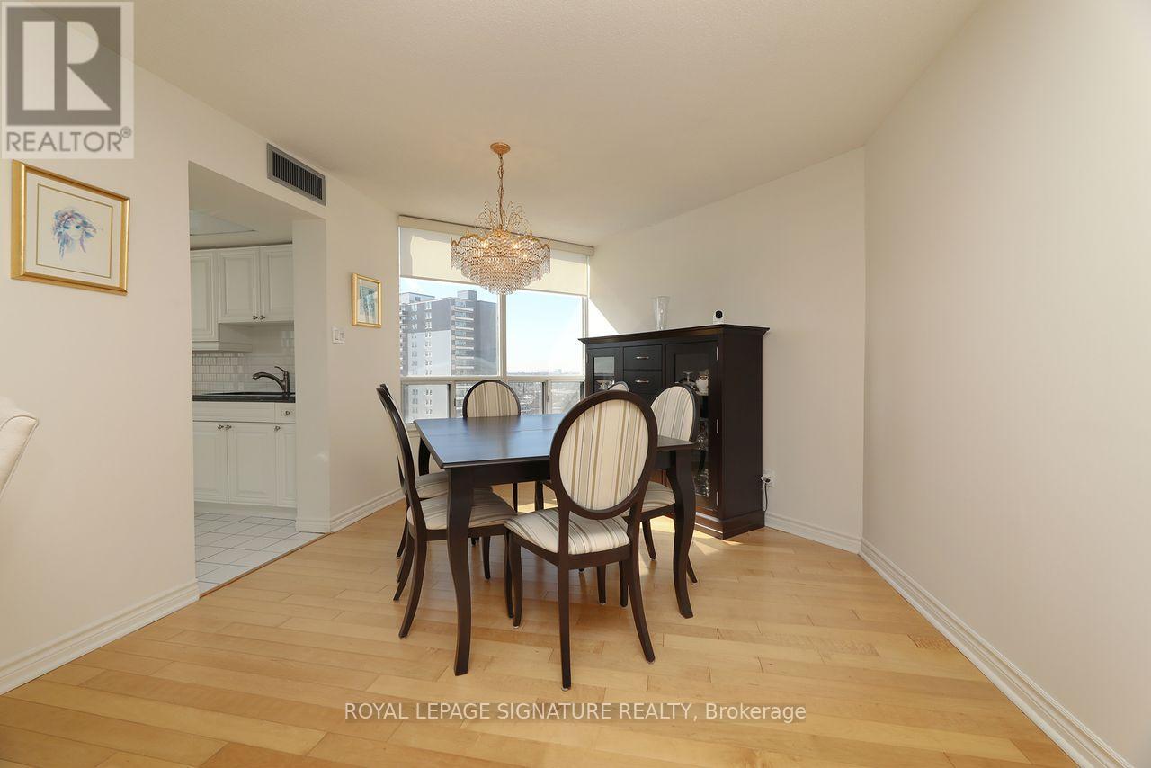 Luxury "Primrose" condos. Bright, spacious, south-facing suite over 1200 sq. ft. Upgraded kitchen with 4 appliances, Updated ensuite & main bathrooms. Large, bright, white, eat-in kitchen with windows, L-Shape living and dining rooms, 2 good size bedrooms with walkouts to the south facing balcony. Engineered hardwood floors throughout. Neutral decor. Ensuite laundry. (id:64974)