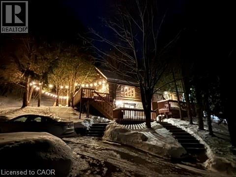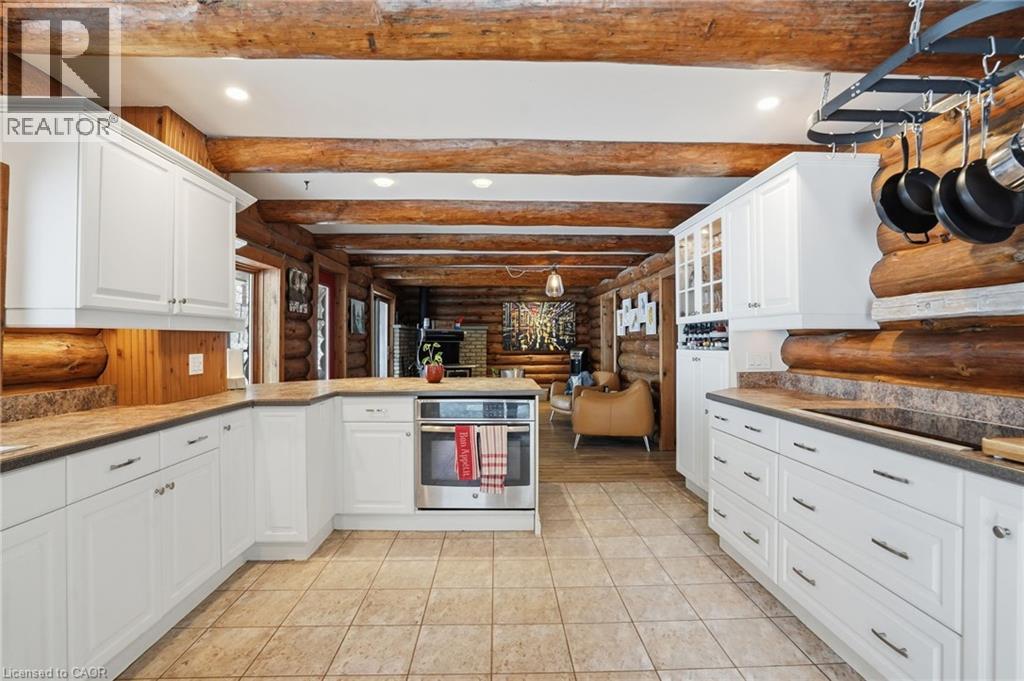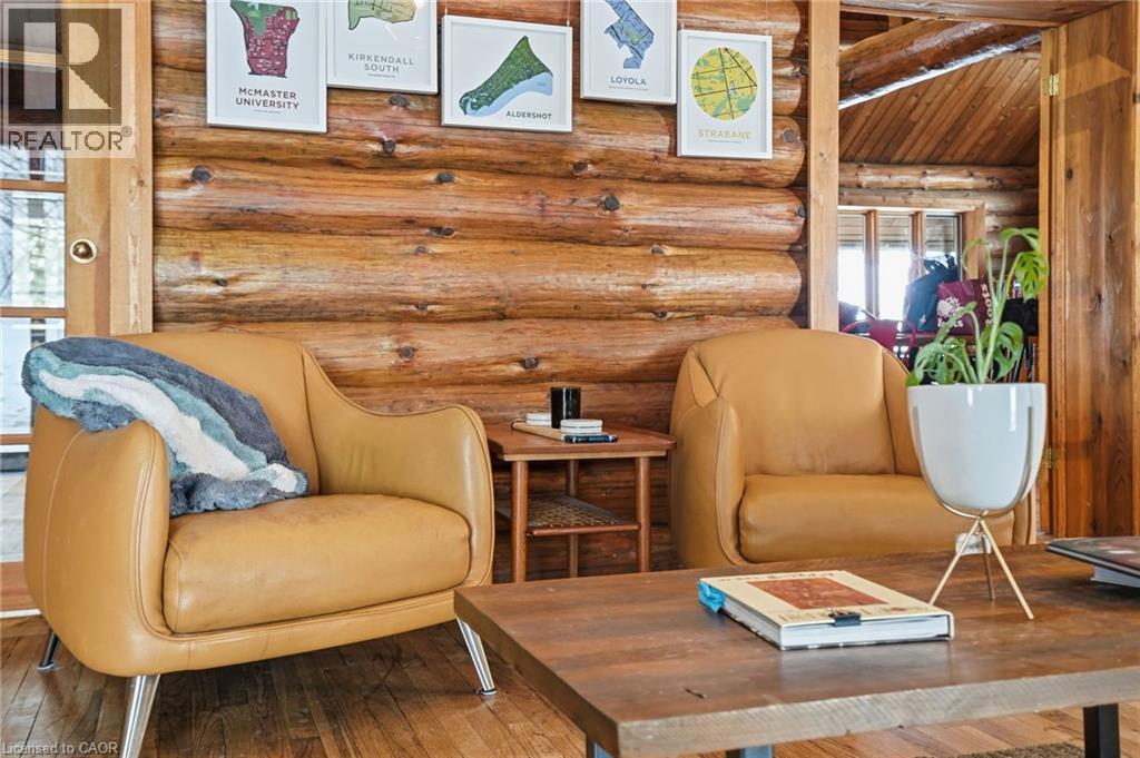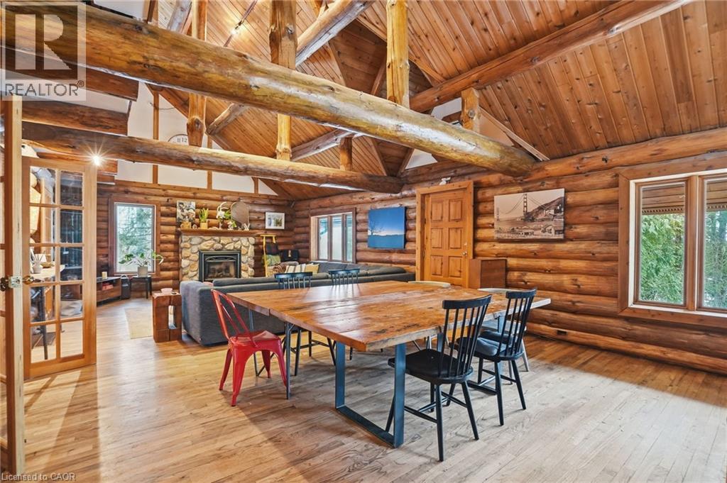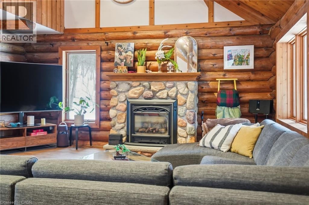 Introducing this beautifully crafted 1,771 square foot log bungaloft offering the perfect blend of rustic charm and modern comfort in a peaceful country setting. Soaring vaulted ceilings with exposed log beams create a warm and inviting first impression in the massive living and dining area, complete with a cozy gas fireplace. The spacious kitchen features abundant counter space and overlooks the welcoming family room warmed by an Elmira wood stove, ideal for gatherings year-round. Step outside to enjoy two separate decks, one off the family room and another off the kitchen, perfect for entertaining or relaxing in nature. The upper-level primary retreat offers a generous walk-in closet; large enough to double as a nursery or home office and a beautifully renovated ensuite with dual vanities and a glass-enclosed shower. The finished walk-out lower level adds exceptional living space with two well-sized bedrooms, an updated 3-piece bath and a comfortable rec room with its own gas fireplace. Outdoors, you’ll find a detached single-car garage, a charming chicken coop and a powered shed with 100-amp service—originally planned as a home office. A concrete pad is ready for your future hot tub, while walking trails right at your doorstep complete this serene and private country lifestyle. This is more than a home—it’s a retreat. Don’t be TOO LATE*! *REG TM. RSA. (id:64974)