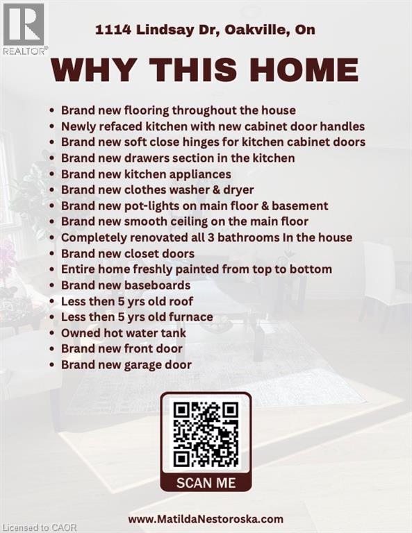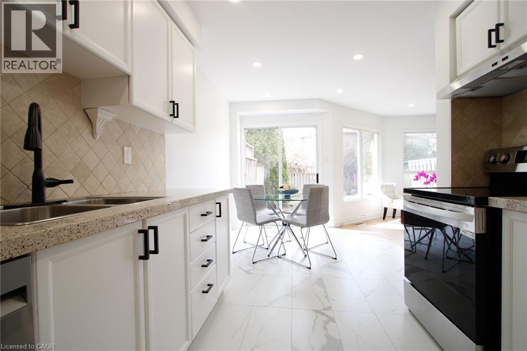 Live in Glen Abbey – Walk to Parks, Trails, Shopping & great Schools!Beautifully updated townhouse in the highly sought-after Glen Abbey neighbourhood—known for its top-rated schools, family-friendly atmosphere, and unbeatable convenience. An ideal setting for growing families! This fully renovated and freshly painted home showcases a stunning eat-in kitchen featuring soft-close cabinetry, quartz countertops, stylish backsplash, and brand-new appliances. The main floor is enhanced with new pot lights, modern baseboards, and upgraded flooring throughout. Enjoy completely renovated bathrooms, new carpeting on the upper level and in the basement, and thoughtful upgrades at every turn. The spacious primary bedroom offers a versatile lounge area—perfect for a home office, nursery, or personal gym—along with his-and-hers closets with new doors and a beautifully updated ensuite. Two additional generously sized bedrooms easily accommodate queen-size beds or larger. Additional upgrades include new closet doors, front door, garage door, and a brand-new washer and dryer. Roof approximately 4 years old, plus a newer furnace—providing peace of mind for years to come. Step outside and walk to Old Abbey Lane Park, where you can enjoy scenic trails, a playground, and a splash pad for kids. Just steps to Dorval Crossing offering everyday conveniences including grocery stores, restaurants, shopping, medical offices, and more. Minutes to Glen Abbey Golf Club, QEW, Oakville GO Station, downtown Oakville, and the lake. (id:64974)