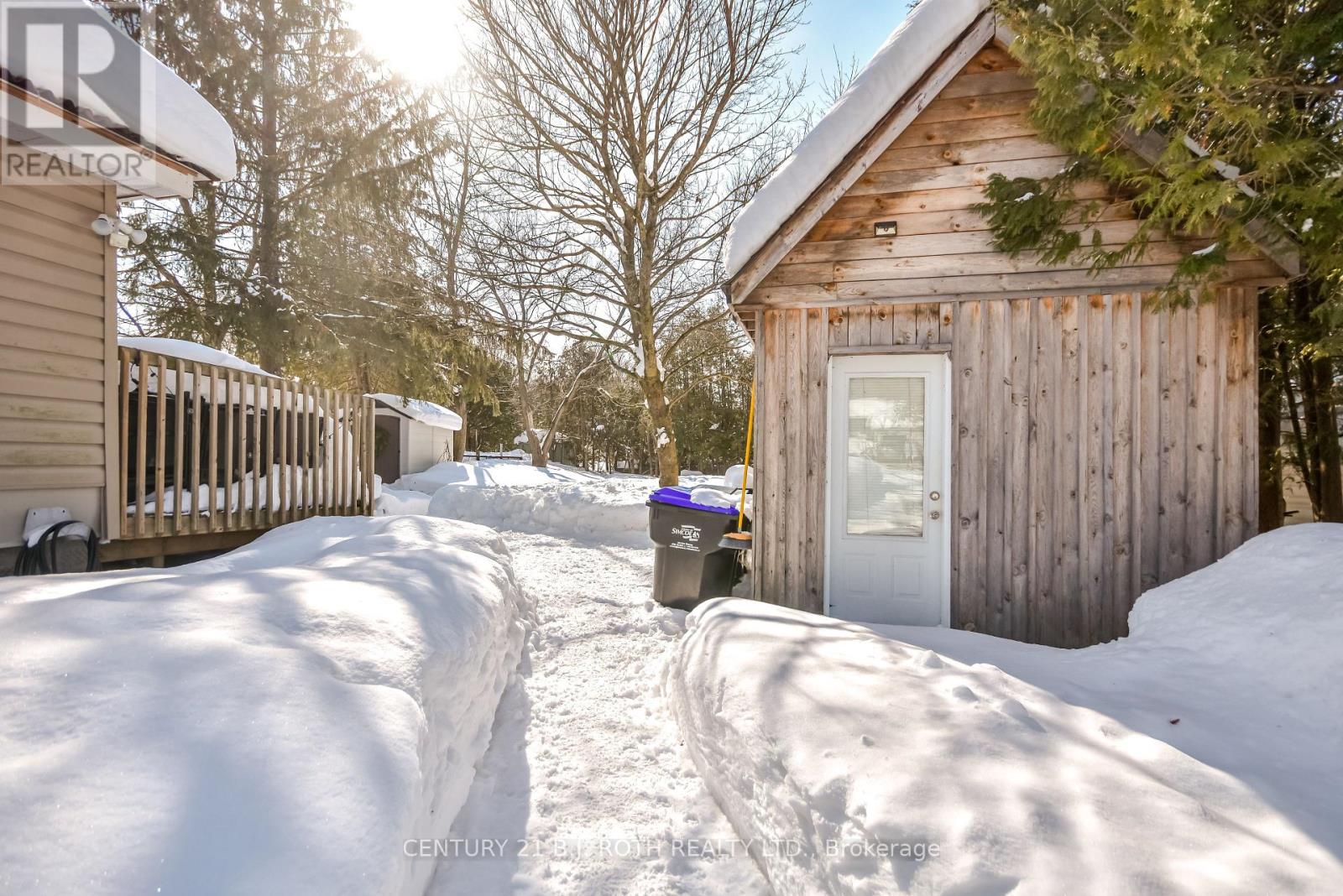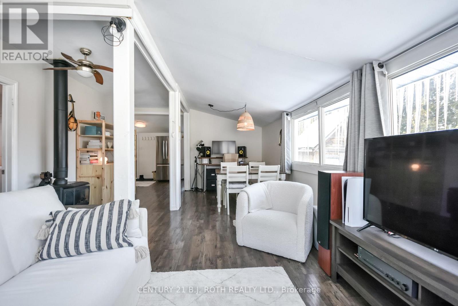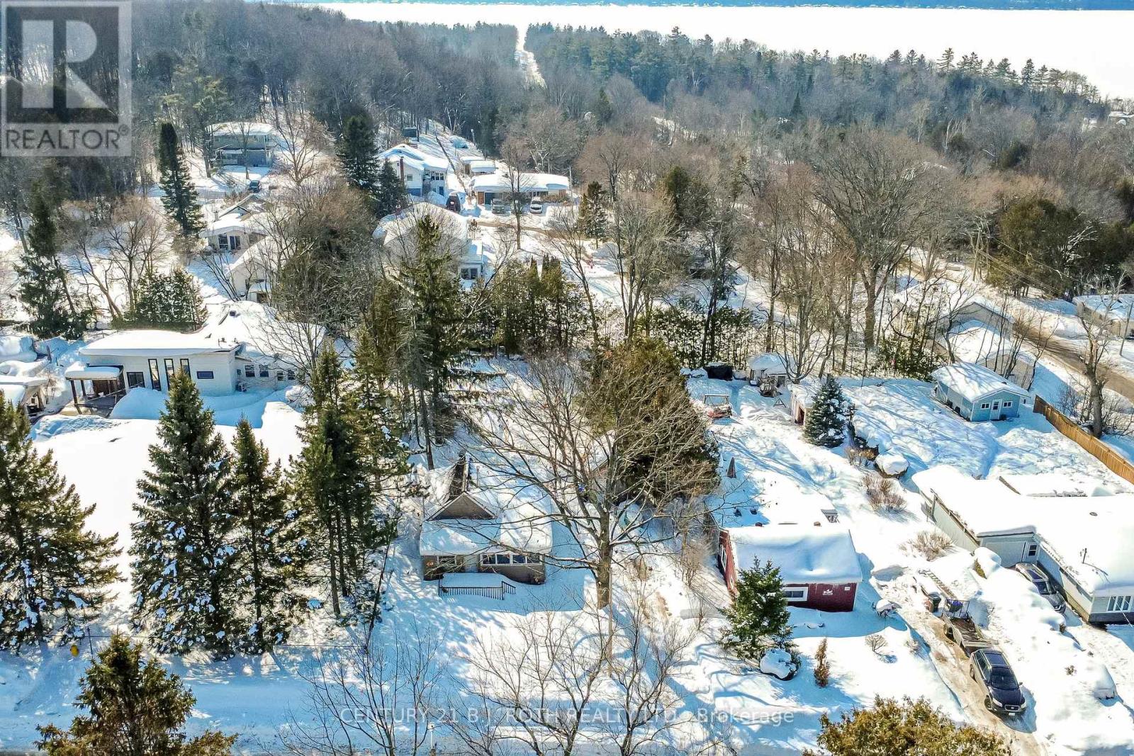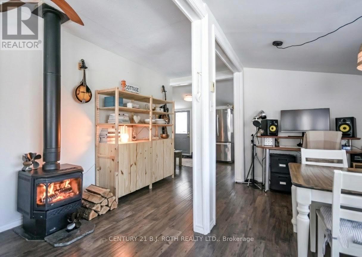 Charming, move-in ready bungalow just moments from the lake, offering an incredible opportunity to enjoy lakeside living without the waterfront price tag. This bright and inviting 2-bedroom, 1-bath home features approximately over 700 square feet of thoughtfully designed space with an open-concept living and dining area filled with natural light. Large windows create an airy feel, while the Napoleon gas fireplace (recently serviced) adds warmth and cozy character - perfect for year-round comfort. The sun-filled front living area offers flexible space for relaxing or entertaining, and the neutral finishes throughout make the home feel fresh and welcoming. Set on a mature, treed lot in an established neighborhood, the property also includes a detached outbuilding ideal for storage, workshop or hobbies. Conveniently located just minutes from Highway 400 and within easy reach of Midland and Orillia, and Muskoka, this home offers an ideal balance of peaceful surroundings and commuter-friendly access. Just a short distance to the lake, you can enjoy nearby beaches/swimming, stunning waterfront trails (walking/biking), boating, shopping and year-round recreation while still benefiting from privacy and affordability. The driveway easily accommodates 4 cars. Whether you're a first-time buyer, downsizer, or looking for a weekend escape, this property delivers charm, location, and lifestyle at an accessible price point. (id:64974)