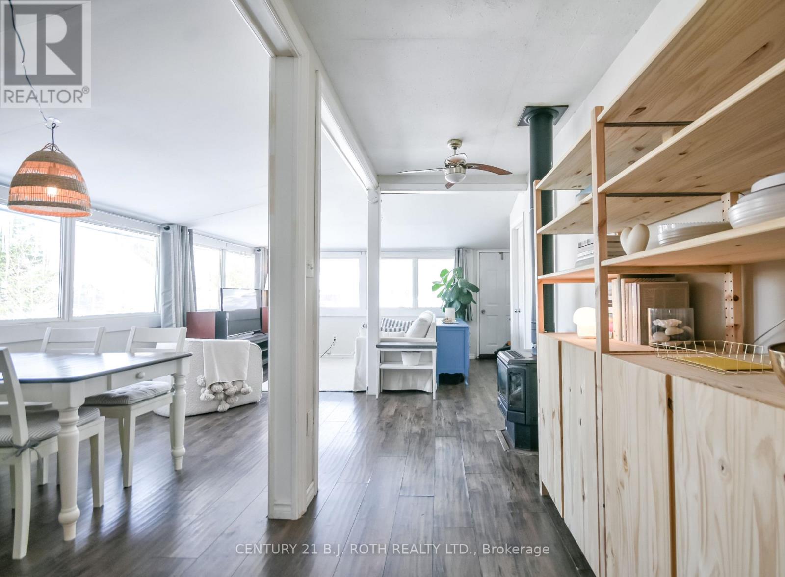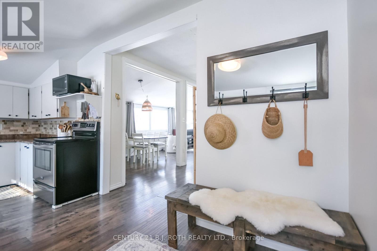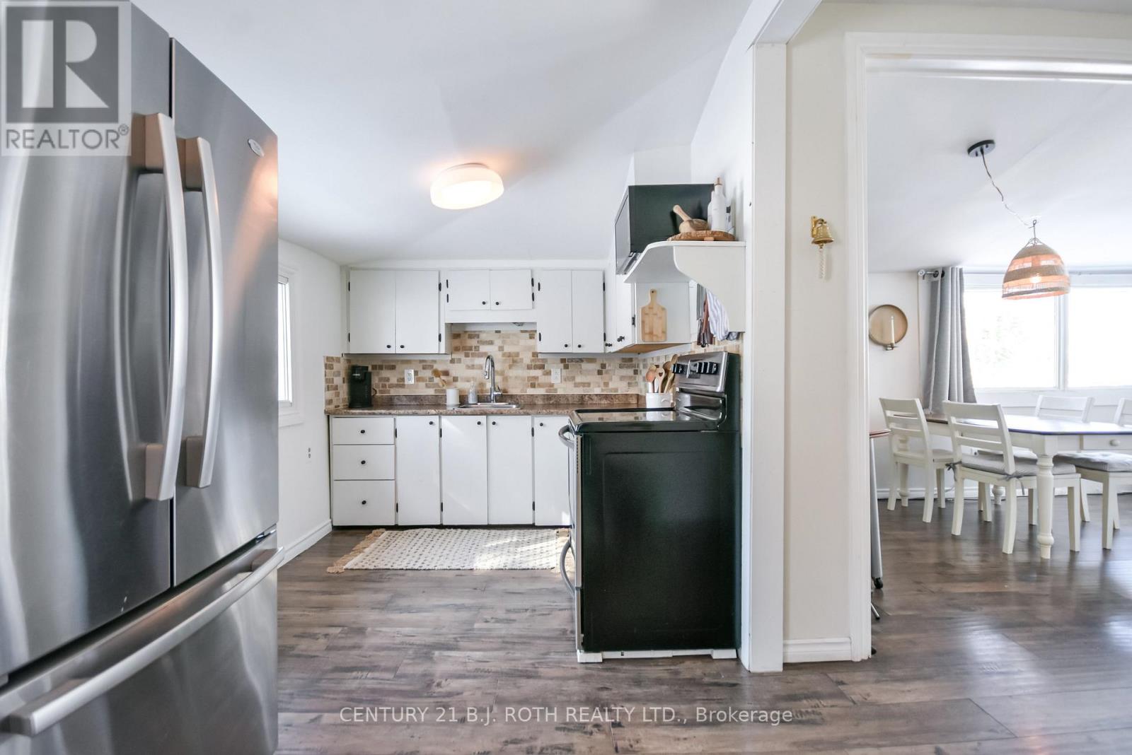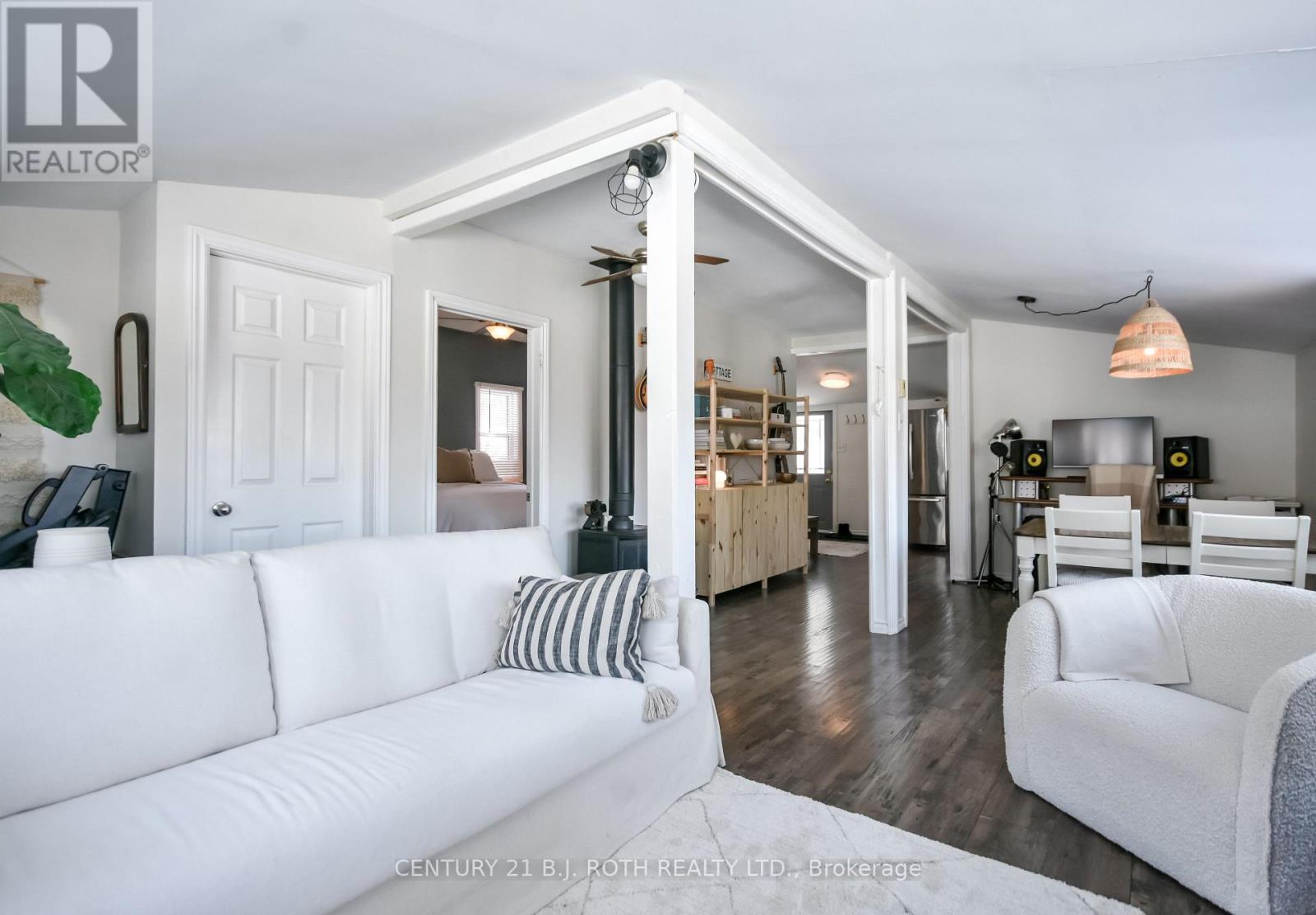 Charming, move-in ready bungalow just moments from the lake, offering an incredible opportunity to enjoy lakeside living without the waterfront price tag. This bright and inviting 2-bedroom, 1-bath home features approximately over 700 square feet of thoughtfully designed space with an open-concept living and dining area filled with natural light. Large windows create an airy feel, while the Napoleon gas fireplace (recently serviced) adds warmth and cozy character - perfect for year-round comfort. The sun-filled front living area offers flexible space for relaxing or entertaining, and the neutral finishes throughout make the home feel fresh and welcoming. Set on a mature, treed lot in an established neighborhood, the property also includes a detached outbuilding ideal for storage, workshop or hobbies. Conveniently located just minutes from Highway 400 and within easy reach of Midland and Orillia, and Muskoka, this home offers an ideal balance of peaceful surroundings and commuter-friendly access. Just a short distance to the lake, you can enjoy nearby beaches/swimming, stunning waterfront trails (walking/biking), boating, shopping and year-round recreation while still benefiting from privacy and affordability. The driveway easily accommodates 4 cars. Whether you're a first-time buyer, downsizer, or looking for a weekend escape, this property delivers charm, location, and lifestyle at an accessible price point. (id:64974)