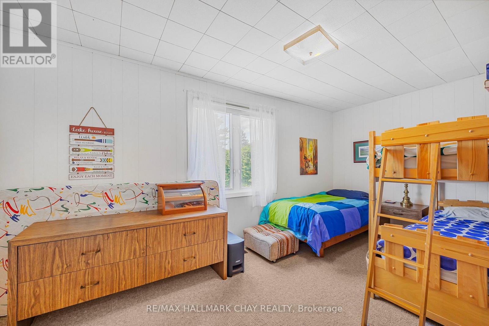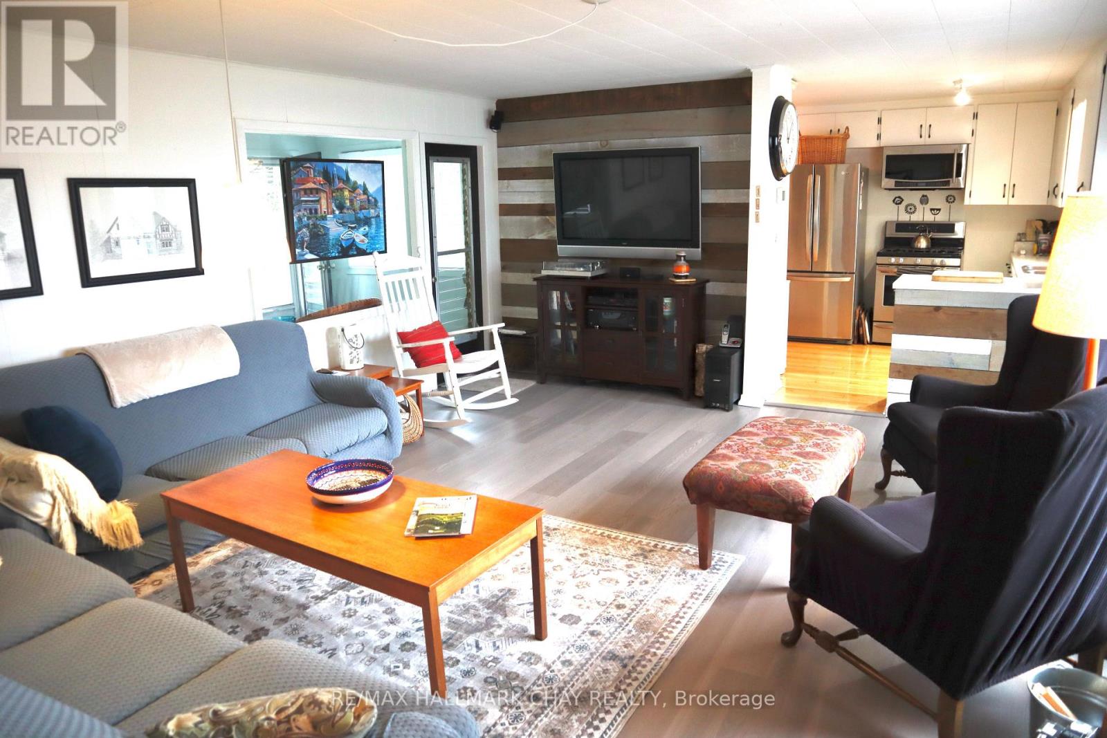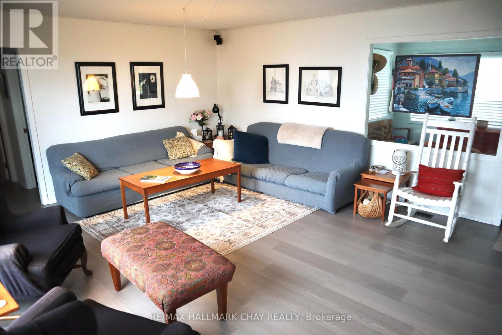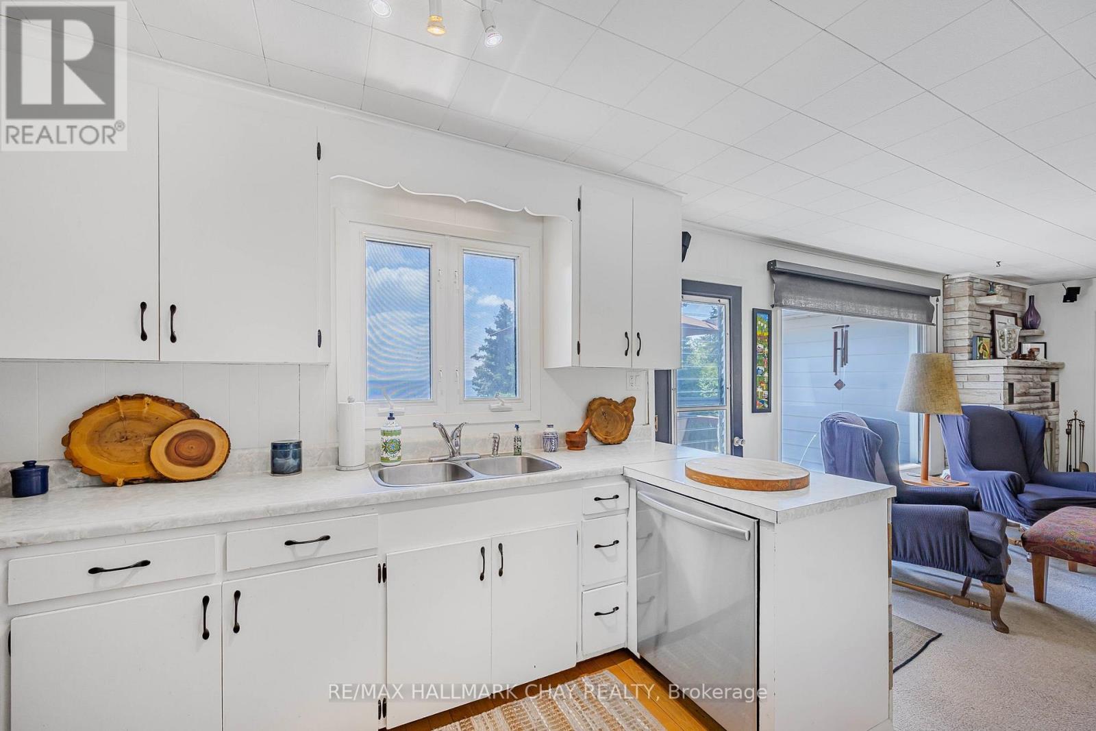 Welcome to your private lakeside retreat, featuring 72 feet of pristine, hard-bottom and sparkling, crystal-clear water-ideal for swimming, boating, and unforgettable sunsets. This fully winterized 3-bedroom, 2-bathroom bungalow is nestled on a beautifully treed lot, offering a peaceful natural setting with uninterrupted lake views from the moment you arrive.The open-concept living area showcases new vinyl flooring, a cozy wood-burning fireplace, and a walkout to an expansive deck that extends toward the water-perfect for relaxing or entertaining just steps from the lake. The lakeside eat-in kitchen blends function and scenery, featuring stainless steel appliances including a 6-burner gas stove, fridge, and dishwasher, all complemented by panoramic shoreline views.Wake up to the beauty of the lake in the primary bedroom with ensuite. Two additional bedrooms and a full 4-piece bath provide comfortable accommodations for family or guests. The lower level offers laundry facilities and ample storage space.The true showstopper is the impressive 30' x 33' waterfront deck-an ideal setting for lakeside lounging or summer gatherings, enhanced by the gentle sounds of the water below. Enjoy the ultimate lake lifestyle with a 26.5' x 16' boathouse complete with a marine railway, perfectly suited for your boat and water toys. Above, a 29' x 18' concrete rooftop deck creates an unforgettable space for evening entertaining under the stars.This is more than a home-it's a lifestyle on the lake. (id:64974)