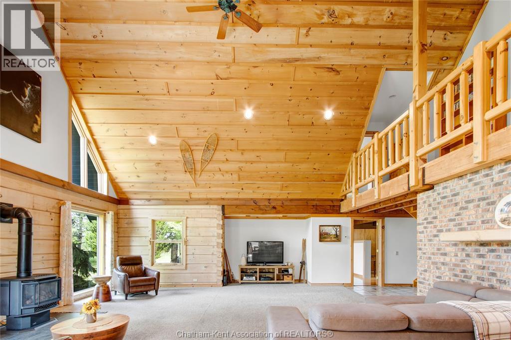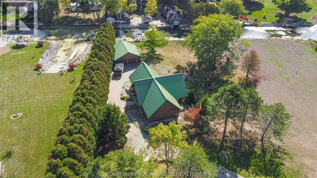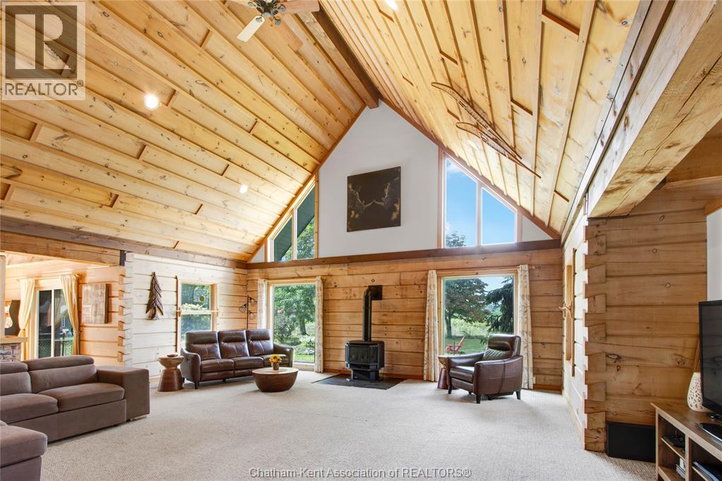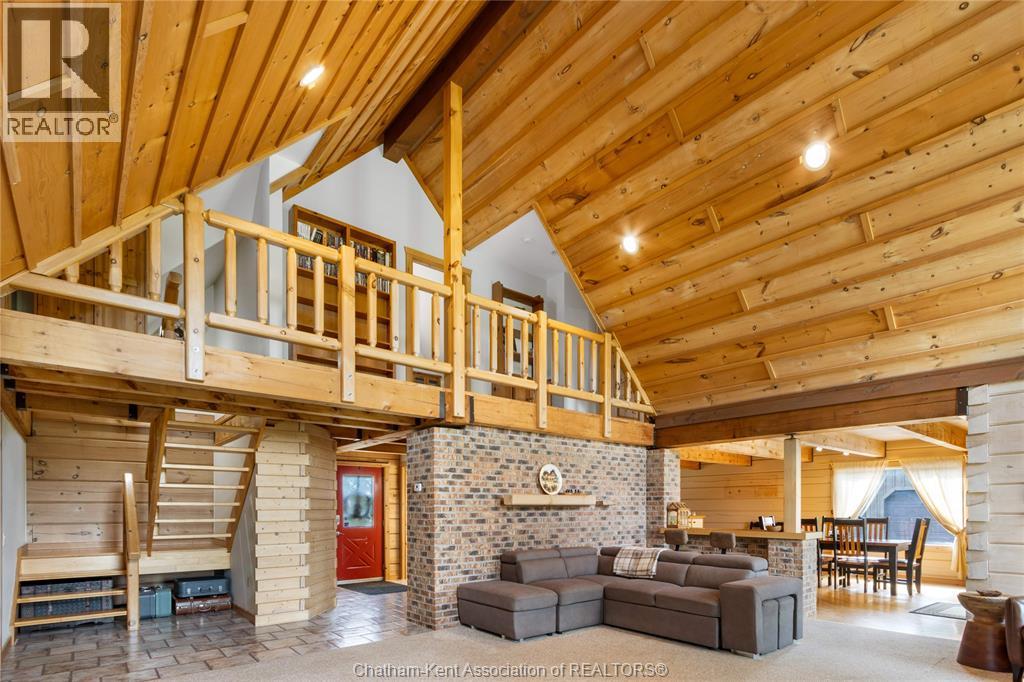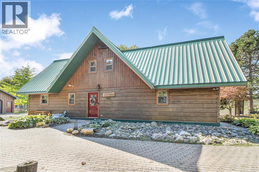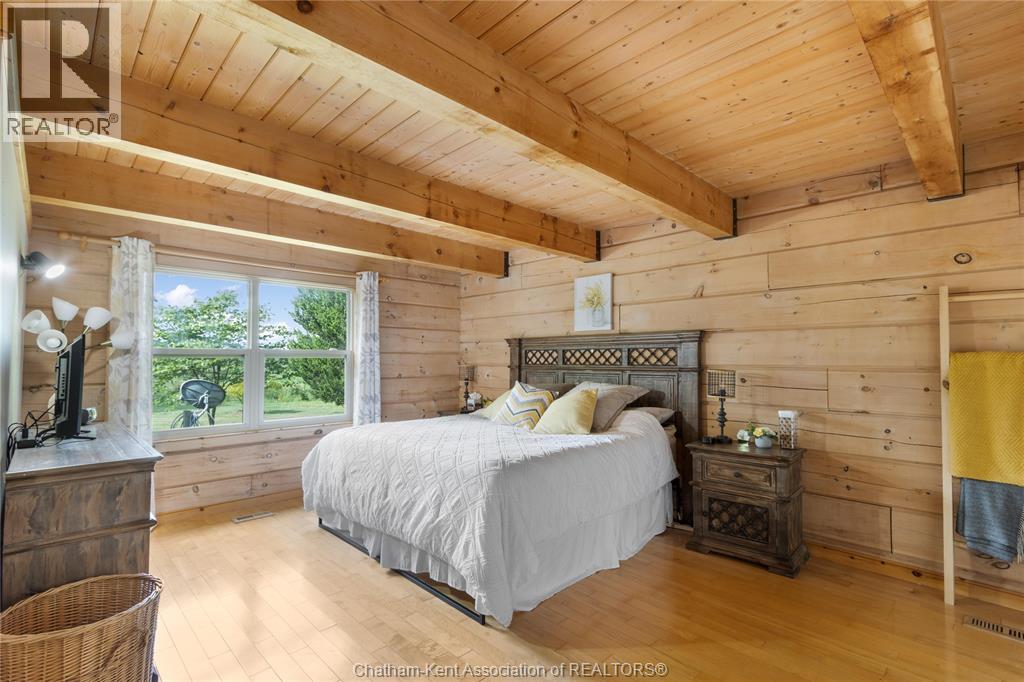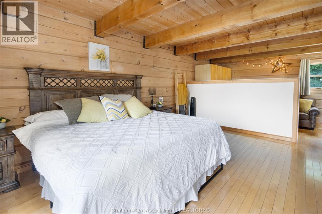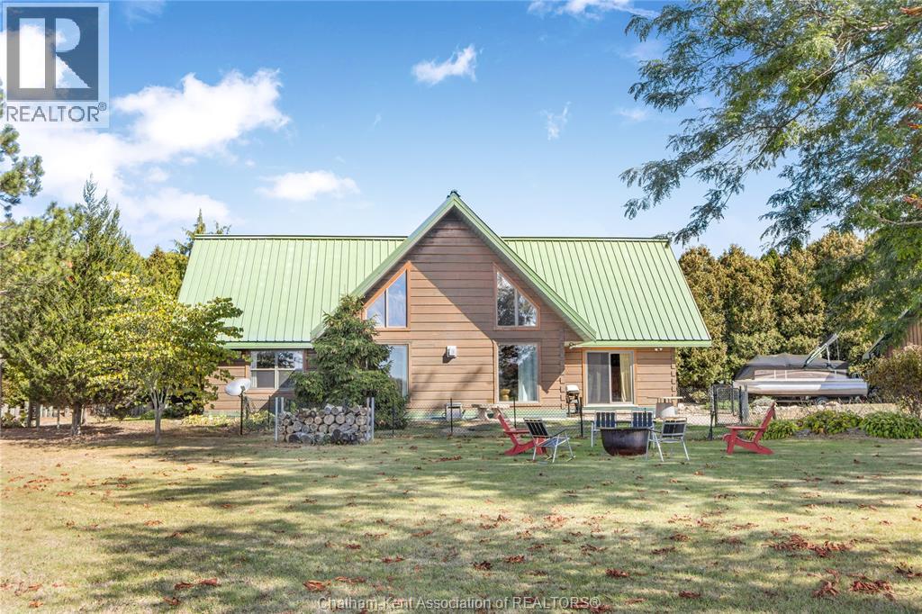 Embrace this impressive Confederation Log Home tucked away in a private retreat offering approximately 500 ft of canal waterfront and sitting on an impressive 2-acre lot. Inside this unique home, you’re met with an exceptional layout featuring a large great room with cathedral ceilings and an open balcony overlooking the space below. You’ll notice the rich wood tones, exposed beams, and detailed joinery showcasing the expert craftsmanship throughout. The massive eat-in kitchen provides plenty of room for large gatherings, dinners, and entertaining, with patio door access to the outdoor area where you can relax and take in beautiful canal views, wildlife and breathtaking sunsets! Enjoy the convenience of main floor living with a spacious primary bedroom offering a roughed-in ensuite with a walk-in closet area. A large foyer, a 2pc bath and laundry room complete the main floor. Upstairs, you’ll find two generous bedrooms and a 4pc bathroom. Outside, there’s room to roam across three parcels of land with a new wood and steel dock! This place really sets the tone for relaxation and enjoying life on the water. With access to Rondeau Bay, you can swim, boat, and fish in world-class waters right from your backyard. The heated oversized double detached garage/shop provides ample space for all your toys, a workshop, or future projects while you enjoy this peaceful and private setting. Services include municipal water, natural gas, septic and well water for your gardening or other uses! This property is truly one-of-a-kind!! Don’t miss your chance to make it yours. Call today for more information or to schedule your private viewing! (id:64974)