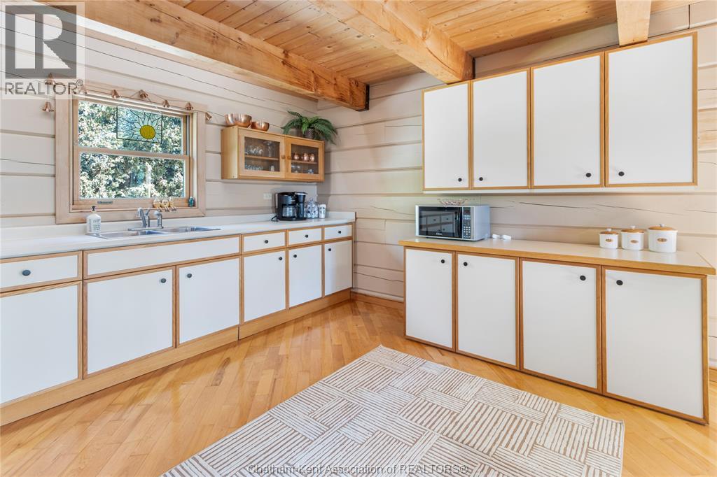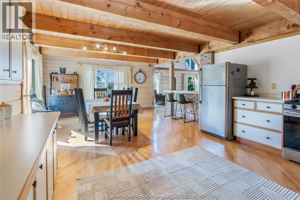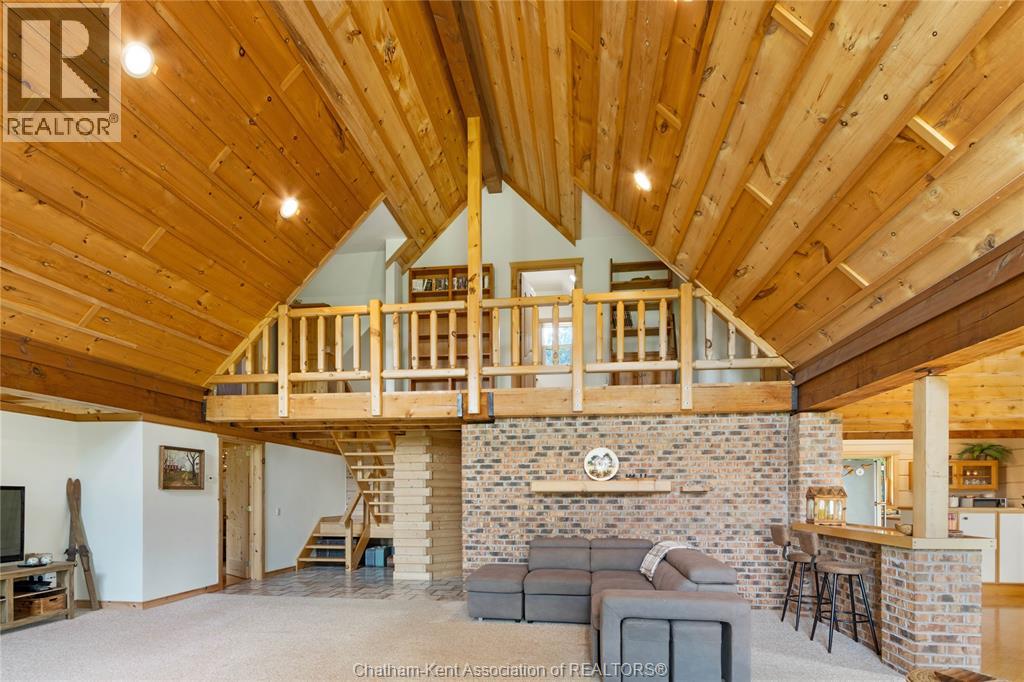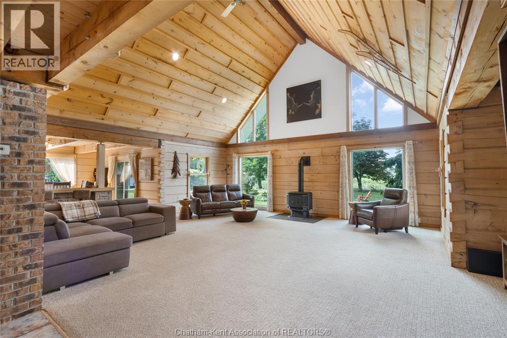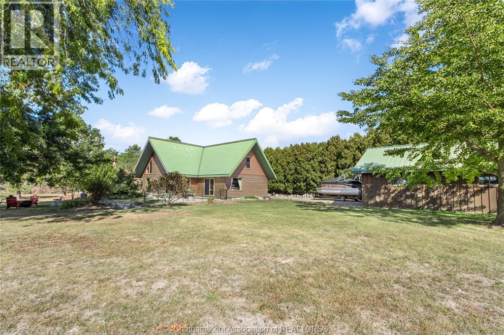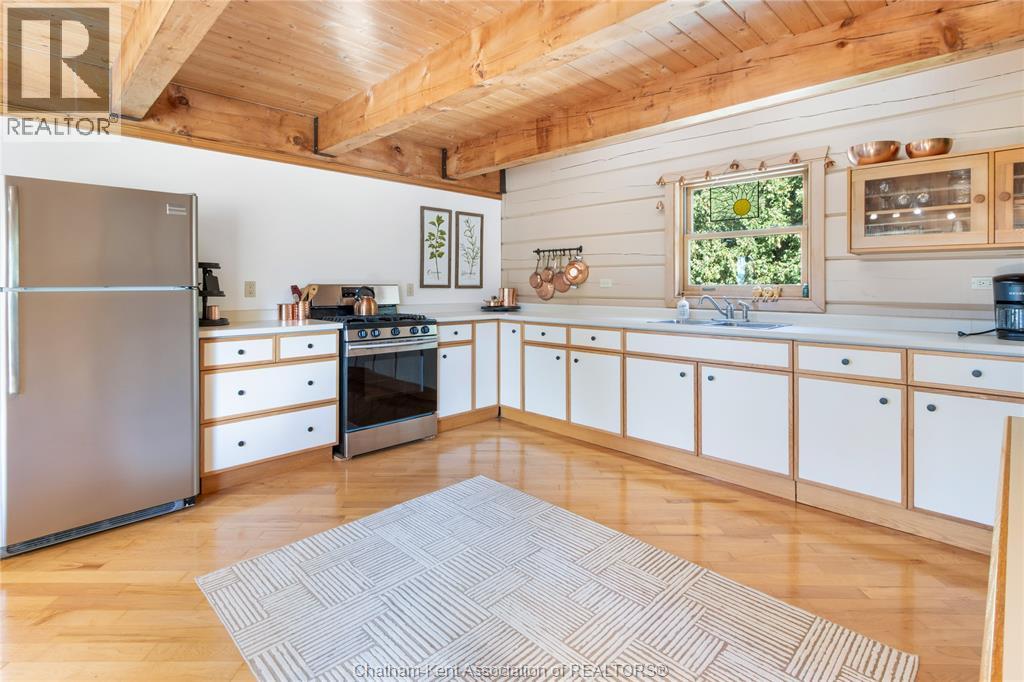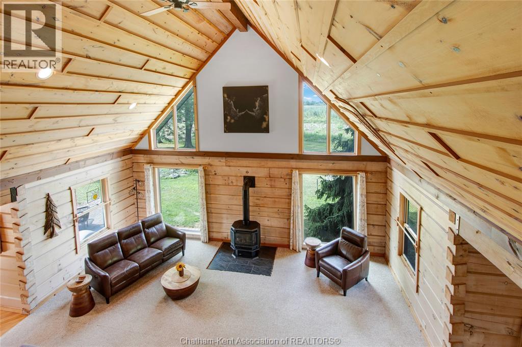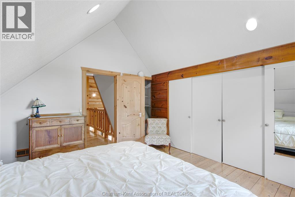 Embrace this impressive Confederation Log Home tucked away in a private retreat offering approximately 500 ft of canal waterfront and sitting on an impressive 2-acre lot. Inside this unique home, you’re met with an exceptional layout featuring a large great room with cathedral ceilings and an open balcony overlooking the space below. You’ll notice the rich wood tones, exposed beams, and detailed joinery showcasing the expert craftsmanship throughout. The massive eat-in kitchen provides plenty of room for large gatherings, dinners, and entertaining, with patio door access to the outdoor area where you can relax and take in beautiful canal views, wildlife and breathtaking sunsets! Enjoy the convenience of main floor living with a spacious primary bedroom offering a roughed-in ensuite with a walk-in closet area. A large foyer, a 2pc bath and laundry room complete the main floor. Upstairs, you’ll find two generous bedrooms and a 4pc bathroom. Outside, there’s room to roam across three parcels of land with a new wood and steel dock! This place really sets the tone for relaxation and enjoying life on the water. With access to Rondeau Bay, you can swim, boat, and fish in world-class waters right from your backyard. The heated oversized double detached garage/shop provides ample space for all your toys, a workshop, or future projects while you enjoy this peaceful and private setting. Services include municipal water, natural gas, septic and well water for your gardening or other uses! This property is truly one-of-a-kind!! Don’t miss your chance to make it yours. Call today for more information or to schedule your private viewing! (id:64974)