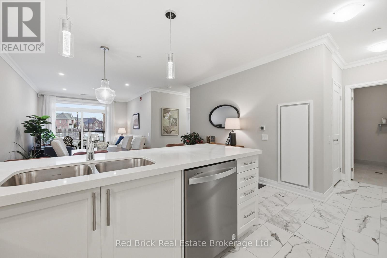 Rarely offered, this spectacular main-floor 2-bedroom, 2-bathroom suite with 2 owned, underground parking spaces is now available in the beautiful Bronte West Condominium complex. Located in a young Net Zero, energy-efficient building, owners enjoy exceptional sustainability, very low utility costs and a lifestyle of convenience. This sought-after Birch model showcases a thoughtful layout featuring some modifications for wheel chair accessibility, a well-appointed kitchen with breakfast bar, pantry, dining space, living room, a full-size laundry room, high ceilings and oversized windows. The primary suite intentionally offers wheel-chair accessible space with wider doors, a walk-in closet and enlarged 3-piece ensuite with walk-in shower. Additional high-end upgrades include rich hardwood flooring, quartz countertops, lighting, ceiling-height cabinetry, closet organizers, and remotely operated window blinds. Enjoy peaceful summer days on the balcony, which offers added privacy from the visitor parking thanks to maturing shrubs and flowering bushes. This main floor condo allows convenient access to the main level games room, party room, exercise room, elevator to parking and locker, a fenced outdoor dog run. Impressive Net Zero/Green technologies include geothermal heating and cooling, solar panels, rainwater collection for toilets and landscaping, EV charging stations (available at owner's cost), waste recycling, triple-glazed fiberglass windows with photo-sensitive reflective technology, LED motion-activated lighting, and high-efficiency appliances. Residents benefit from low utility costs and low condo fees while enjoying a property managed with exceptional care and pride. Ideally located within walking distance to shopping, restaurants, the Milton District Hospital, neighbourhood parks and quiet residential streets, while still offering convenient access to major highways. Come see it. Love it. Buy it! (id:64974)
