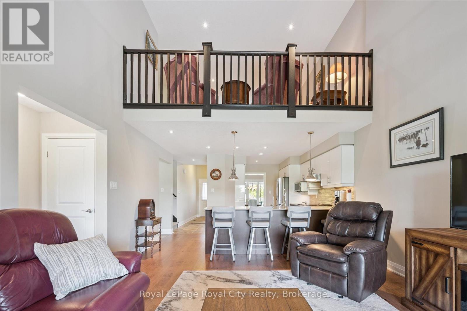 This gorgeous and spacious executive bungaloft townhome in Centre Wellington is truly one of a kind. Built in 2017, this home provides an exceptional blend of luxury and functionality with over 2300 sq ft of living space. The main floor boasts an open-concept layout with a soaring vaulted ceiling in the living area. The large primary bedroom is a serene retreat, complete with an ensuite and a walk-in closet. A convenient main-floor laundry room adds to the ease of single-level living. Step outside from the living room onto the covered and upgraded composite deck, where you can enjoy the peaceful backdrop. The amazing loft level features a large family room, another spacious bedroom, and a full bathroom. The finished walkout lower level is an incredible bonus, offering a huge recreation room, another full bathroom, and workshop/ storage space. The lower level walkout opens onto a private patio with a view of the serene greenspace and pond. This property stands out with its unique two-car garage, which includes a hobby mezzanine level AND a separate lower storage level which opens to the backyard as well. Located in a desirable south-end location, you are just minutes away from all the amenities you need and have the perfect commuting location. This is a truly special home that must be seen to be appreciated. Explore the online floorplans and virtual tour, and then book your private viewing today. (id:64974)