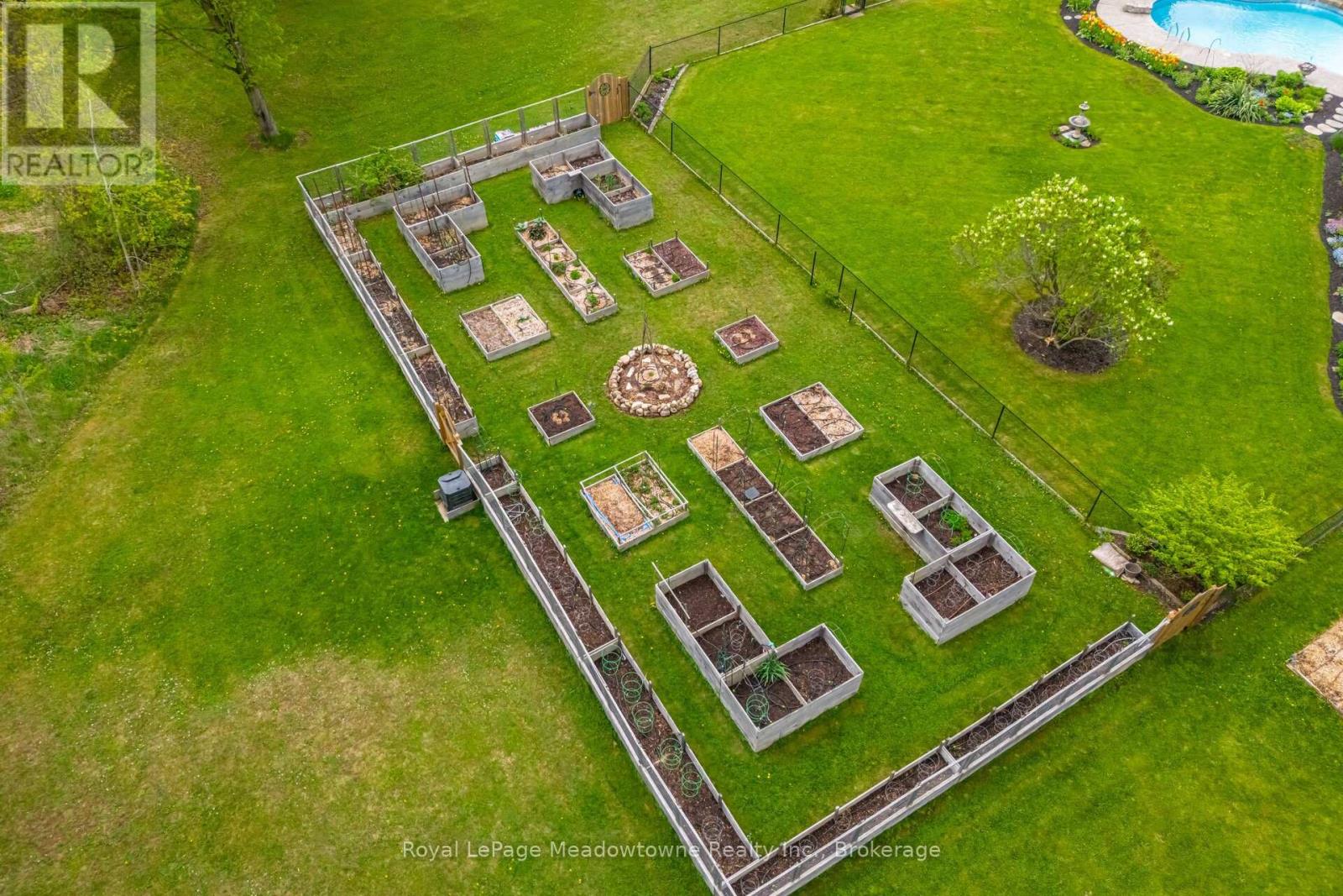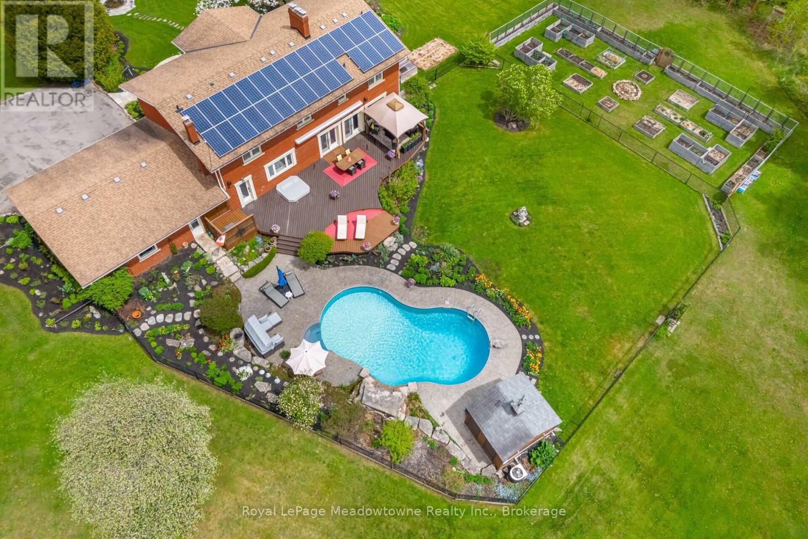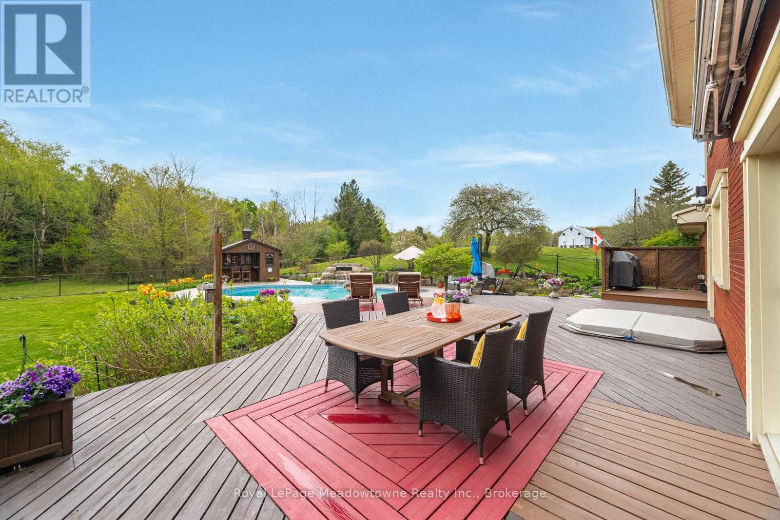 19.3 ACRES!! Elegant 3+1 Bedroom, 4 Bathroom Georgian-Style Home situated on a unique, one of a kind property that is very private and well set back from the road on 19.3 Acres. This beautifully updated and impeccably maintained home blends timeless style with modern luxury. A grand foyer welcomes you into spacious, light-filled rooms featuring hardwood floors, crown moulding, and panoramic views. The great room boasts a wood-burning fireplace and bay window, while the chefs kitchen offers custom cherry wood cabinetry, granite island, built-in appliances, a large window that overlooks the pool and garden, and a walk-out to the entertainers deck overlooking a previous gold award winning saltwater pool with Halton Pools, hot tub perennial gardens and an enclosed garden 30x80 feet area with raised garden boxes with cold frames. Upstairs, the luxurious primary suite includes motorized blinds, double closets with organizers, and a stunning ensuite with standalone tub, rain shower, and custom walk-in closet. Two additional bedrooms share a Jack-and-Jill bathroom with separate wet room. The finished basement offers a rec room with fireplace, games room, bedroom, sauna, 3-pc bath, cold room, mechanical room and ample storage. Extras include a pool house with bar/change room, den with custom built-ins, second kitchen, tool room, potting room, 220amps electrical, and access to wooded trails, gardens, and Speyside Creek. Peaceful country living just minutes to city amenities! (id:64974)