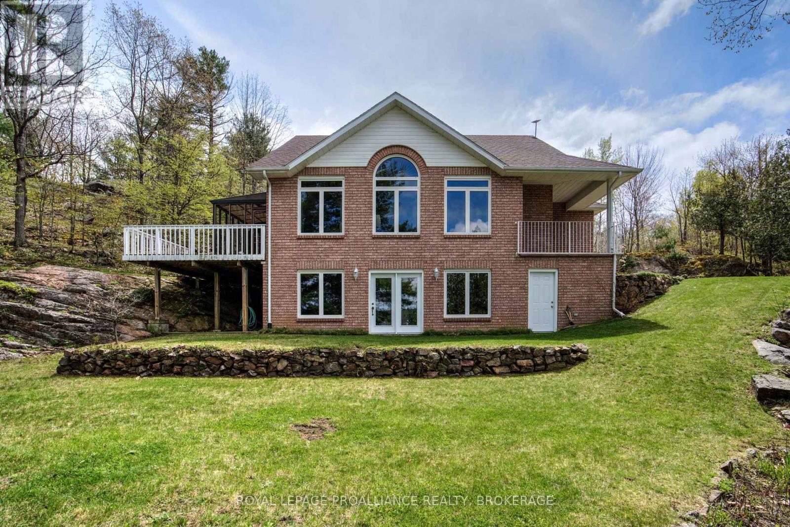 Spectacular Desert Lake waterfront home! If deep, clean, west facing waterfront is what you are looking for and a custom-built beautiful home, then look no further! Welcome to 1133 Sassy Tree on beautiful Desert Lake. This home sits perched on the hill and overlooks the lake and has gentle steps down to the waterfront. As you enter the home, you will immediately notice quality and craftsmanship throughout. The welcoming foyer opens up into a large living area with a fireplace and an open concept dining room and custom kitchen with stone counter tops an abundance of cabinets. There is a laundry room located behind the kitchen and a primary bedroom with an attached 4-pc en-suite bathroom. At the other end of the home is a second bedroom and a main 4-pc bathroom. From the dining room area, you can access a large screened in porch and open deck area that looks down towards the dock and lake. Heading downstairs you will find a massive recreation room with a walkout door through the ICF foundation into the front yard. Also located on this level is a third bedroom, a 3-pc bathroom and a large utility room. This home is serviced by a septic system and a newly drilled well. There is a storage area with exterior access to a storage room that once housed the oil tank, however, the home is now heated by a forced-air, propane furnace. Down the pathway and steps, past the trickling stream you will find a large dock, deep clean waterfront and access to all your waterfront dreams. The landscape and gardens will surely impress you and the massive rock face behind the house creates an amazing Canadian Shield backdrop. Desert Lake is located on the Canadian Shield and is one of the deepest lakes in our area, offering great swimming, boating and fishing opportunities. (id:64974)