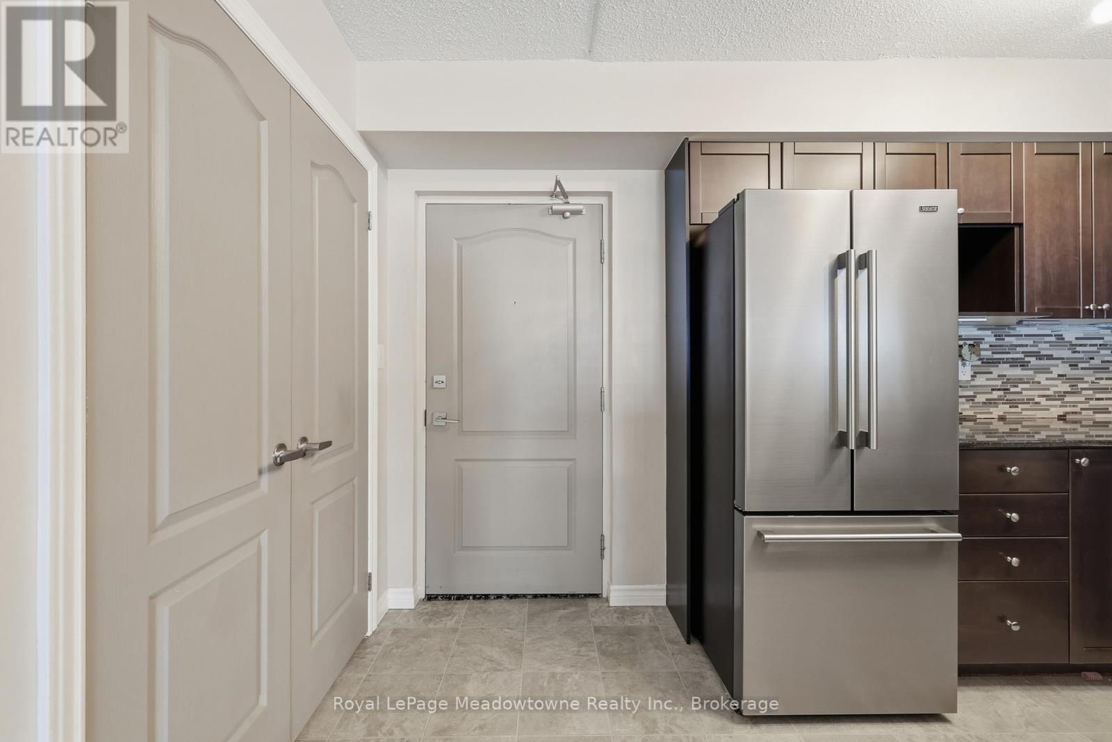 Welcome home to this bright, freshly painted 1-bedroom condo that defines move-in ready! Perfectly suited for first-time buyers or downsizers, this unit features a spacious layout rarely found in 1-bedroom suites. The open-concept floor plan includes a dedicated large dining area, perfect for hosting dinner parties, which flows into a living space anchored by a cozy fireplace. The kitchen has been updated with brand new appliances, ensuring a modern cooking experience. Step through the French door to your private terrace; an extension of your living space. Practicality meets comfort with ensuite laundry, abundant storage, and an underground parking spot. Beyond the suite, the building offers a gym and party room. Location is excellent for commuters: you are steps from the bus stop and have quick access to the highway. (id:64974)