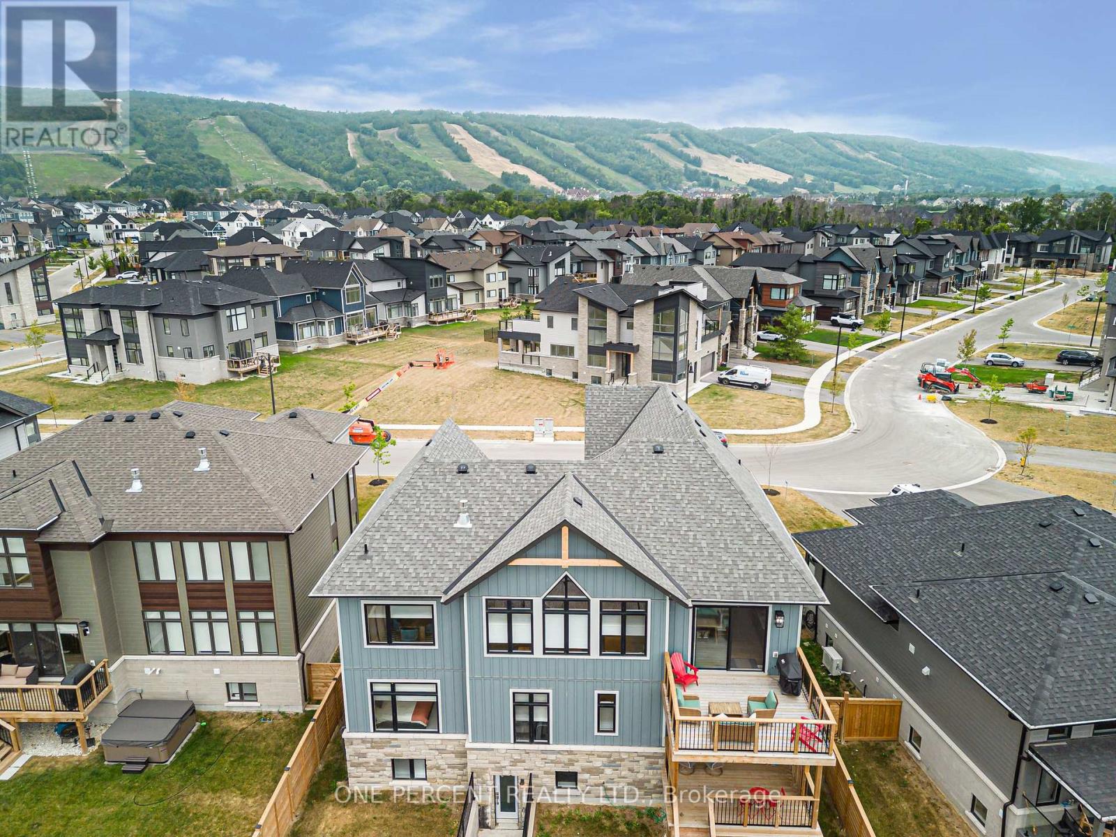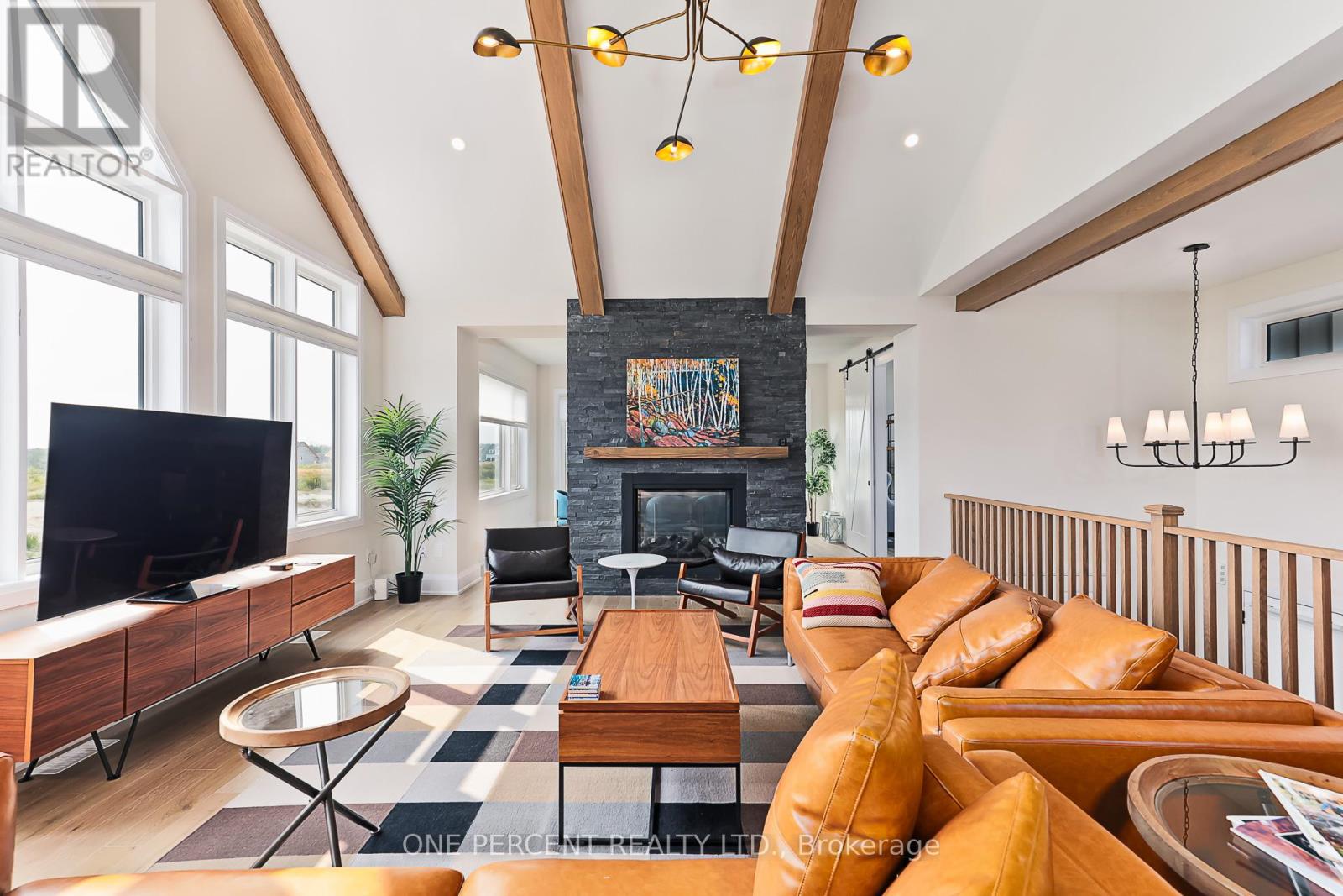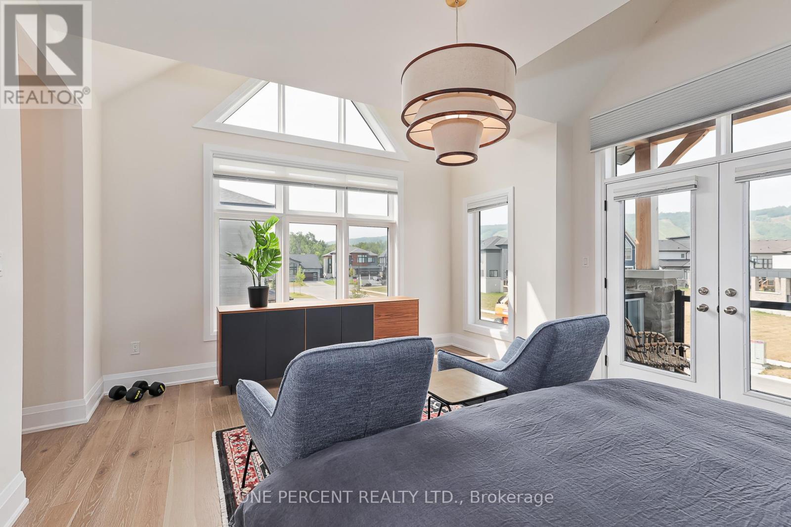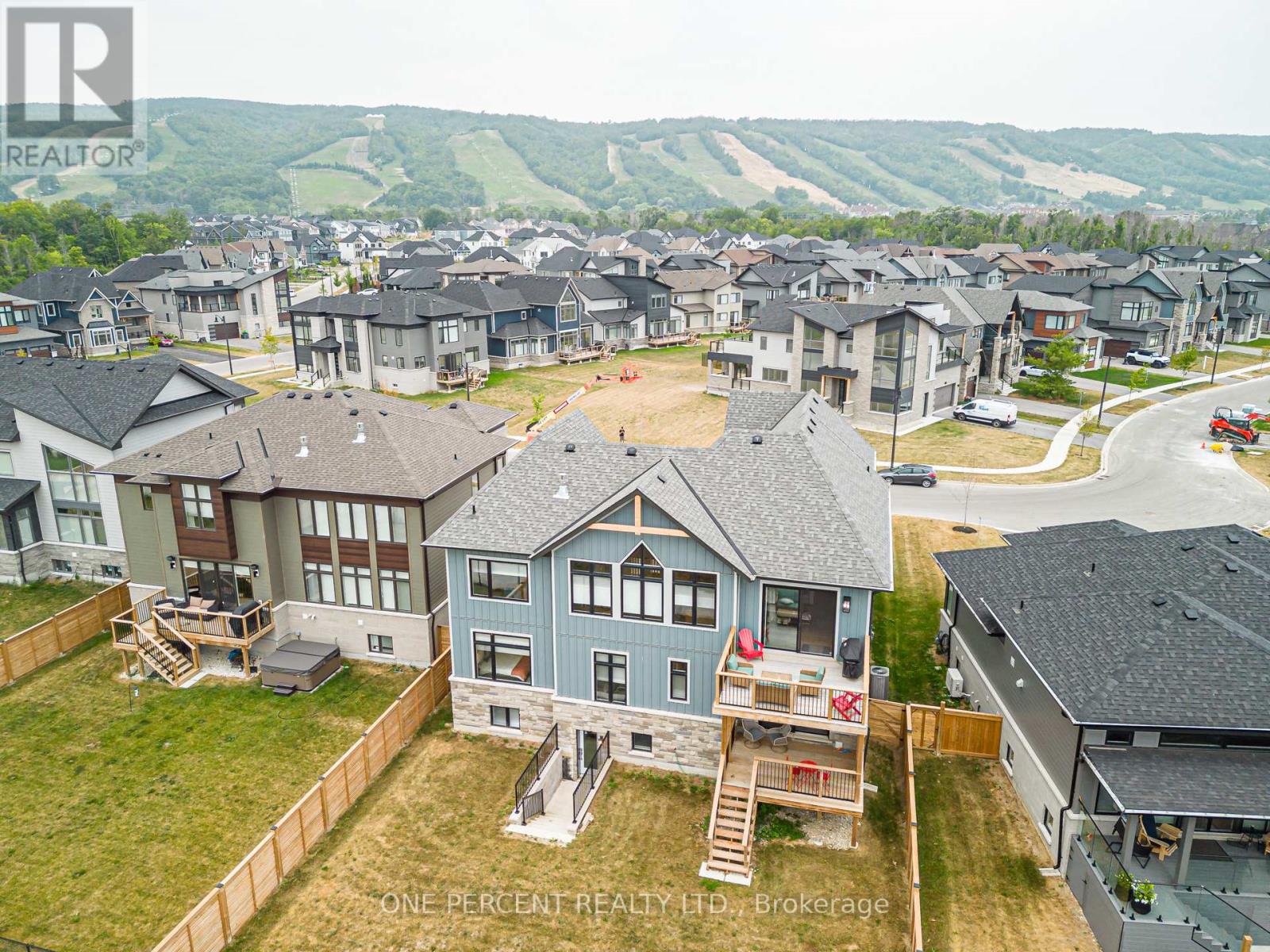 Welcome to 114 Cattail Crescent, a 4,558 sqft mountain house, boasting elegant architectural upgrades, unique stone, fibre cement, and wood grain siding, along with ornamental wood details. A 50-foot wide, side-facing garage creates an impressive street presence, with plenty of parking.This layout features a primary living space (1,883 sqft) on the second floor, additional primary living space on the first floor (1,548 sqft), plus a fully finished walkout basement (1,127sqft). The open second floor, with high ceilings and windows, offers impressive views and features a large deck, custom kitchen, servery, eating area, faux beam covered lodge room, formal dining room, and den, divided by a slate-clad floor-to-ceiling gas fireplace. The expansive owners suite includes cathedral ceilings, a private loggia, spacious walk-in closet, and a beautifully decorated ensuite with standalone tub and a large glass shower enclosure. The main level entrance leads to the main floor with a large bar/kitchen, a family room with a deck, backyard access and beautifully decorated rooms with custom light fixtures. There are also three good-sized bedrooms and two full bathrooms on this level. A separate side door and a garage entrance, leads to a spacious storage room and laundry room. The self-contained basement with glass door walkout, offers a large open space, wet bar, two bedrooms with egress windows, and a full bathroom.The house is beautifully located within a short walking distance to Blue Mountain Village and a complimentary shuttle to many amenities, including the private Blue Mountain Beach. This professionally decorated house with great street presence and exceptional floor plan includes all light fixtures and furniture. (id:64974)