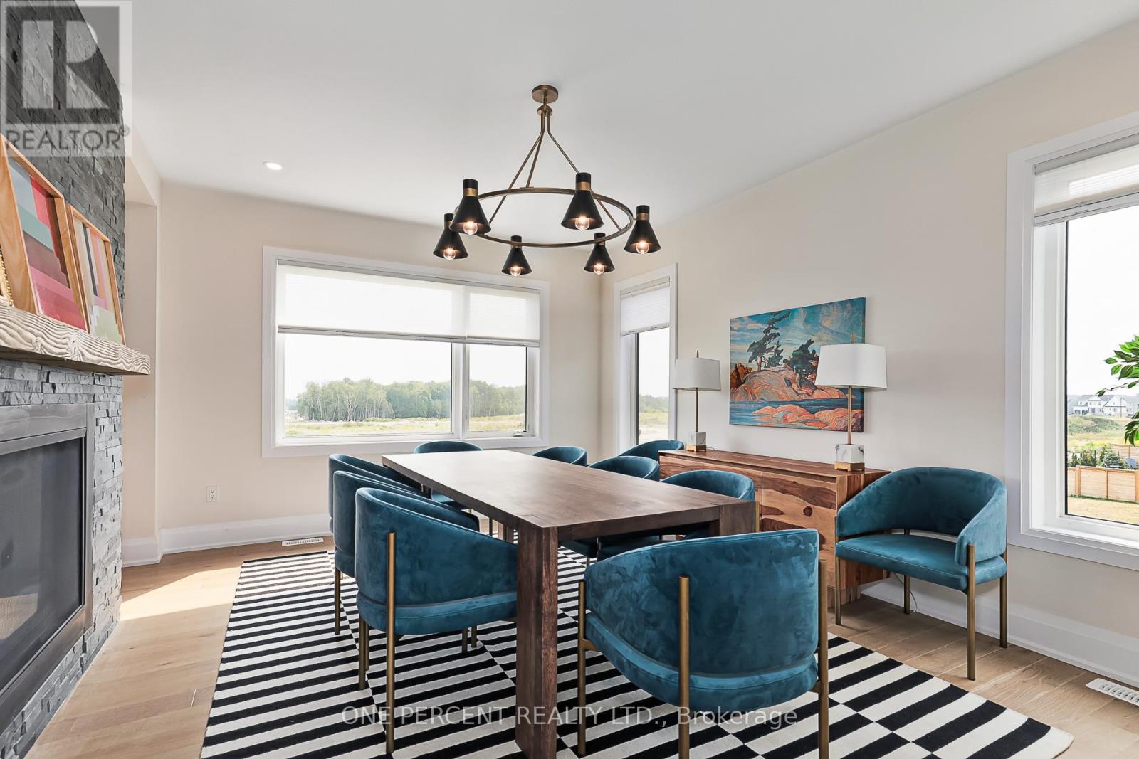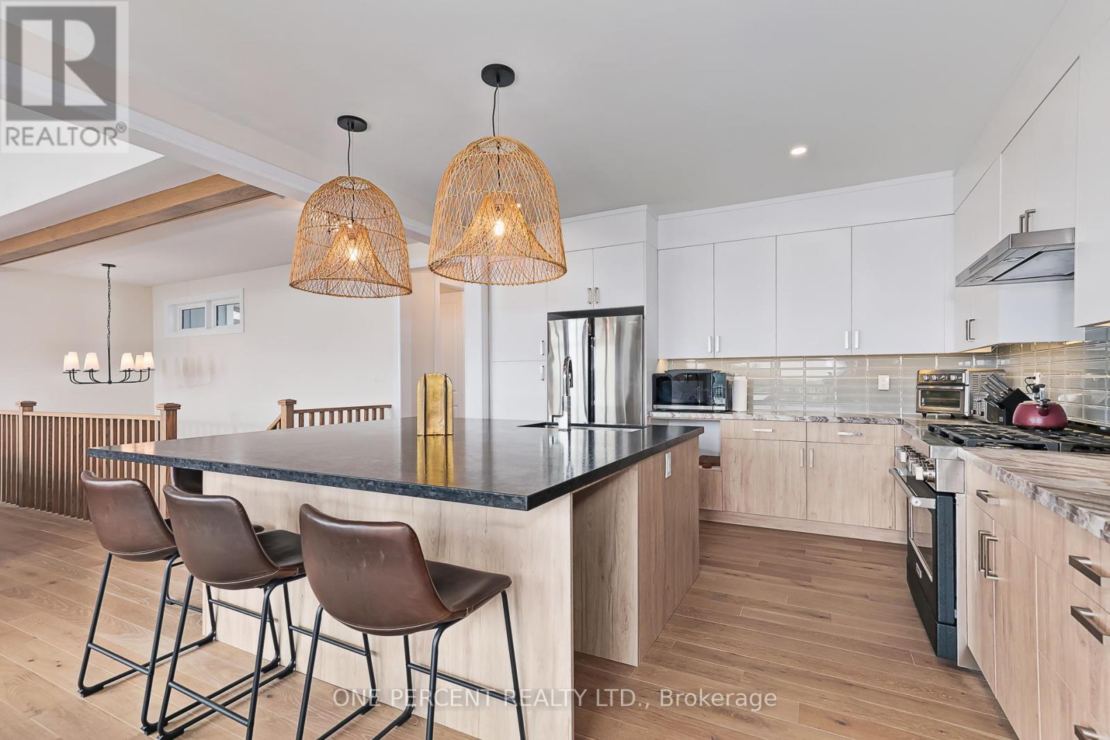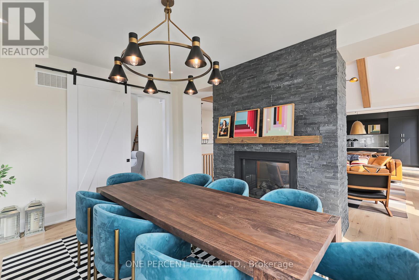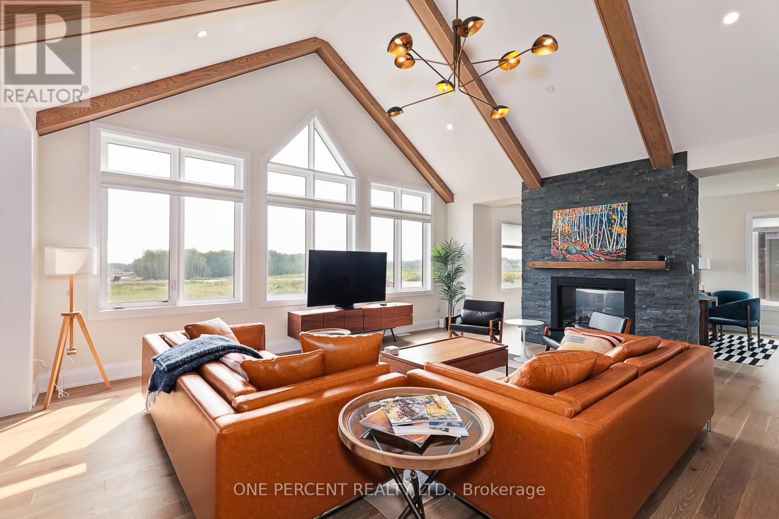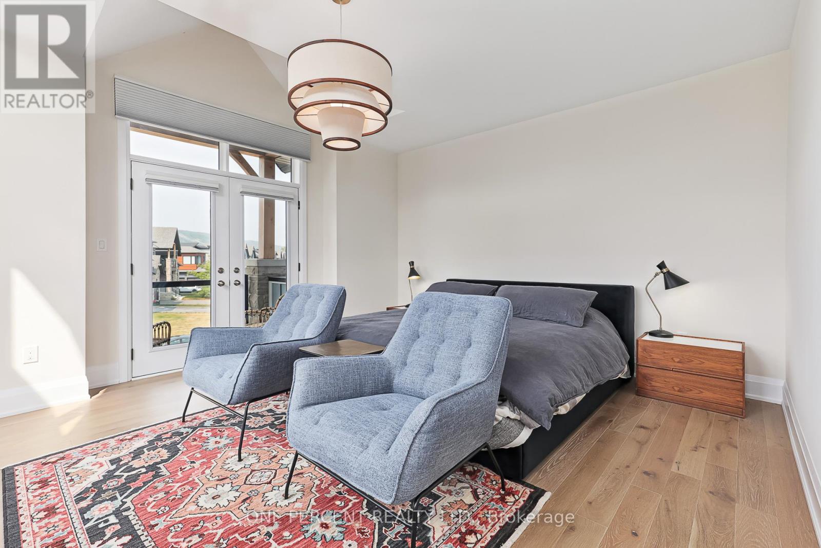 Welcome to 114 Cattail Crescent, a 4,558 sqft mountain house, boasting elegant architectural upgrades, unique stone, fibre cement, and wood grain siding, along with ornamental wood details. A 50-foot wide, side-facing garage creates an impressive street presence, with plenty of parking.This layout features a primary living space (1,883 sqft) on the second floor, additional primary living space on the first floor (1,548 sqft), plus a fully finished walkout basement (1,127sqft). The open second floor, with high ceilings and windows, offers impressive views and features a large deck, custom kitchen, servery, eating area, faux beam covered lodge room, formal dining room, and den, divided by a slate-clad floor-to-ceiling gas fireplace. The expansive owners suite includes cathedral ceilings, a private loggia, spacious walk-in closet, and a beautifully decorated ensuite with standalone tub and a large glass shower enclosure. The main level entrance leads to the main floor with a large bar/kitchen, a family room with a deck, backyard access and beautifully decorated rooms with custom light fixtures. There are also three good-sized bedrooms and two full bathrooms on this level. A separate side door and a garage entrance, leads to a spacious storage room and laundry room. The self-contained basement with glass door walkout, offers a large open space, wet bar, two bedrooms with egress windows, and a full bathroom.The house is beautifully located within a short walking distance to Blue Mountain Village and a complimentary shuttle to many amenities, including the private Blue Mountain Beach. This professionally decorated house with great street presence and exceptional floor plan includes all light fixtures and furniture. (id:64974)