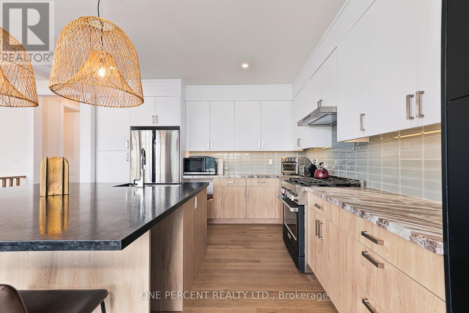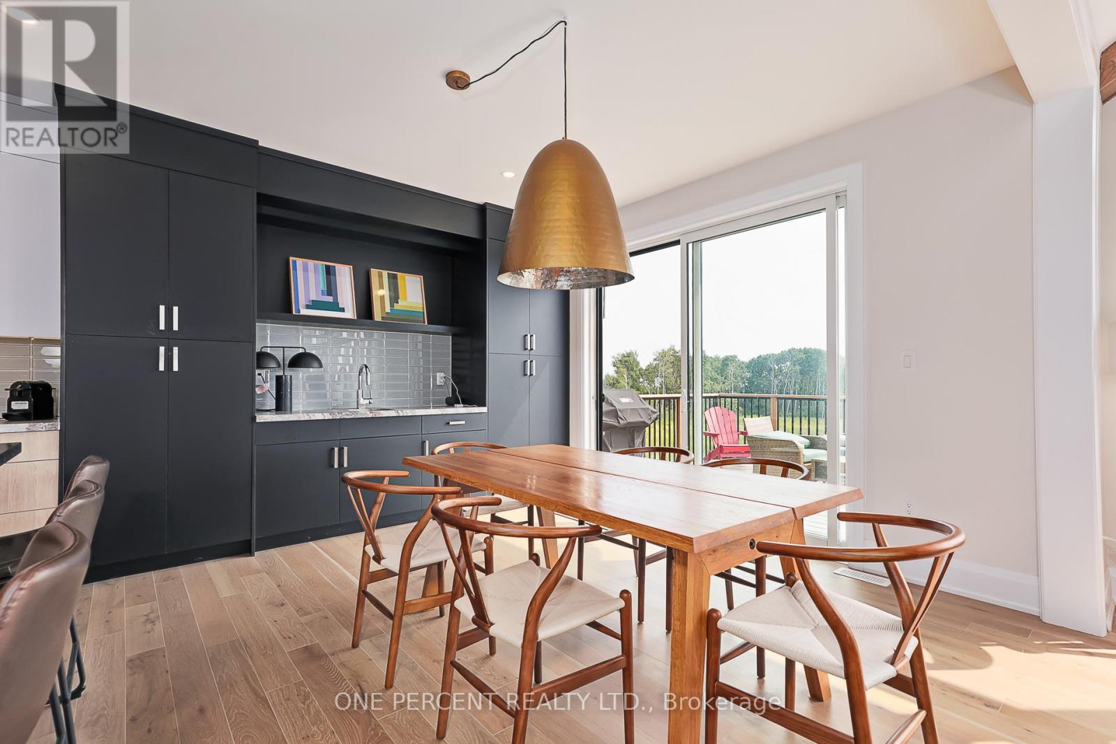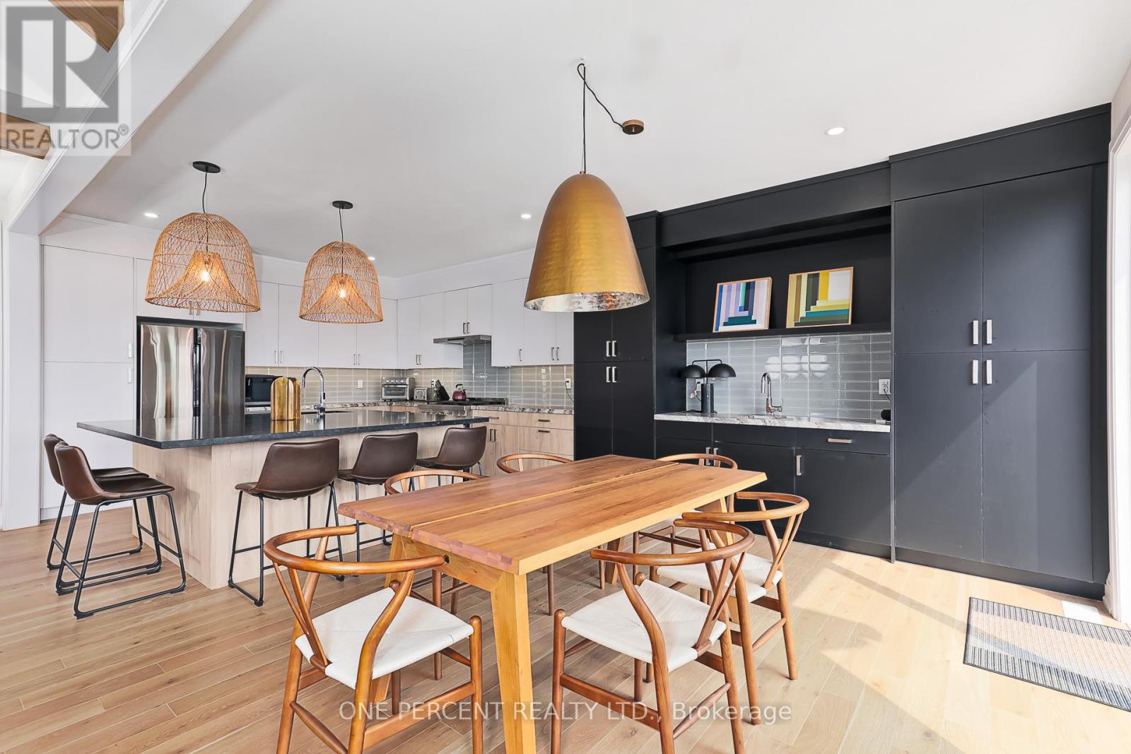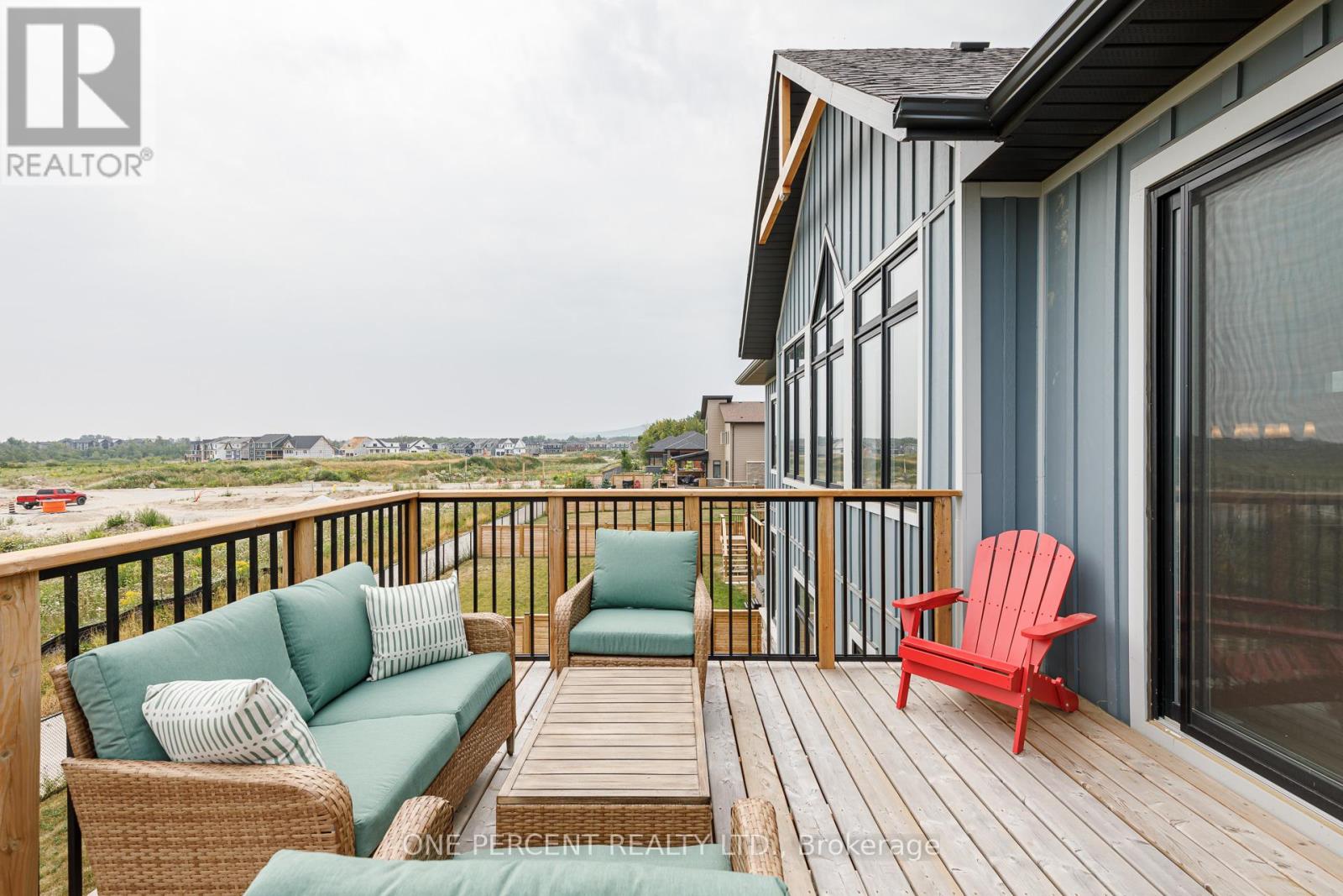 Welcome to 114 Cattail Crescent, a 4,558 sqft mountain house, boasting elegant architectural upgrades, unique stone, fibre cement, and wood grain siding, along with ornamental wood details. A 50-foot wide, side-facing garage creates an impressive street presence, with plenty of parking.This layout features a primary living space (1,883 sqft) on the second floor, additional primary living space on the first floor (1,548 sqft), plus a fully finished walkout basement (1,127sqft). The open second floor, with high ceilings and windows, offers impressive views and features a large deck, custom kitchen, servery, eating area, faux beam covered lodge room, formal dining room, and den, divided by a slate-clad floor-to-ceiling gas fireplace. The expansive owners suite includes cathedral ceilings, a private loggia, spacious walk-in closet, and a beautifully decorated ensuite with standalone tub and a large glass shower enclosure. The main level entrance leads to the main floor with a large bar/kitchen, a family room with a deck, backyard access and beautifully decorated rooms with custom light fixtures. There are also three good-sized bedrooms and two full bathrooms on this level. A separate side door and a garage entrance, leads to a spacious storage room and laundry room. The self-contained basement with glass door walkout, offers a large open space, wet bar, two bedrooms with egress windows, and a full bathroom.The house is beautifully located within a short walking distance to Blue Mountain Village and a complimentary shuttle to many amenities, including the private Blue Mountain Beach. This professionally decorated house with great street presence and exceptional floor plan includes all light fixtures and furniture. (id:64974)