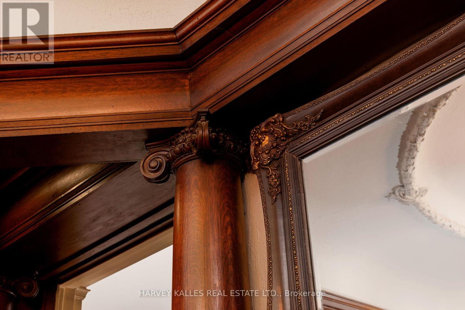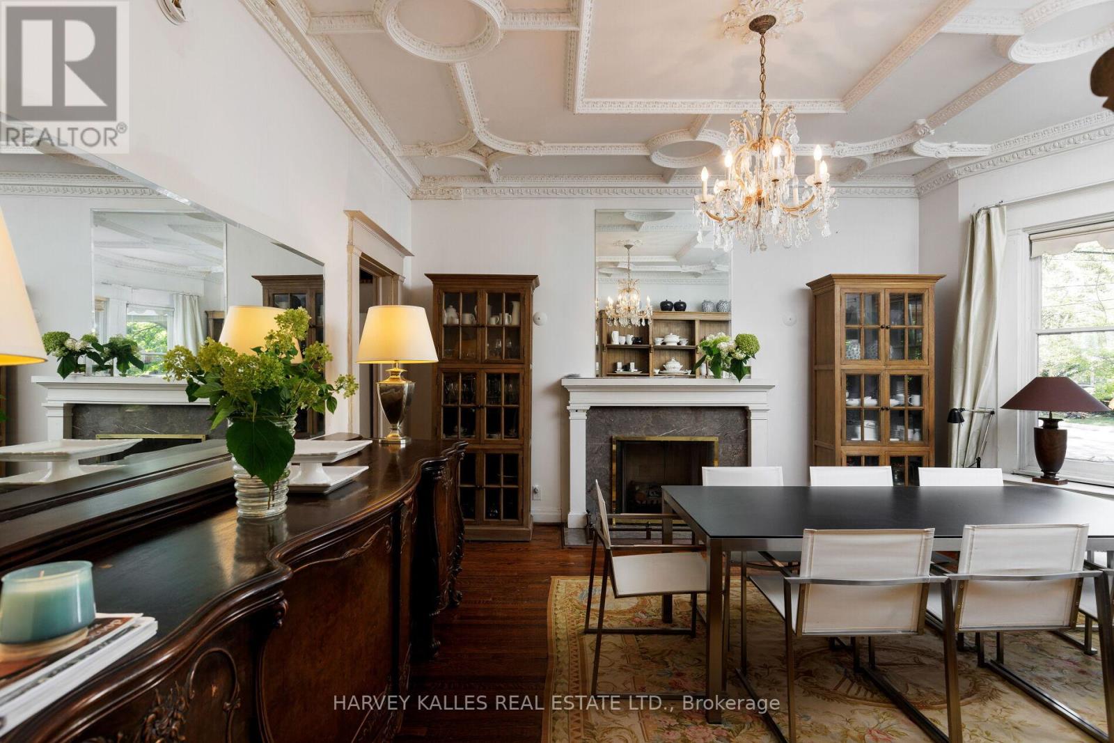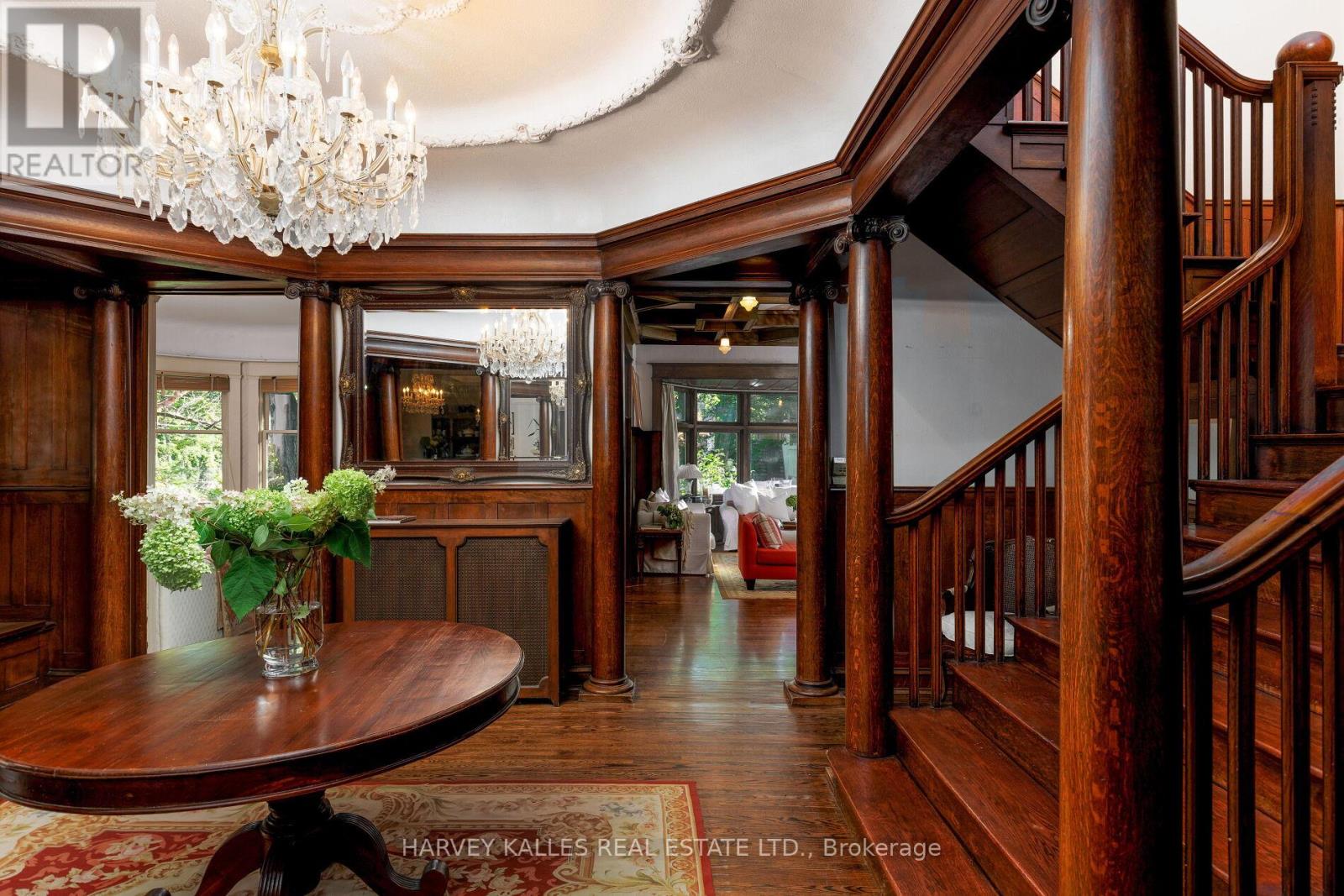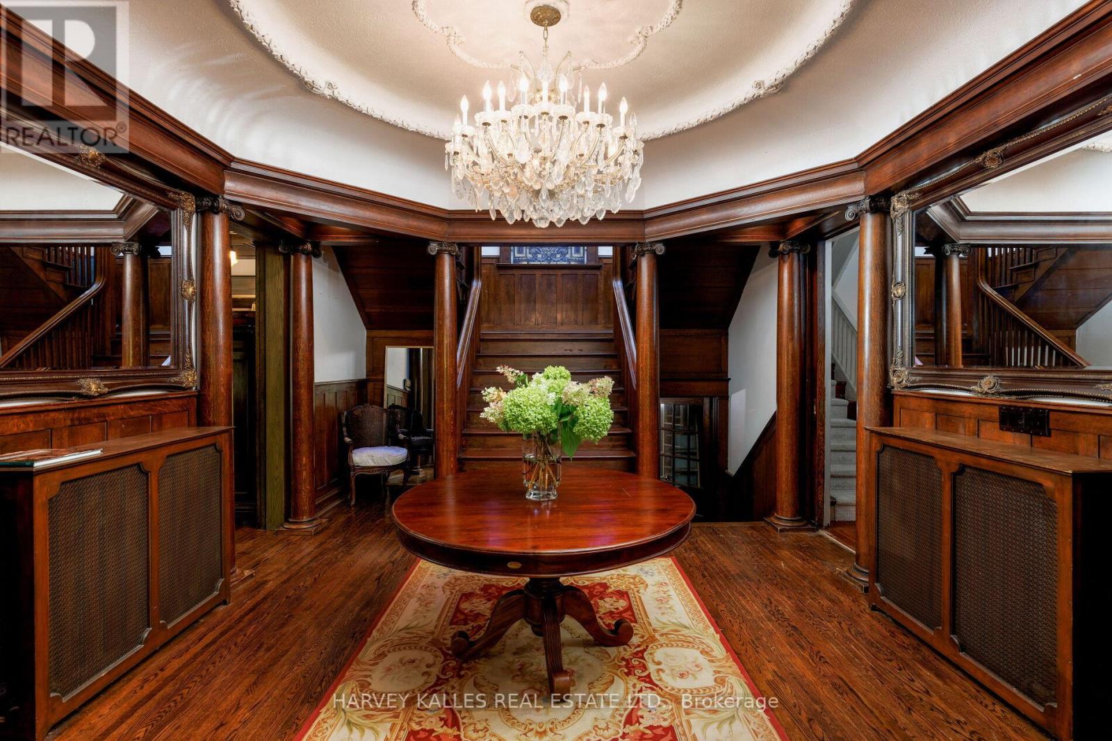 Nestled in Toronto's prestigious Rosedale neighbourhood, this landmark mansion occupies an expansive 100' x 122' estate-sized lot and offers over 7,500 square feet of impeccably designed living spaces. With 7 + 1 generously proportioned bedrooms, 8 bathrooms, and an exceptional third-floor loft, this grand residence seamlessly blends historic architecture with the scale, elegance, and functionality. Originally built circa 1900 for the distinguished Applegate family, the home has been meticulously restored and thoughtfully maintained to preserve it's architectural heritage including a self portrait stain glass window of Mrs. Applegate herself. Drawing inspiration from the classical traditions of Italian Renaissance architect Andrea Palladiio - most notably his iconic Villa Rotunda in Vicenza, Italy - the home reflects timeless design and exceptional craftmanship. A majestic octagonal central hall, framed by twelve lonic columns, creates an unforgettable first impression and sets the tone for the rest of the residence. Throughout the home, rich period details abound: original oak hardwood floors, finely hand-craved oak mouldings and wainscoting, intricate millwork, and 6 fireplaces with decorative tile and brick hearths. The soaring 10-foot ceilings are adorned with ornate plaster crown mouldings, ceiling medallions, and oak-beamed details that speak to the home's historical significance. Expansive bow windows and beautifully preserved stained glass flood the interior with natural light and highlight the warm, elegant atmosphere. Outside, the property is a private oasis, surrounded by mature trees, lush landscaping, and tranquil gardens that offer rare serenity in the heart of the city. A detached two-car garage and additional parking for three vehicles provide added convenience. This is a once-in-a-generation opportunity to own a truly iconic Rosedale residence - an architectural treasure steeped in history and timeless charm. (id:64974)