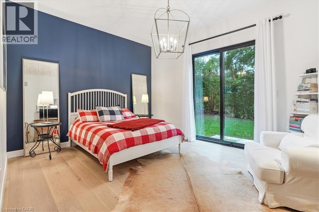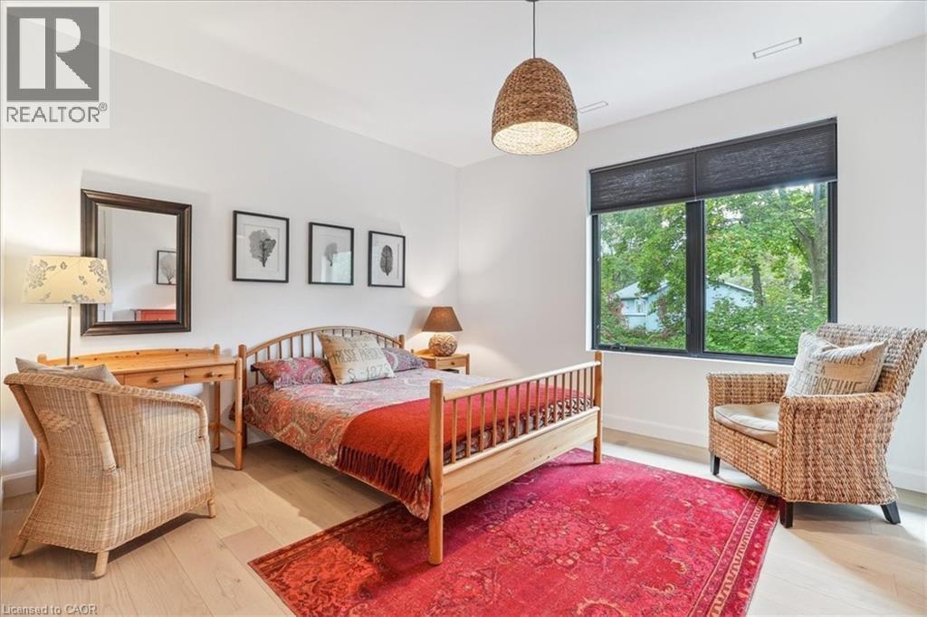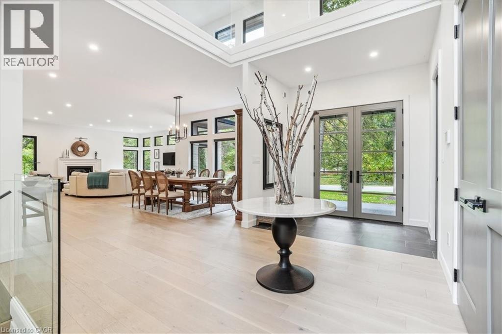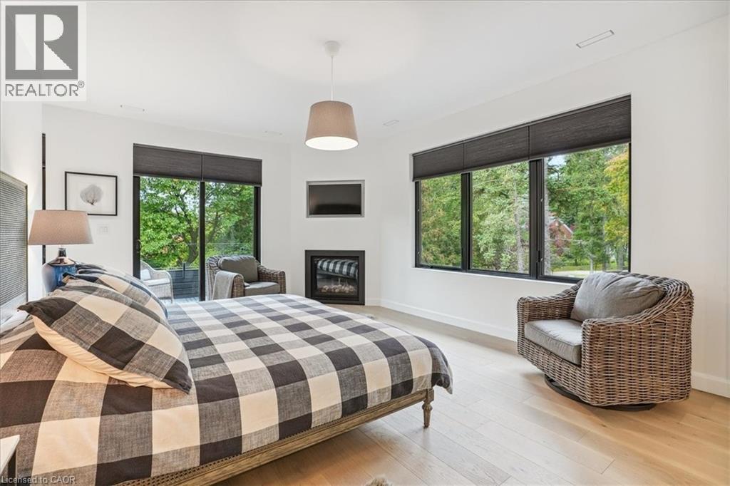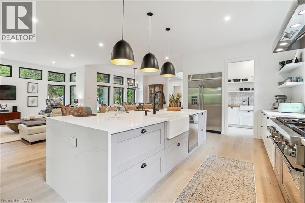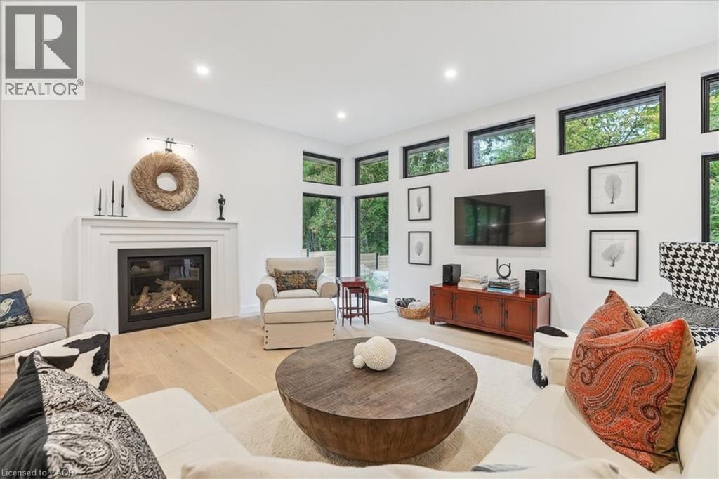 Modern prairie-style architecture in the heart of historic Ancaster. This recently completed two-storey custom house, features 5 bedrooms, 5+1 bathrooms with heated floors, a luxurious primary suite with a walk-through closet, and a main floor guest/in-law suite. Perfect for any culinary enthusiast, the gourmet kitchen includes a spacious waterfall quartz island, high-end appliances, two dishwashers, and a butler's pantry. This contemporary property offers two laundry rooms, three gas fireplaces, a cedar sauna, a heated salt water 32'x16' rectangular pool, and professionally designed gardens backing on Mansfield Park. There are integrated ceiling speakers, alarm system, security cameras, and whole house Cat6 wired network. Electrolux wine cooler in butler's pantry is a convenient luxury, as well as central vacuum, towel warmers and heated floors in all bathrooms. Large expanses of glass and an open floor plan allow for enjoyable circulation and a tranquil connection to nature throughout the house. Walking distance to restaurants, arts centre, scenic Ancaster Mill, Dundas Valley conservation area, and hiking trails, renowned Hamilton Golf and Country Club, all-season tennis courts, library, shopping, schools, and other amenities. Close proximity to McMaster University and major highways. (id:64974)