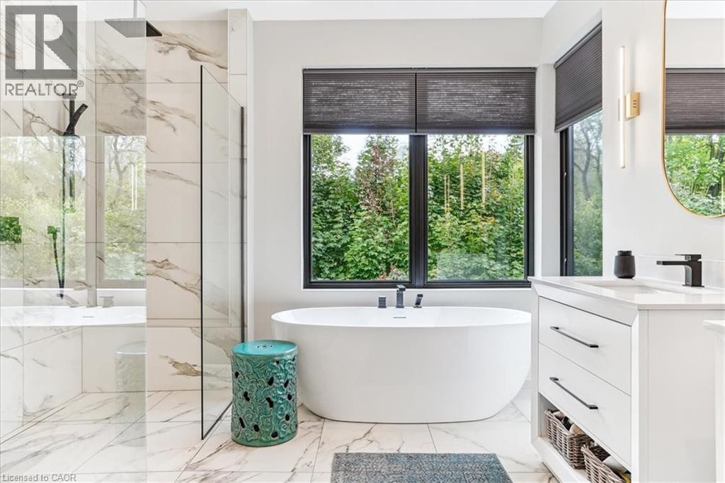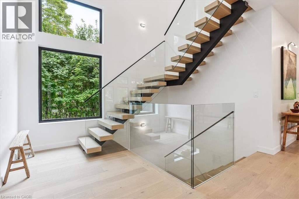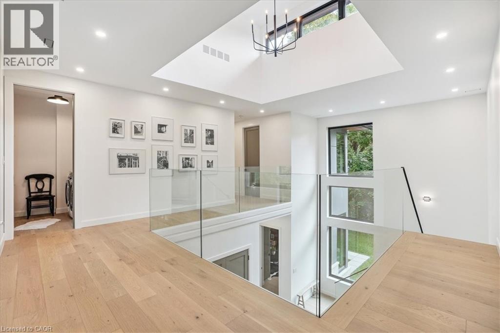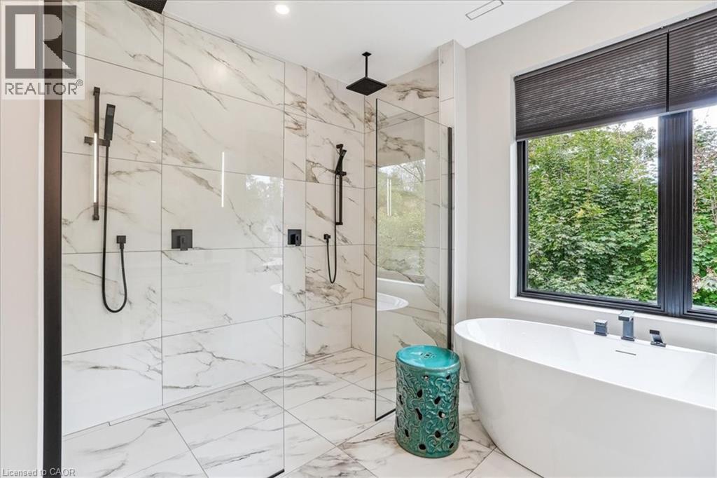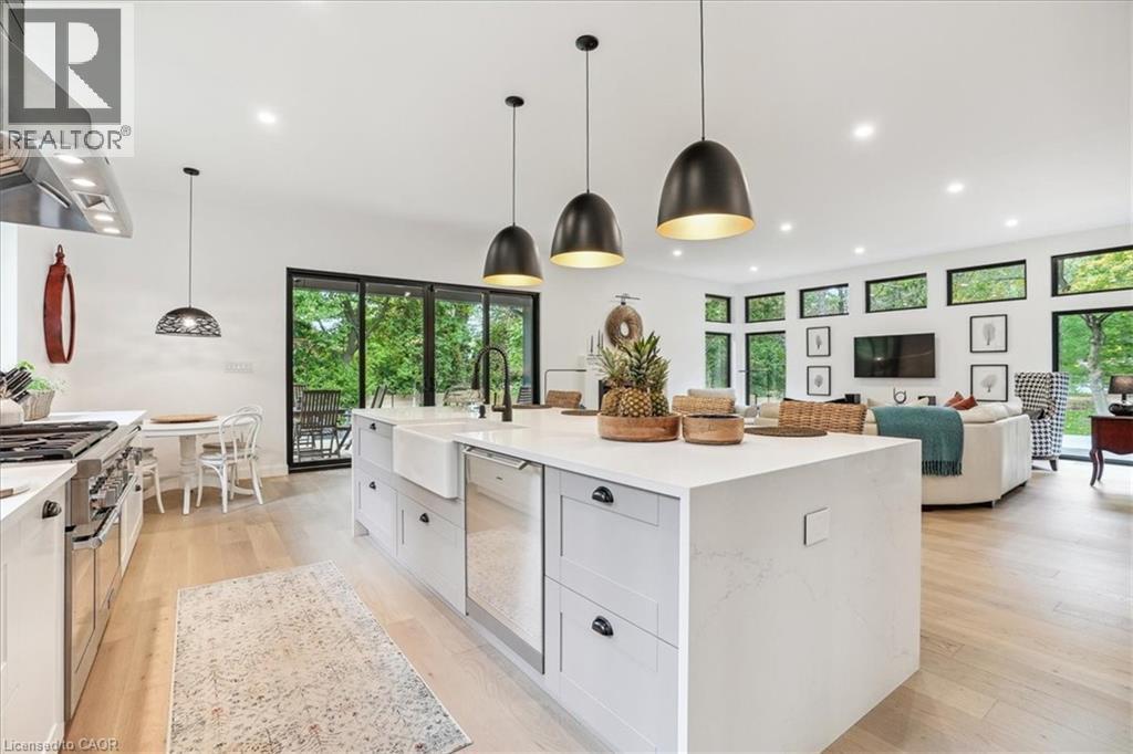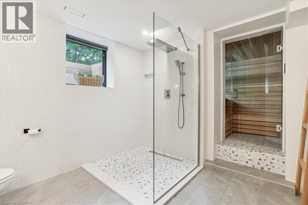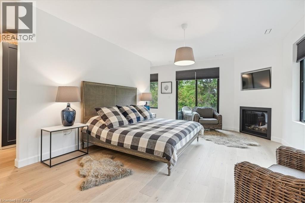 Modern prairie-style architecture in the heart of historic Ancaster. This recently completed two-storey custom house, features 5 bedrooms, 5+1 bathrooms with heated floors, a luxurious primary suite with a walk-through closet, and a main floor guest/in-law suite. Perfect for any culinary enthusiast, the gourmet kitchen includes a spacious waterfall quartz island, high-end appliances, two dishwashers, and a butler's pantry. This contemporary property offers two laundry rooms, three gas fireplaces, a cedar sauna, a heated salt water 32'x16' rectangular pool, and professionally designed gardens backing on Mansfield Park. There are integrated ceiling speakers, alarm system, security cameras, and whole house Cat6 wired network. Electrolux wine cooler in butler's pantry is a convenient luxury, as well as central vacuum, towel warmers and heated floors in all bathrooms. Large expanses of glass and an open floor plan allow for enjoyable circulation and a tranquil connection to nature throughout the house. Walking distance to restaurants, arts centre, scenic Ancaster Mill, Dundas Valley conservation area, and hiking trails, renowned Hamilton Golf and Country Club, all-season tennis courts, library, shopping, schools, and other amenities. Close proximity to McMaster University and major highways. (id:64974)