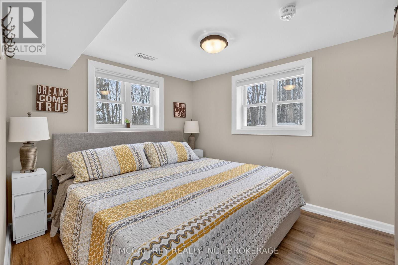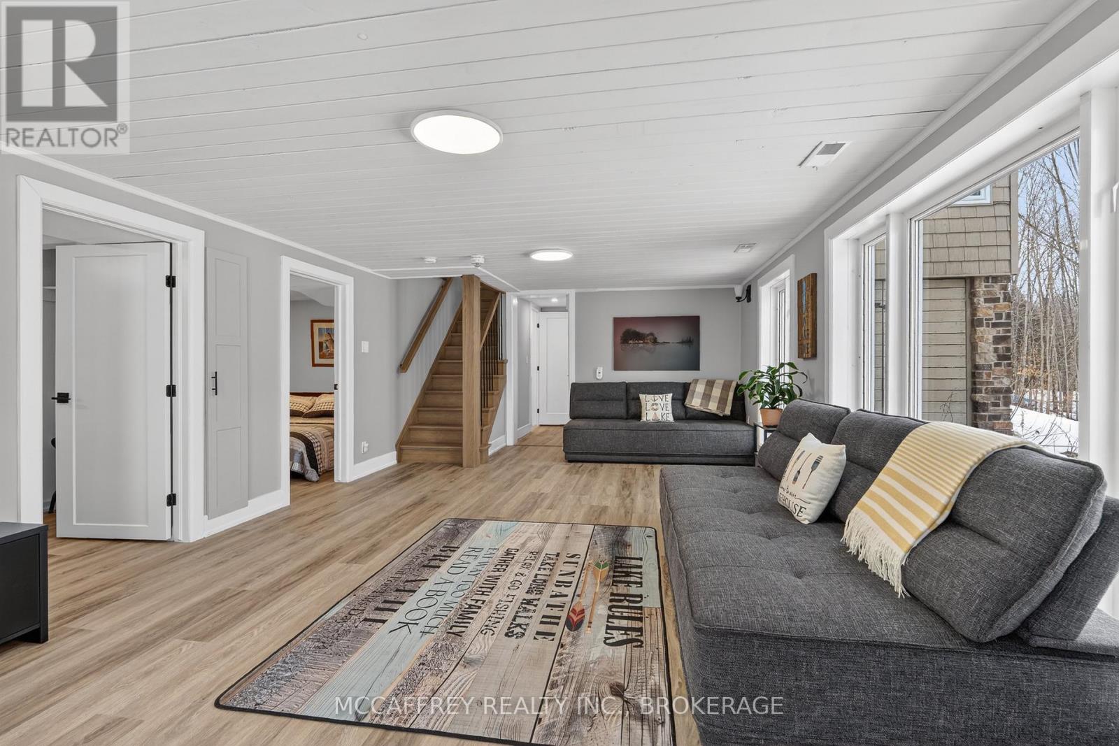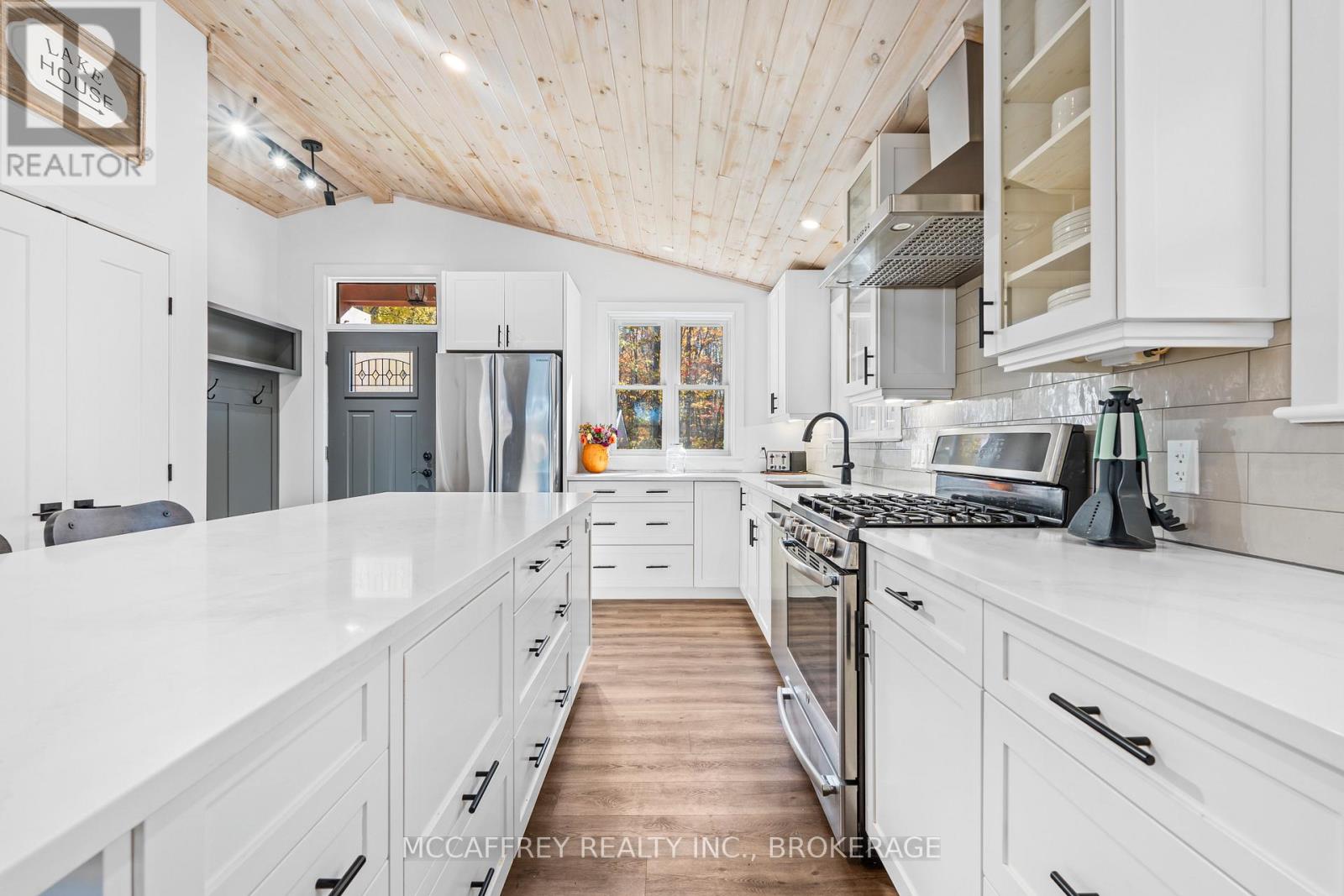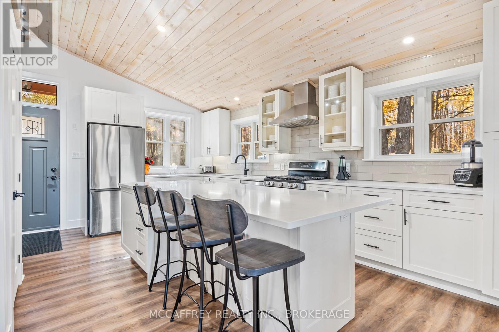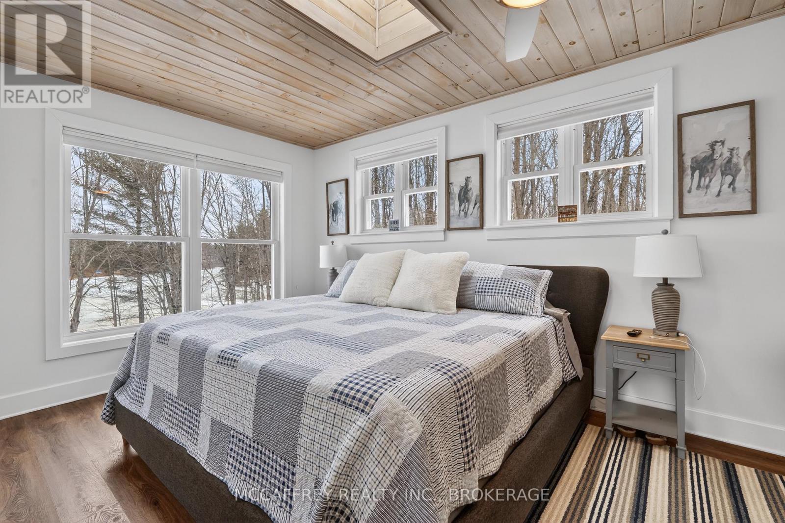 Welcome to your own slice of waterfront paradise on beautiful Elbow Lake. This beautifully updated bungalow sits on just over 140 feet of pristine shoreline, offering peaceful surroundings, mature trees, and stunning water views from nearly every room. Step inside to a gorgeous, fully updated kitchen featuring Quartz countertops, a large island, and ample cupboard space-perfect for entertaining or everyday living. The kitchen flows seamlessly into the spacious three-season sunroom, wrapped in windows that showcase breathtaking views of the lake and filled with natural light. From here, step out onto the deck overlooking the water, an ideal spot for morning coffee or evening sunsets. The main level also offers convenient main floor laundry, a 4-piece bathroom, and comfortable dining and living spaces designed to capture the beauty of the waterfront setting. The primary bedroom is a peaceful retreat, complete with a walk-in closet and private 3-piece ensuite. The fully finished walk-out basement expands the living space with two additional bedrooms, a 2-piece bathroom, and a generous utility room with plenty of storage. Patio doors lead directly outside, making it easy to enjoy the lakefront lifestyle. Outdoors, the property is framed by large mature trees that provide privacy and natural beauty. Enjoy clean, deep water from the brand new dock, perfect for swimming, boating, or simply relaxing by the shore. A convenient bunkie offers additional space for guests, making weekend gatherings and summer visits effortless. Whether you're looking for a year-round home or the perfect waterfront getaway, this exceptional property delivers the ultimate Elbow Lake lifestyle. (id:64974)
