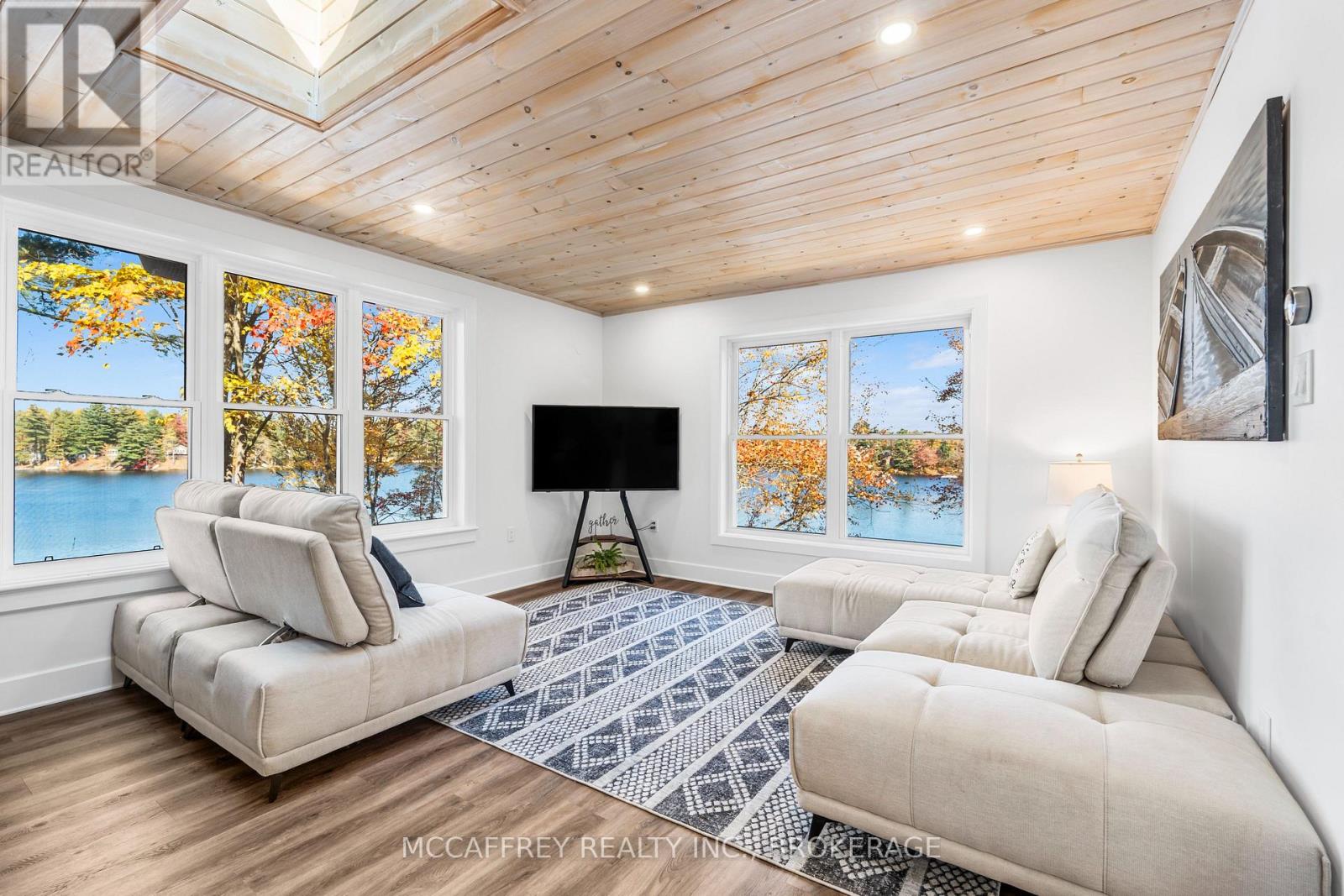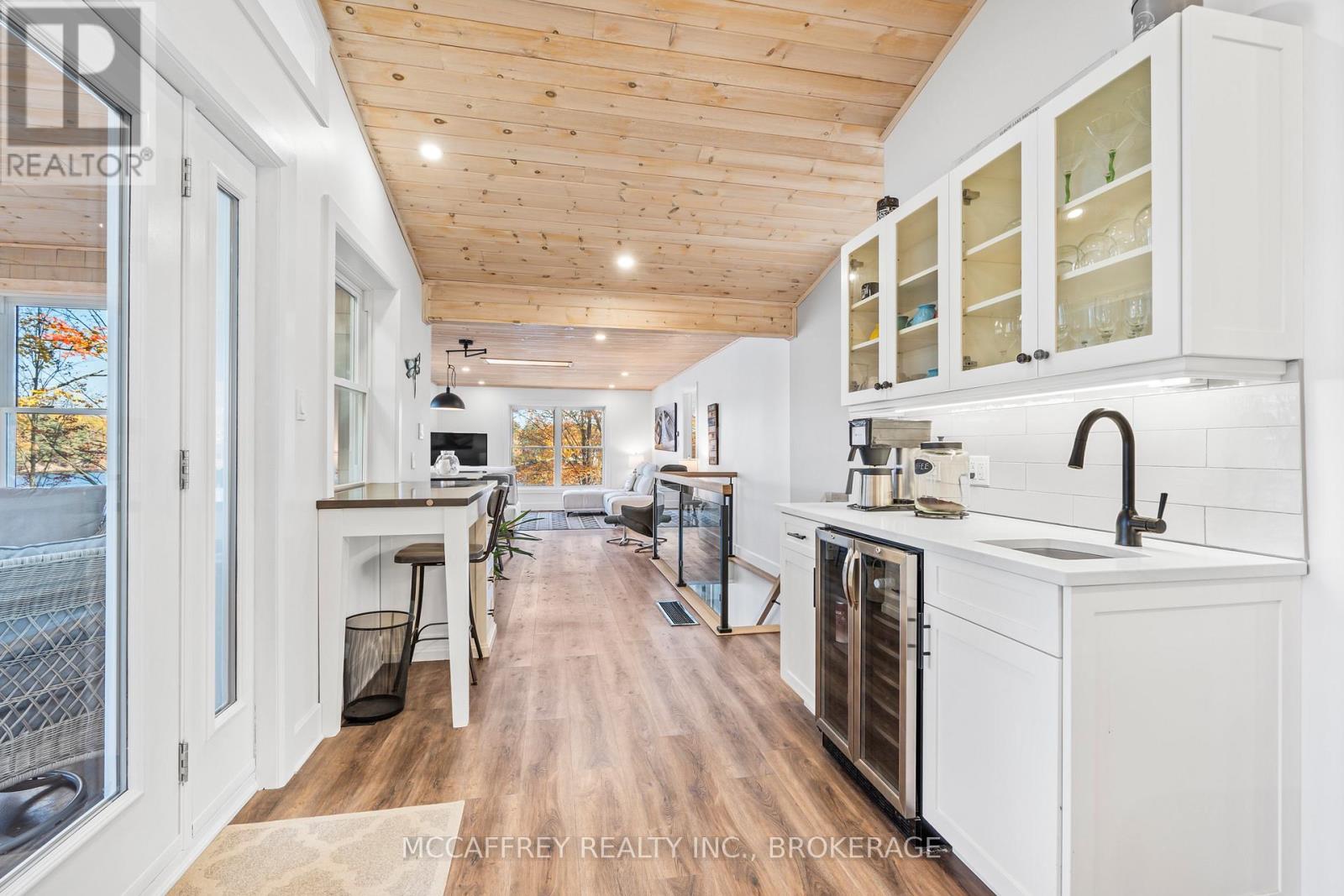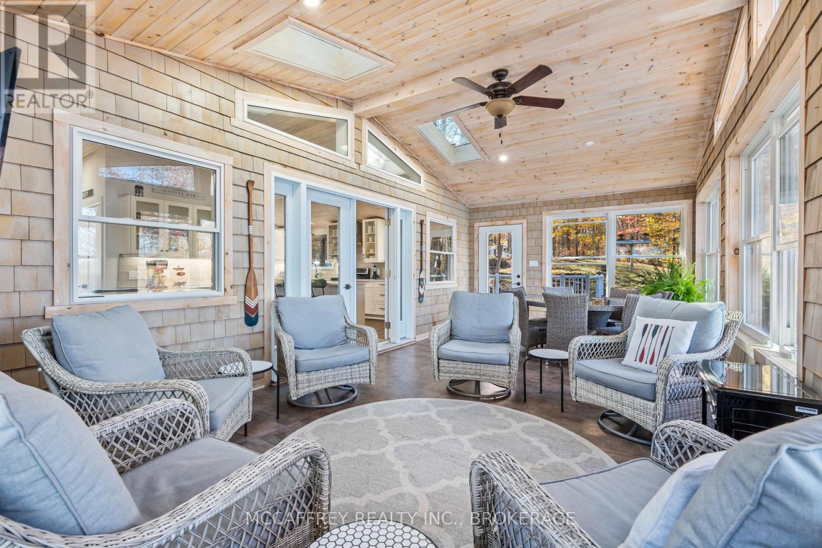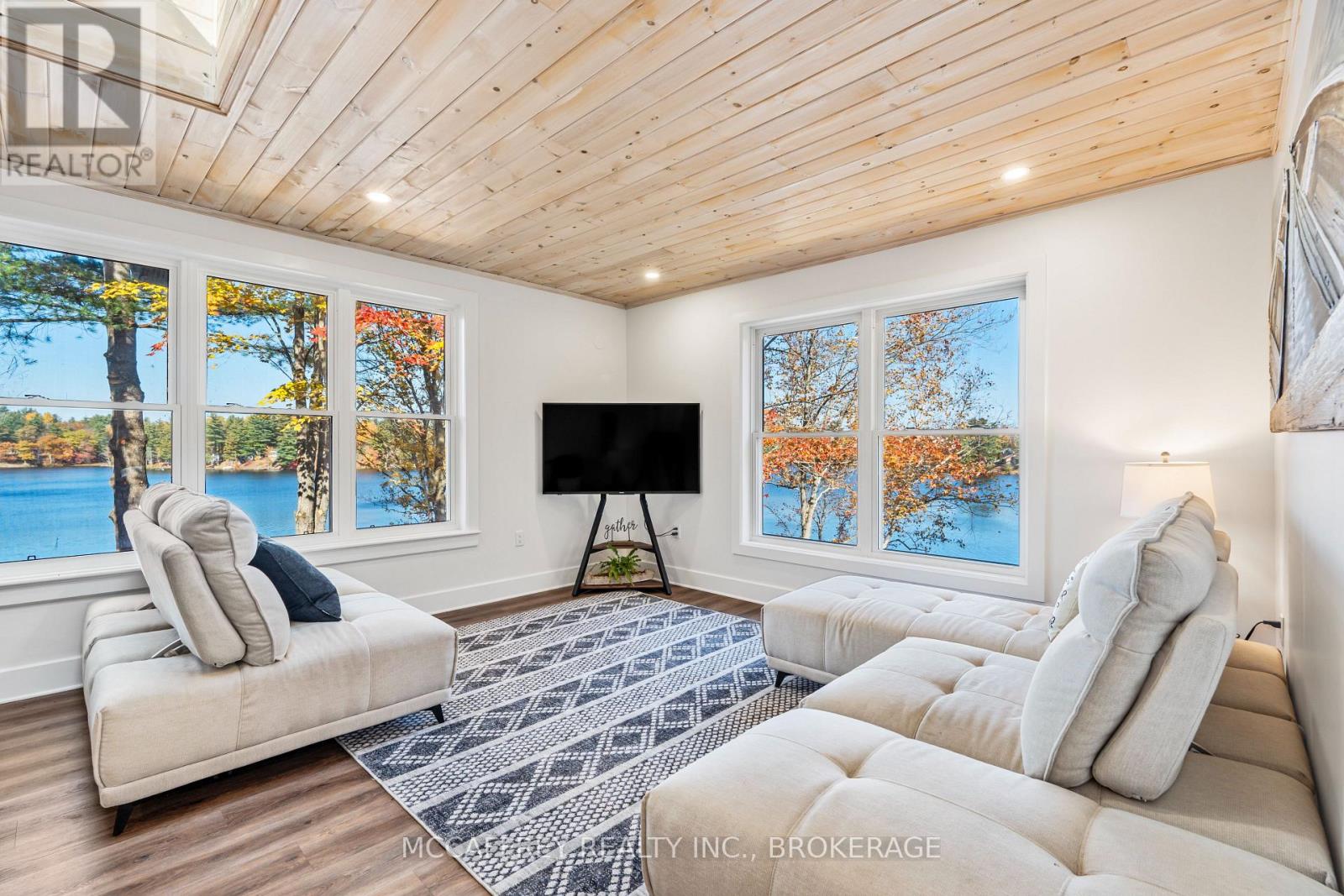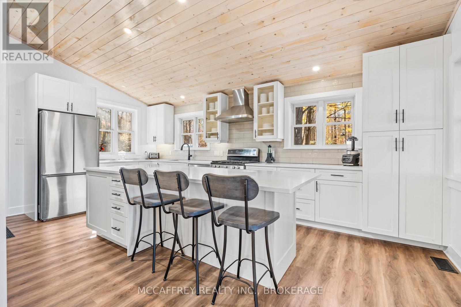 Welcome to your own slice of waterfront paradise on beautiful Elbow Lake. This beautifully updated bungalow sits on just over 140 feet of pristine shoreline, offering peaceful surroundings, mature trees, and stunning water views from nearly every room. Step inside to a gorgeous, fully updated kitchen featuring Quartz countertops, a large island, and ample cupboard space-perfect for entertaining or everyday living. The kitchen flows seamlessly into the spacious three-season sunroom, wrapped in windows that showcase breathtaking views of the lake and filled with natural light. From here, step out onto the deck overlooking the water, an ideal spot for morning coffee or evening sunsets. The main level also offers convenient main floor laundry, a 4-piece bathroom, and comfortable dining and living spaces designed to capture the beauty of the waterfront setting. The primary bedroom is a peaceful retreat, complete with a walk-in closet and private 3-piece ensuite. The fully finished walk-out basement expands the living space with two additional bedrooms, a 2-piece bathroom, and a generous utility room with plenty of storage. Patio doors lead directly outside, making it easy to enjoy the lakefront lifestyle. Outdoors, the property is framed by large mature trees that provide privacy and natural beauty. Enjoy clean, deep water from the brand new dock, perfect for swimming, boating, or simply relaxing by the shore. A convenient bunkie offers additional space for guests, making weekend gatherings and summer visits effortless. Whether you're looking for a year-round home or the perfect waterfront getaway, this exceptional property delivers the ultimate Elbow Lake lifestyle. (id:64974)