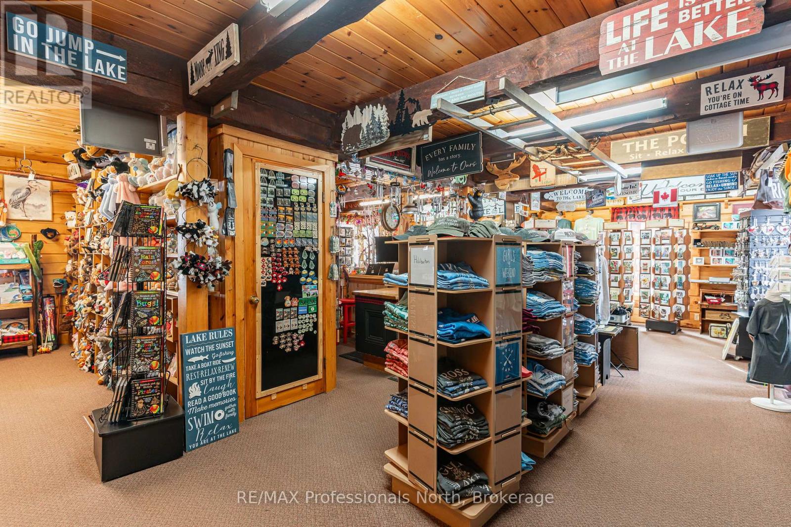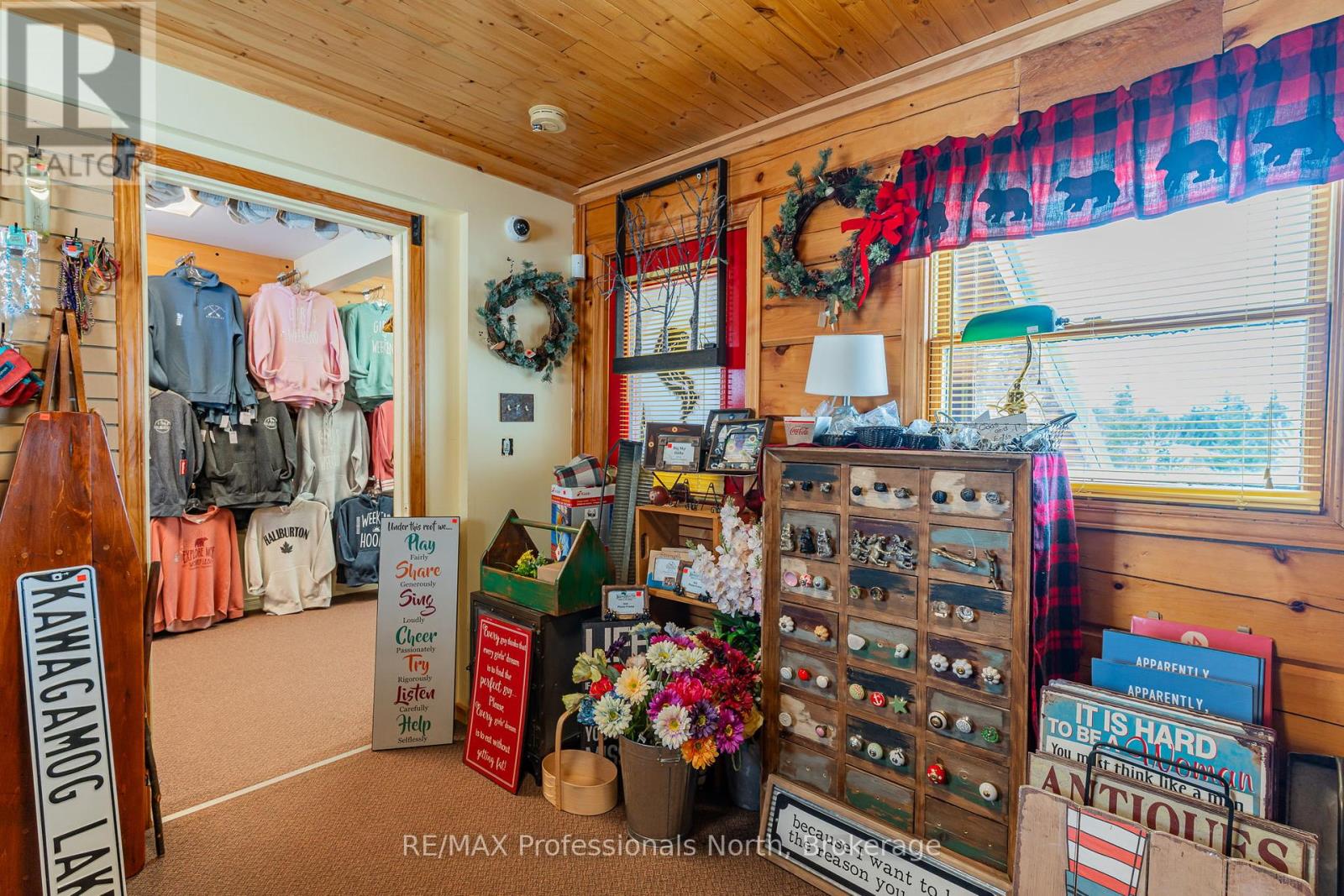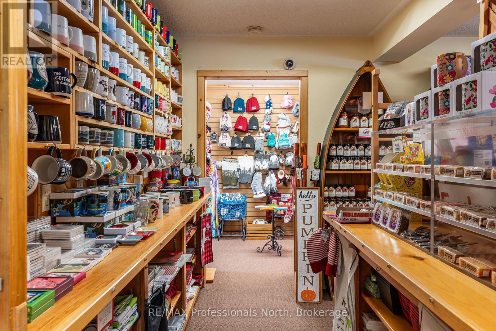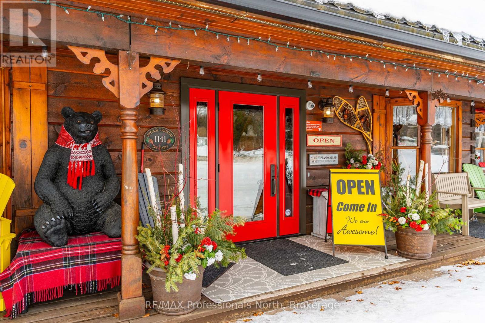 Let your imagination run wild with this iconic building set in the heart of West Guilford - this is the perfect location for your dream business! Visitors and locals alike know this special building with excellent roadside exposure. Zoned CH (Commercial Highway), this property offers a myriad of uses and provides high visibility on a main artery through cottage country. Just a few suggestions for this versatile property - Restaurant, Marine Sales, Landscaping, and more. A beautiful quality log building offers 5,520 sq. ft. split over 3 levels. The main level is currently used as a store with a large living area upstairs that provides 2 bedrooms, full kitchen/eating room, washroom, living area, walkout to a deck, sunroom, additional office or entertainment space, and more. The lower level provides 1,758 sq. ft. of undeveloped space with a walkout to the back parking lot for deliveries. The building has been extremely well maintained with a newer metal roof, a great deck out the back (perfect for that Cafe or Restaurant), full security system, and so much more. A secondary driveway behind the building has a storage area, and gives parking for staff and room for big deliveries. All of this sits on an expansive 1.23 acre lot that is lovingly manicured and offers expansion options. Driving through West Guilford, you cannot miss it, and neither can the thousands of cottagers heading to the cottage and local residents! (id:64974)