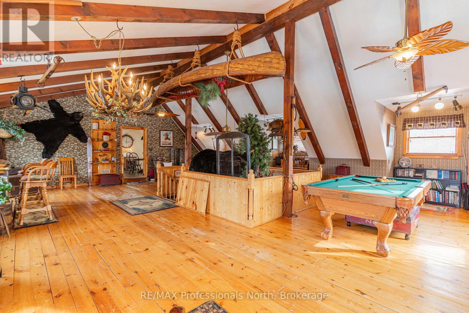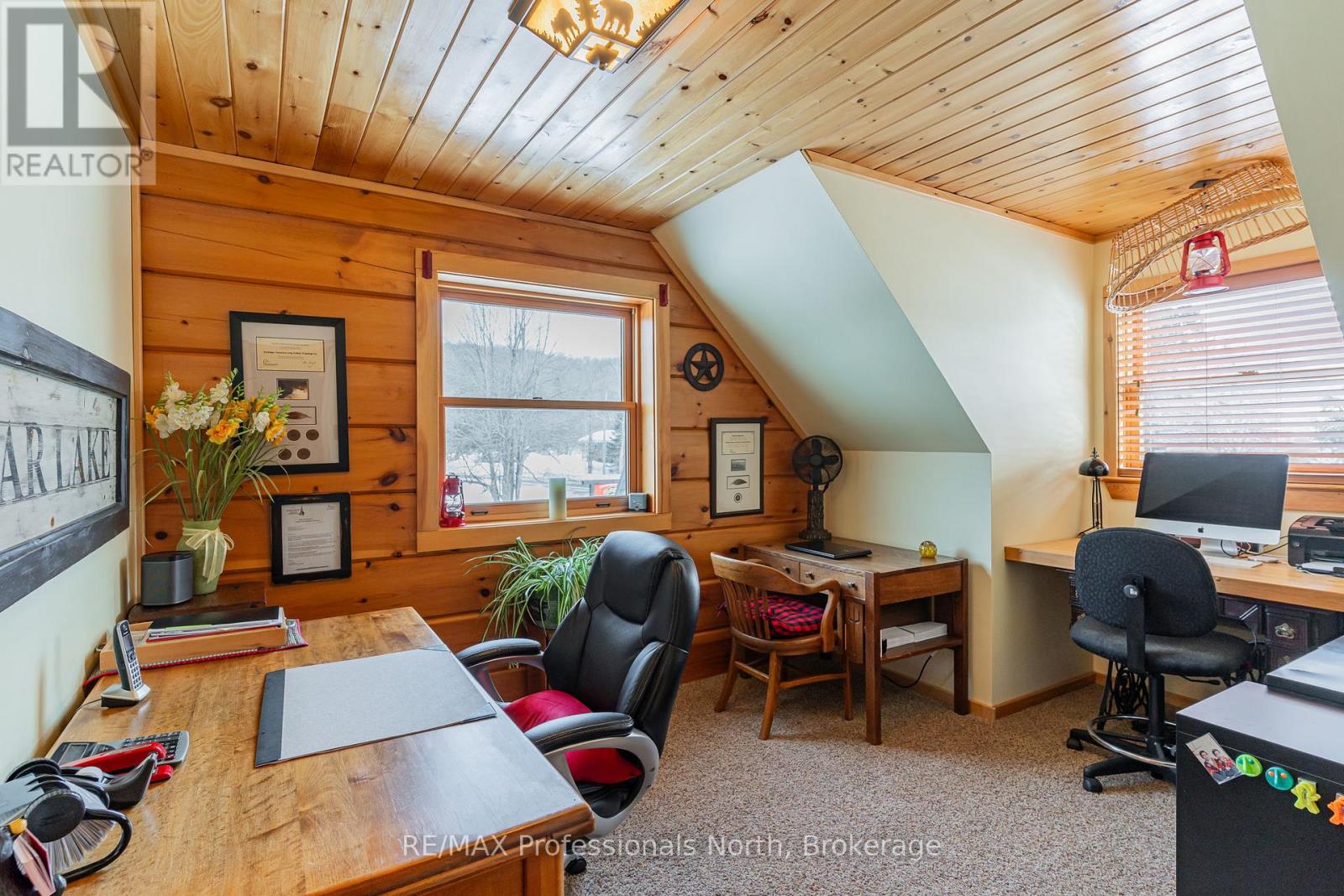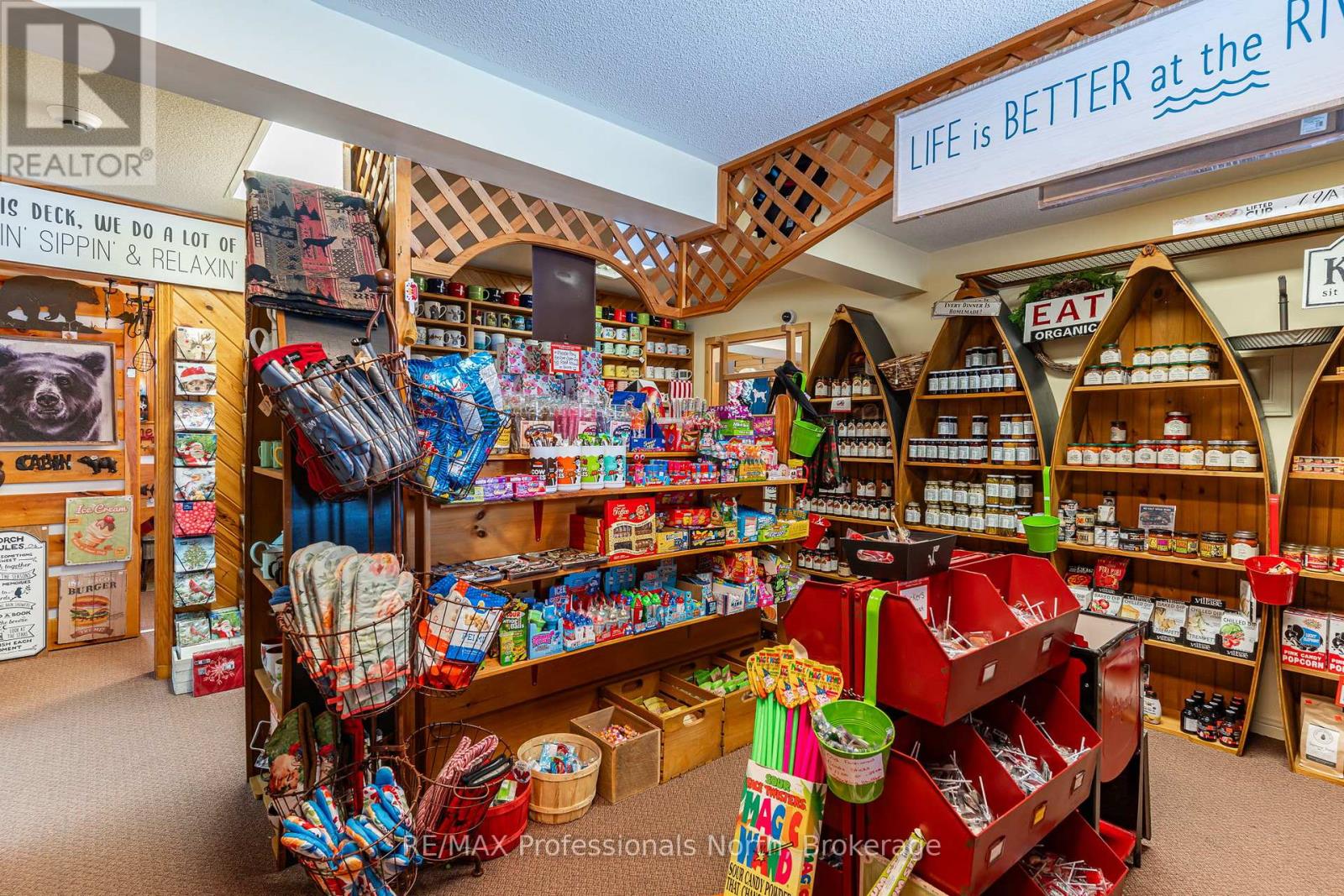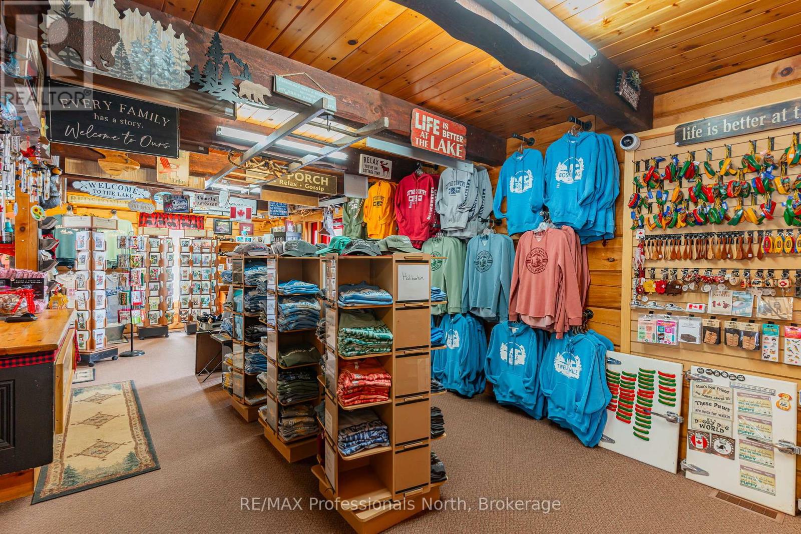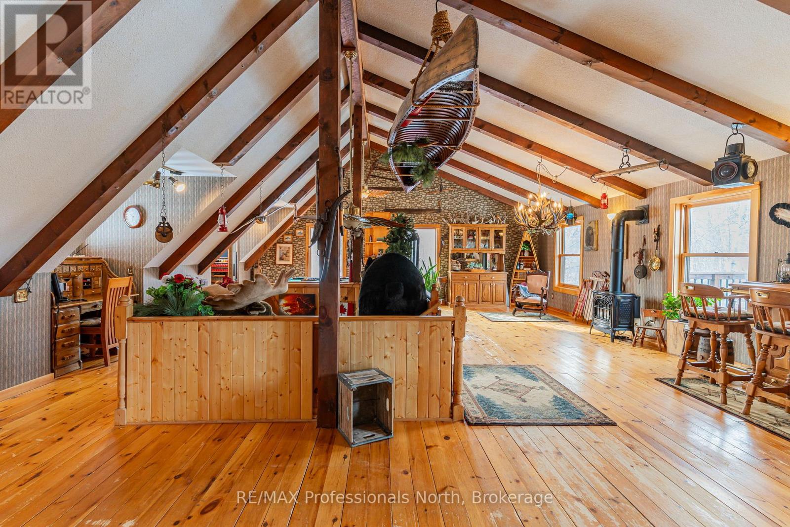 Let your imagination run wild with this iconic building set in the heart of West Guilford - this is the perfect location for your dream business! Visitors and locals alike know this special building with excellent roadside exposure. Zoned CH (Commercial Highway), this property offers a myriad of uses and provides high visibility on a main artery through cottage country. Just a few suggestions for this versatile property - Restaurant, Marine Sales, Landscaping, and more. A beautiful quality log building offers 5,520 sq. ft. split over 3 levels. The main level is currently used as a store with a large living area upstairs that provides 2 bedrooms, full kitchen/eating room, washroom, living area, walkout to a deck, sunroom, additional office or entertainment space, and more. The lower level provides 1,758 sq. ft. of undeveloped space with a walkout to the back parking lot for deliveries. The building has been extremely well maintained with a newer metal roof, a great deck out the back (perfect for that Cafe or Restaurant), full security system, and so much more. A secondary driveway behind the building has a storage area, and gives parking for staff and room for big deliveries. All of this sits on an expansive 1.23 acre lot that is lovingly manicured and offers expansion options. Driving through West Guilford, you cannot miss it, and neither can the thousands of cottagers heading to the cottage and local residents! (id:64974)