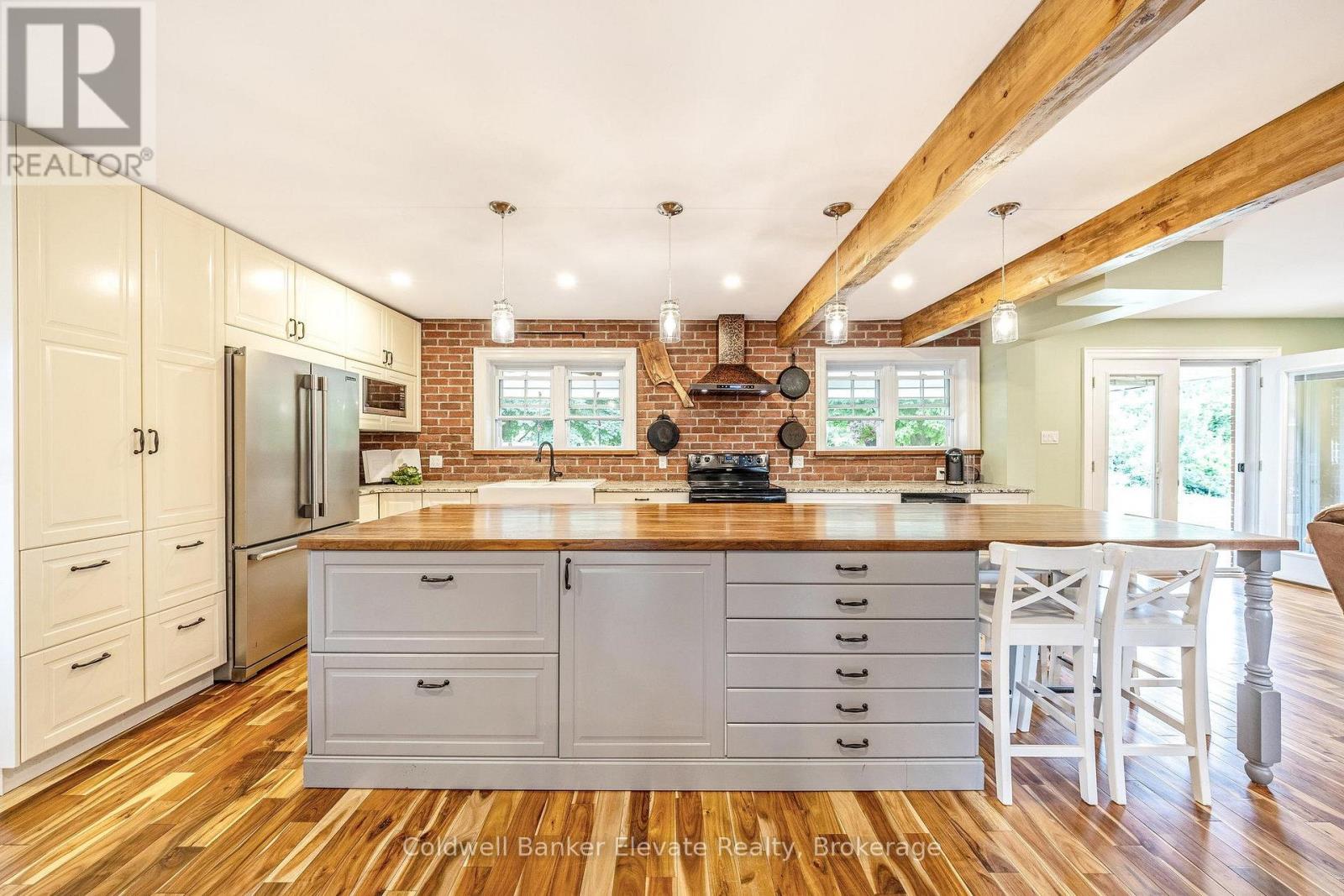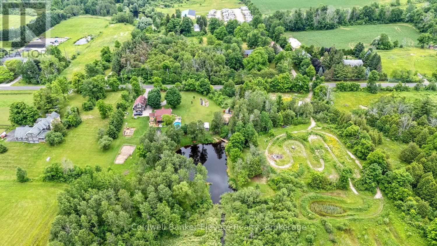 Enjoy a life less ordinary at this storybook Victorian replica home, set on over 5 picturesque acres in the heart of Campbellville. With its charming brick and board-and-batten exterior, this inviting country property offers a beautiful setting for family living, homesteading, hobby farming, or a home-based business, all surrounded by nature and open space. Outbuildings add exceptional versatility, including a 23 x 40 ft detached garage with oversized doors and an unfinished loft, as well as a 40 x 17 ft workshop featuring a roll-up door for easy equipment access and a French door walkout, offering flexible space for projects, storage, or creative pursuits. The property showcases a blend of open field and mature woods, with two chicken coops, raised garden beds planted with perennial asparagus and berries, and a second driveway leading to a large open area ideal for future use or expansion. At the centre of it all, a spring-fed pond connected to Bronte Creek creates a peaceful backdrop for everyday living, complete with a floating dock and a powered tree fort, offering a unique outdoor retreat. Inside, the open-concept kitchen, dining, and living space is filled with natural light and farmhouse-inspired charm, creating a warm and welcoming atmosphere. French doors at both the front and back lead to a covered front porch and a screened-in back porch with sun deck, extending the living space outdoors and offering multiple areas to relax and unwind. The upper level offers four bedrooms, including a primary with a 4-piece semi-ensuite. The finished walkout basement adds a fifth bedroom, 3-piece bathroom, wet bar, and wood-burning fireplace, providing additional living space for guests, extended family, or everyday flexibility. An above-ground pool and the surrounding natural landscape complete this private retreat, all just minutes to highways, schools, and local amenities, offering the perfect balance of country living and convenience. (id:64974)