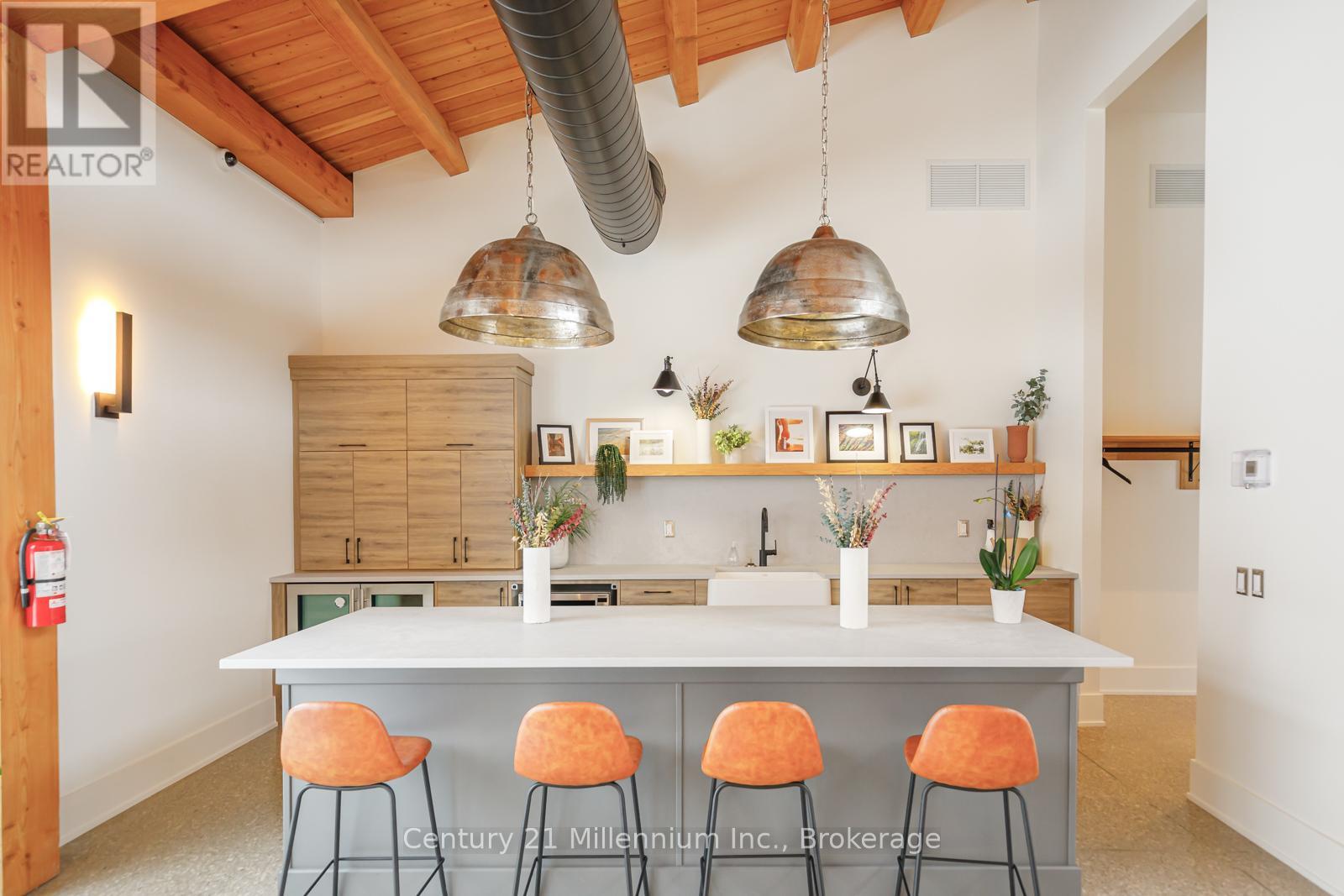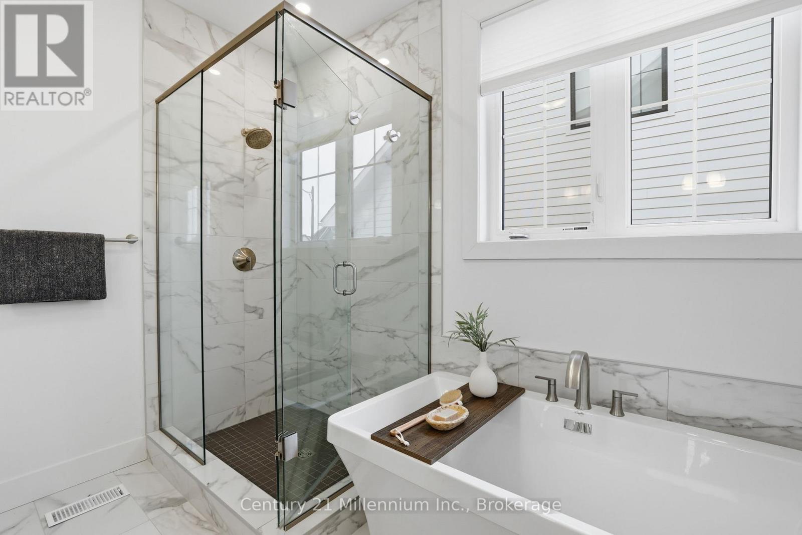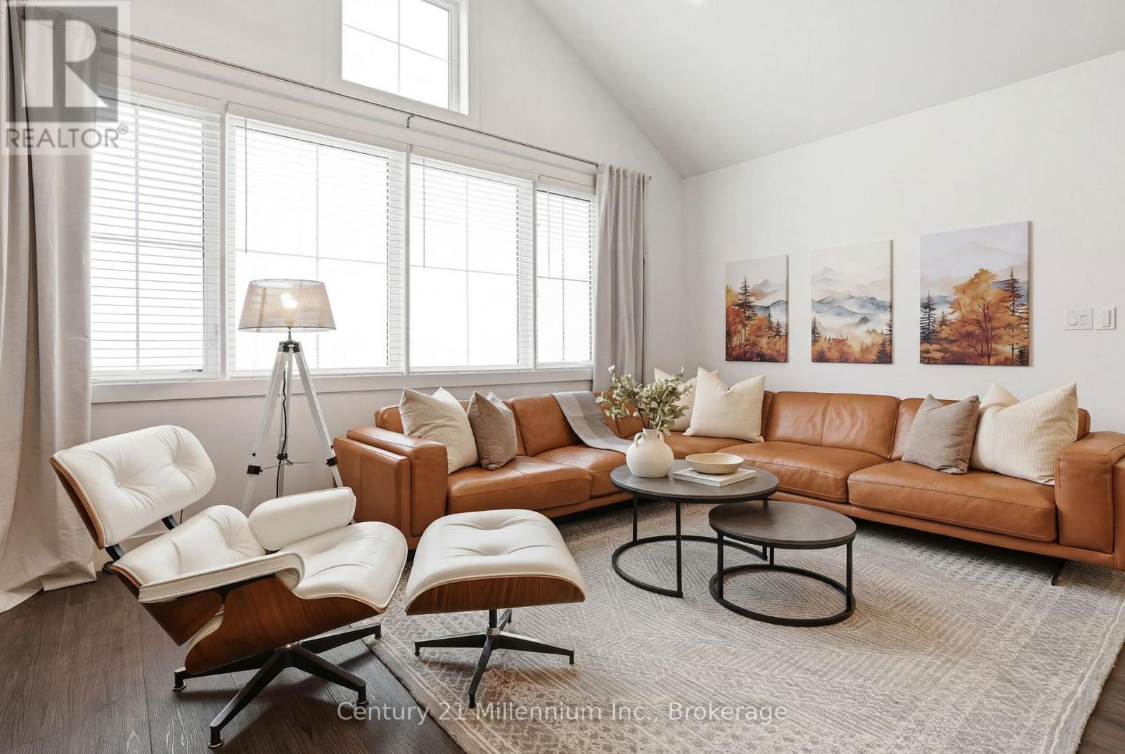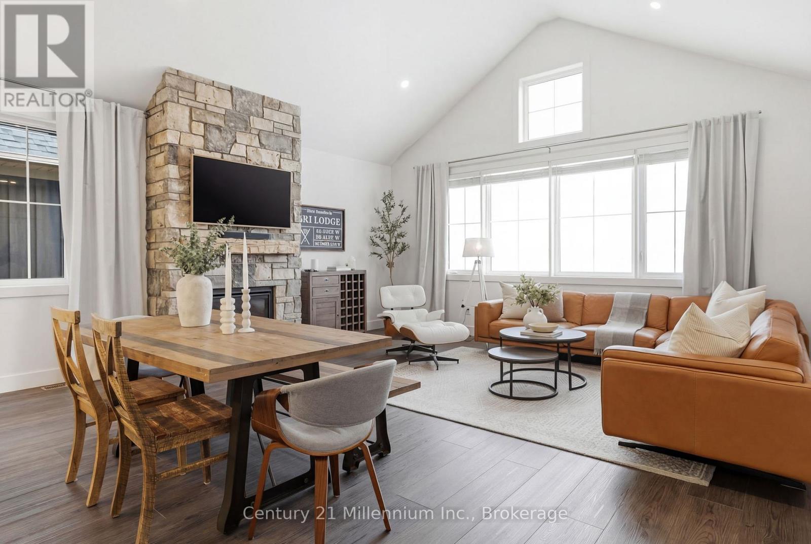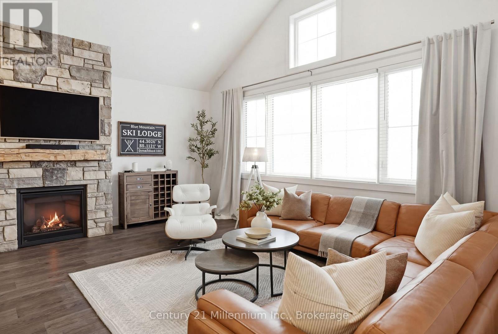 Thoughtfully upgraded and beautifully appointed, this Windfall bungaloft sets a new standard for modern mountain living. Elevated in every detail, this 6-bedroom, 4-bath Beausoleil model is a masterclass in refined living, where every finish has been carefully considered. Anchored by a soaring great room featuring a dramatic floor-to-ceiling stone fireplace, every space invites connection, and every detail supports effortless entertaining. The chef-inspired kitchen is complete with a premium gas range, oversized breakfast bar, upgraded cabinetry, LED valance lighting, pot lights and stone counters.The main-floor primary suite offers a private, spa-inspired retreat complete with soaker tub, double sinks and heated floors. A versatile den or second bedroom and main-floor laundry add convenience. Upstairs, two well-appointed bedrooms and a full bath provide ideal separation for family or guests. The main floor and upper level feature luxury vinyl plank flooring that blends timeless design with contemporary comfort. The 'open to below' plan leads to a fully finished lower level with expansive windows, a second fireplace, a generous recreation space, two additional bedrooms, and a full bath with heated floors. Outdoors, the detached garage enhances both function and ease of living. As a Windfall resident, enjoy exclusive access to The Shed - a private, year-round amenity centre with a heated pool, hot tub, sauna, fitness studio, and clubhouse. This is a rare opportunity to secure a sophisticated four-season lifestyle in one of the region's most sought-after communities. Golf in the summer. Trails just outside your door. A visit to Scandinave Spa Blue Mountain when you need to fully disconnect. A quiet morning by Georgian Bay or peaceful walk on the trails remind you why you made the move. This isn't about slowing down. It's about living with intention - where success isn't just something you work for, but something you experience every day. (id:64974)